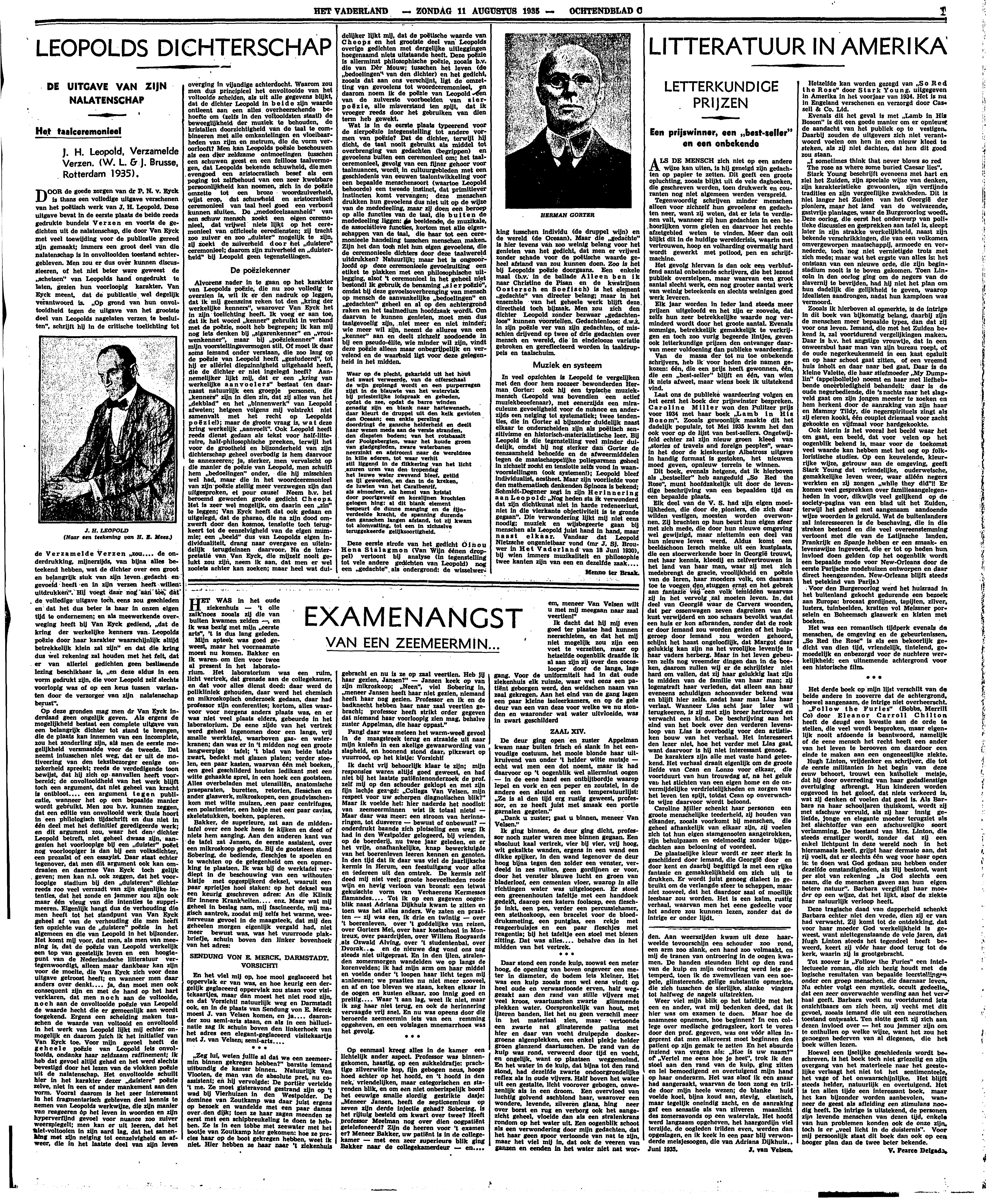 DOOR de goede zorgen van dr P.N.v. Eyck is thans een volledige uitgave verschenen van het poëtisch werk van J.H. Leopold. Deze uitgave bevat in de eerste plaats de beide reeds gedrukte bundels Verzen en voorts de gedichten uit de nalatenschap, die door Van Eyck met veel toewijding voor de publicatie gereed zijn gemaakt; immers een groot deel van die nalatenschap is in onvoltooiden toestand achtergebleven. Men zou er dus over kunnen discussieeren, of het niet beter ware geweest de ‘schetsen’ van Leopolds hand ongedrukt te laten, gezien hun voorloopig karakter. Van Eyck meent, dat de publicatie wel degelijk verantwoord is. ‘Op grond van hun onvoltooidheid tegen de uitgave van het grootste deel van Leopolds nagelaten verzen te besluiten’, schrijft hij in de critische toelichting tot de Verzamelde Verzen ‘zou.... de onderdrukking, mijnerzijds, van bijna alles beteekend hebben, wat de dichter over een groot en belangrijk stuk van zijn leven gedacht en gevoeld heeft en in zijn verzen heeft willen uitdrukken’. Hij voegt daar nog aan toe, dat de volledige uitgave toch eens zou geschieden en dat het dus beter is haar in onzen eigen tijd te ondernemen; en als meewerkende overweging heeft bij Van Eyck gediend, ‘dat de kring der werkelijke kenners van Leopolds poëzie door haar karakter waarschijnlijk altijd betrekkelijk klein zal zijn’ en dat die kring dus wel rekening zal houden met het feit, dat er van allerlei gedichten geen beslissende lezing beschikbaar is, ‘en deze aldus in een vorm gedrukt zijn, die voor Leopold zelf slechts voorlopig was of op een keus tussen varianten door de verzorger van zijn nalatenschap berust’.