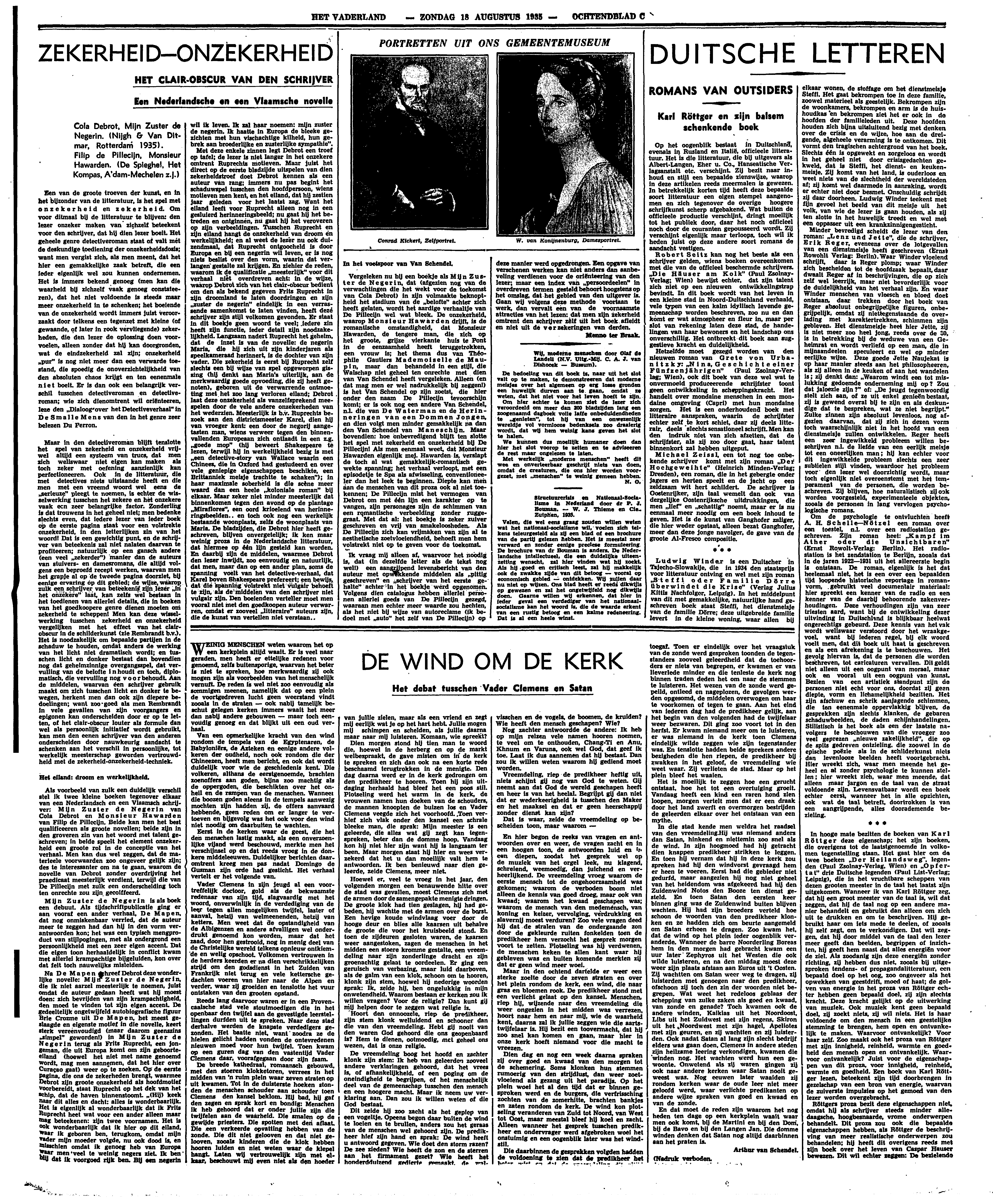 Vergeleken nu bij een boekje als Mijn Zuster de Negerin, dat (afgezien nog van de verwachtingen die het wekt voor de toekomst van Cola Debrot) in zijn volmaakte beknoptheid het stadium van de ‘belofte’ achter zich heeft gelaten, wordt het aardige verhaaltje van De Pillecijn wel wat bleek. De onzekerheid, waarop Monsieur Hawarden drijft, is de romantische omstandigheid, dat Monsieur Hawarden, de tengere man, die zich op het groote, grijze vierkante huis te Pont in de eenzaamheid heeft teruggetrokken, een vrouw is; het thema dus van Théophile Gautiers Mademoiselle de Maupin, maar dan behandeld in een stijl, die Walschap niet geheel ten onrechte met dien van Van Schendel heeft vergeleken. Alleen (en dat mag men er wel nadrukkelijk bij zeggen!) is het Van Schendel op zijn zoetst, die hier onder den naam De Pillecijn tevoorschijn komt; er is ook nog een andere Van Schendel, n.l. die van De Waterman en de Herinneringen van een Dommen Jongen, en dien volgt men minder gemakkelijk na dan den Van Schendel van Maneschijn. Maar bovendien: hoe onbevredigend blijft ten slotte het spel met zekerheid en onzekerheid bij De Pillecijn! Als men eenmaal weet, dat Monsieur Hawarden eigenlijk mej. Hawarden is, verslapt de toch al wat gemakkelijk-romantisch gewekte spanning; het verhaal verloopt, met een episodetje te Spa als afwisseling, conventioneeler dan het leek te beginnen. Diepte kan men aan de menschen van dit proza ook al niet toekennen; De Pillecijn mist het vermogen van Debrot om met één lijn een karakter op te vangen, zijn personages zijn de schimmen van een romantische verbeelding zonder ruggegraat. Met dat al: het boekje is zeker zuiver geschreven en vrij van smakeloosheden. Als De Pillecijn zich kan vrijmaken van zijn al te aesthetische zoetvloeiendheid, behoeft men hem volstrekt niet op te geven voor de toekomst.