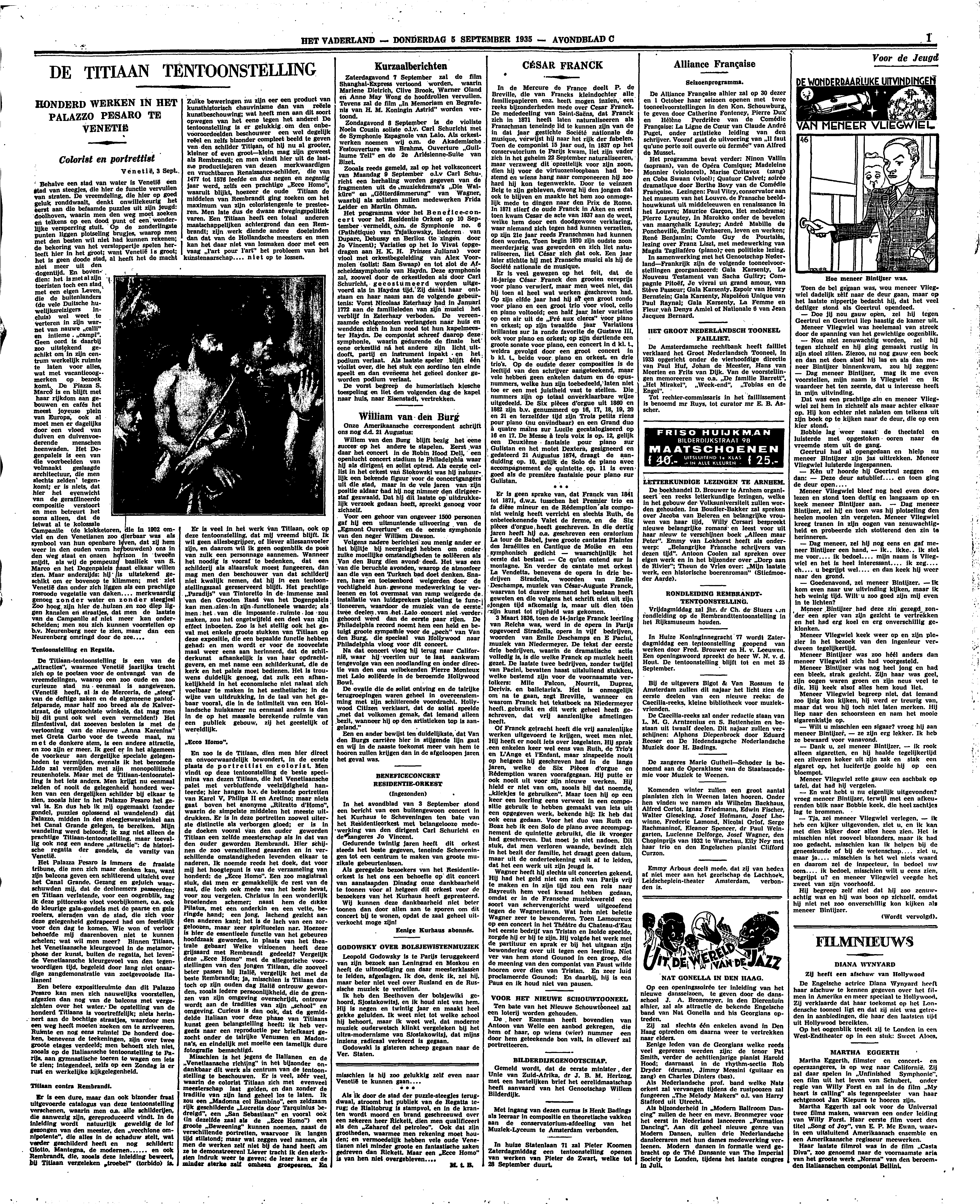 De Titiaan-tentoonstelling is een van de ‘attracties’, waarmee Venetië jaarlijks tracht zich op te poetsen voor de ontvangst van de vreemdelingen, waarop een zoo oude en zoo curieuze stad nu eenmaal is aangewezen. (Venetië heeft, al is de Merceria, de ‘steeg’ van de deftige zaken en de algemeene pantoffelparade, maar half zoo breed als de Kalverstraat, de uitgezochtste winkels, dat mag men bij dit punt ook wel even vermelden!) Het filmfestival, dat zooeven besloten is met de vertooning van de nieuwe ‘Anna Karenina’ met Greta Garbo voor de tweede maal, nu met de donkere stem, is een andere attractie, en zoo zijn er meer. Ik geef er in het algemeen de voorkeur aan dergelijke speciale gelegenheden te vermijden, evenals ik het beroemde Lido zal vermijden met zijn monopolitische reuzenhotels. Maar met de Titiaan-tentoonstelling is het iets anders. Men krijgt nu eenmaal zelden of nooit de gelegenheid honderd werken van een dergelijken schilder bij elkaar te zien, zooals hier in het Palazzo Pesaro het geval is. En dus heb ik mij opgemaakt (zonder gondel, puzzles oplossend al wandelend) dat Palazzo, midden in den steegjeswarwinkel aan het Canal Grande gelegen, te bereiken. Mijn wandeling werd beloond; ik zag niet alleen de prachtige Titiaan-tentoonstelling, maar toevallig ook nog een andere ‘attractie’: de historische regatta der gondels, de varsity van Venetië.