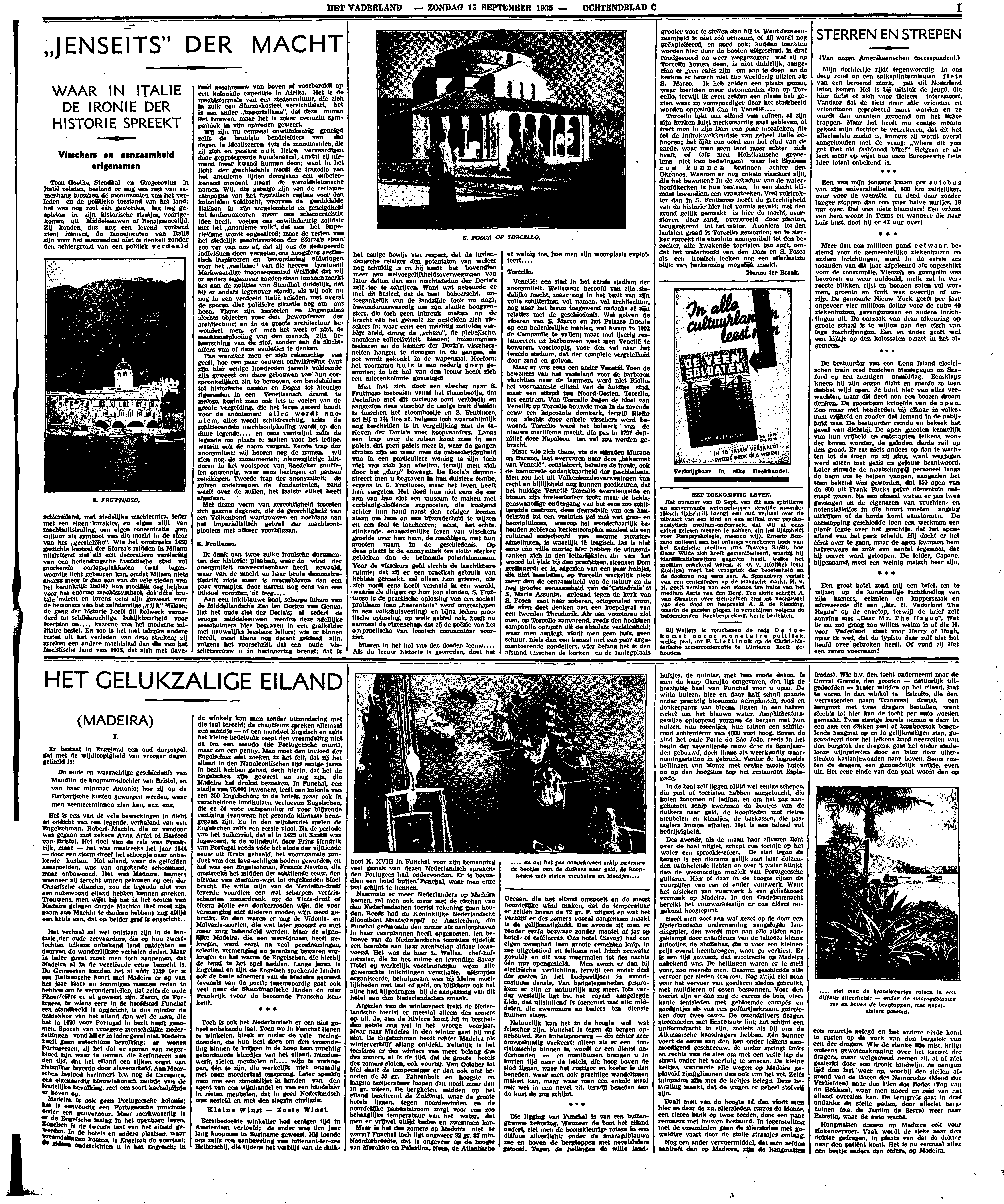 Aan een inktblauwe baai, scherpe inham van de Middellandsche Zee ten Oosten van Genua, ligt het oude slot der Doria's; al sedert de vroege middeleeuwen werden deze adellijke zeeschuimers hier begraven in een grafkelder met nauwelijks leesbare letters; wie er binnen treedt, moet thans nog decent gekleed zijn, volgens het voorschrift, dat een oude visschersvrouw u in herinnering brengt; dat is het eenige bewijs van respect, dat de hedendaagsche reiziger den potentaten van weleer nog schuldig is en hij heeft het bovendien meer aan welvoegelijkheidsoverwegingen van later datum dan aan machtsdaden der Doria's zelf toe te schrijven. Want wat gebeurde er met dit kasteel, dat de baai beheerscht, ontoegankelijk van de landzijde (ook nu nog), bewonderenswaardig om zijn slanke boogvensters, die toch geen inbreuk maken op de kracht van het geheel? Er nestelden zich visschers in; waar eens een machtig individu verblijf hield, drong de ‘schare’, de plebejische, anonieme collectiviteit binnen; huisnummers teekenen nu de kamers der Doria's, visschersnetten hangen te droegen in de gangen, de pot wordt gekookt in de wapenzaal. Kortom: het voorname huis is een nederig dorp geworden; in het hol van den leeuw heeft zich een mierenkolonie gevestigd!