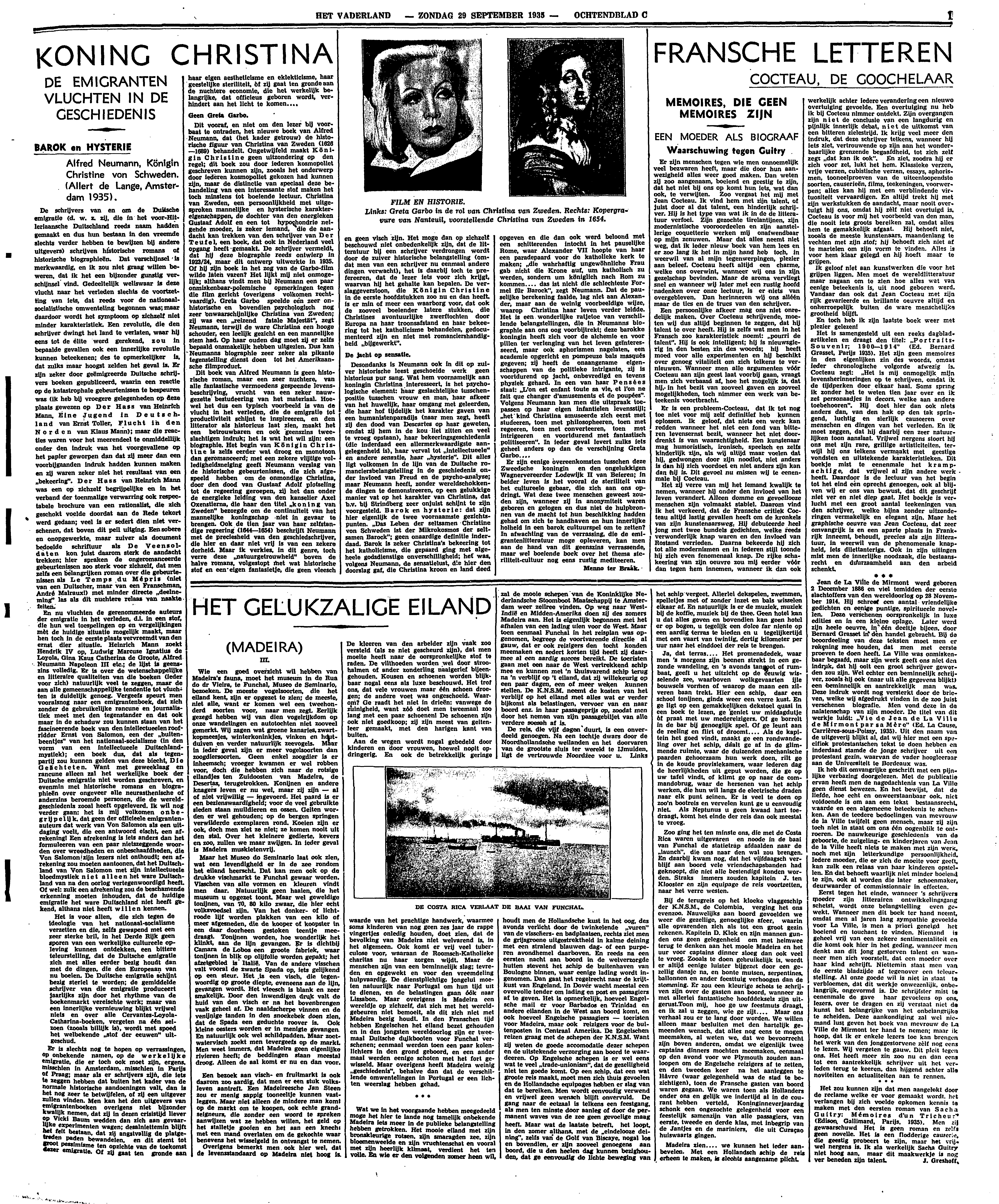 Dit vooraf, en niet om den lezer bij voorbaat te ontraden, het nieuwe boek van Alfred Neumann, dat (het kader getrouw) de historische figuur van Christina van Zweden (1626-1689) behandelt. Ongetwijfeld maakt Königin Christine geen uitzondering op den regel; dit boek zou door iederen kosmopoliet geschreven kunnen zijn, zooals het onderwerp door iederen kosmopoliet gekozen had kunnen zijn, maar de distinctie van speciaal deze behandeling van een interessante stof maken het toch minstens tot boeiende lectuur. Christina van Zweden, een persoonlijkheid met uitgesproken mannelijke en hysterische karaktereigenschappen, de dochter van den energieken Gustaaf Adolf en een tot hypochondrie neigende moeder, is zeker iemand, die de aandacht kan trekken van den schrijver van Der Teufel, een boek, dat ook in Nederland veel opgang heeft gemaakt. De schrijver vermeldt, dat hij deze biographie reeds ontwierp in 1923/24, maar dit ontwerp uitwerkte in 1935. Of hij zijn boek in het zog van de Garbo-film wilde laten varen? Het lijkt mij niet onmogelijk; althans vindt men bij Neumann een paar onmiskenbaar-polemische opmerkingen tegen die film gericht (overigens volkomen rechtvaardig). Greta Garbo speelde een zeer onhistorische en bovendien psychologisch nog zeer onwaarschijnlijke Christina van Zweden; zij was een ‘reizend fatale Majestät’, zegt Neumann, terwijl de ware Christina een hooge schouder, een leelijk gezicht en een mannelijke stem had. Op haar ouden dag moet zij er zelfs bepaald onsmakelijk hebben uitgezien. Dus kan Neumanns biographie zeer zeker als pikante tegenstelling dienst doen tot het Amerikaansche filmproduct.
