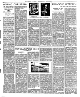 Er zijn eenige overeenkomsten tusschen deze Zweedsche koningin en den ongelukkigen Wagnervereerder Lodewijk II van Beieren; in beider leven is het vooral de steriliteit van het cultureele gebaar, die zich aan ons opdringt. Wat deze twee menschen geweest zouden zijn, wanneer zij in anonymiteit waren geboren en getogen en dus niet de hulpbronnen van de macht tot hun beschikking hadden gehad om zich te handhaven en hun innerlijke holheid in een barok cultuurspel om te zetten? In afwachting van de verrassing, die de emigrantenlitteratuur moge opleveren, kan men aan de hand van dit geenszins verrassende, maar wel boeiende boek over het thema steriliteit-cultuur nog eens rustig mediteeren.