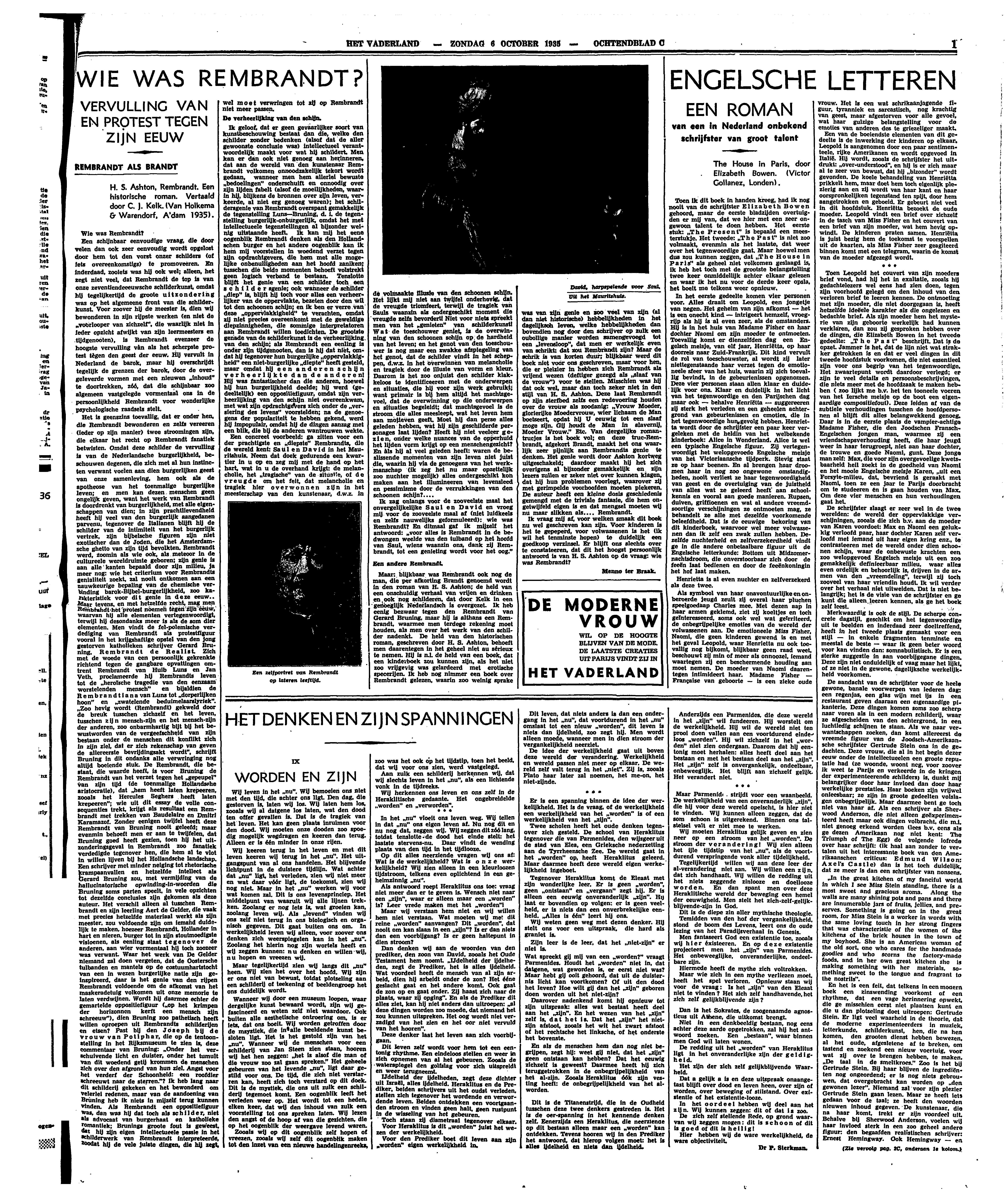 Ik zag onlangs voor de zooveelste maal het onvergelijkelijke Saul en David en vroeg mij voor de zooveelste maal af (niet luidkeels en zelfs nauwelijks geformuleerd): wie was Rembrandt? En ditmaal gaf ik mijzelf het antwoord: ‘voor alles is Rembrandt in de bedwongen weelde van den tulband op het hoofd van Saul, wiens waanzin ons, dank zij Rembrandt, tot een genieting wordt voor het oog.’
