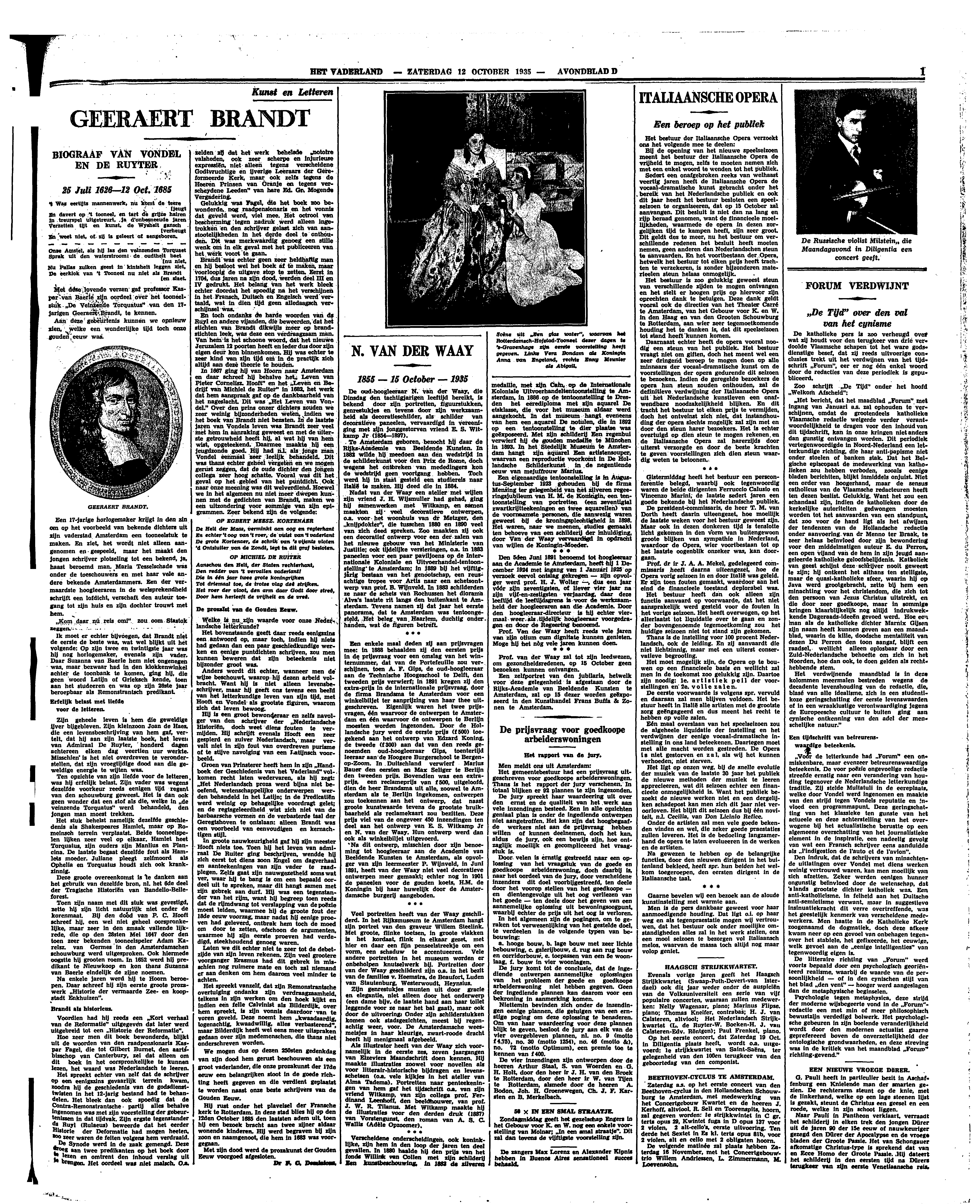 ‘Het bericht, dat het maadblad “Forum” met ingang van Januari a.s. zal ophouden te verschijnen, omdat de grootendeels katholieke Vlaamsche redactie weigerde verder verantwoordelijkheid te dragen voor den inhoud van dit tijdschrift, kan in onze kringen niet anders dan gunstig ontvangen worden. Dit periodiek vertegenwoordigde in Noord-Nederland een letterkundige richting, die haar anti-papisme niet onder stoelen of banken stak. Dat het Belgische episcopaat de medewerking van katholieken zou hebben verboden, zooals eenige bladen berichtten, blijkt inmiddels onjuist. Niet een order van hoogerhand, maar de sensus catholicus van de Vlaamsche redacteuren heeft ten dezen beslist. Gelukkig, Want het zou een schandaal zijn, indien de katholieken door de kerkelijke autoriteiten gedwongen moesten worden tot het aanvaarden van een standpunt, dat zoo voor de hand ligt als het afwijzen der tendenzen van de Hollandsche redactie onder aanvoering van dr Menno ter Braak, te zeer helaas beïnvloed door zijn bewondering voor den middelmatigen auteur E. du Perron, een open vijand van de hem in zijn jeugd aangeleerde katholieke geloofsbelijdenis. Katholiek van geest schijnt deze schrijver nooit geweest te zijn; hij ontkent het althans ten stelligste, maar de quasi-katholieke sfeer, waarin hij op Java werd grootgebracht, zette bij hem een minachting voor het christendom, die zich tot den persoon van Jezus Christus uitstrekt, en die door zeer goedkoope, maar in sommige kringen klaarblijkelijk nog altijd indrukwekkende Dageraads-ideeën gevoed werd. Hoe een man als de katholieke dichter Marnix Gijsen zijn naam heeft kunnen geven aan een maandblad, waarin de kille, doodsche mentaliteit van dezen Du Perron den toon aangaf, blijft een raadsel, wellicht alleen oplosbaar door een Zuid-Nederlandsche behoefte om zich in het Noorden, hoe dan ook, te doen gelden als rechthebbende stem.