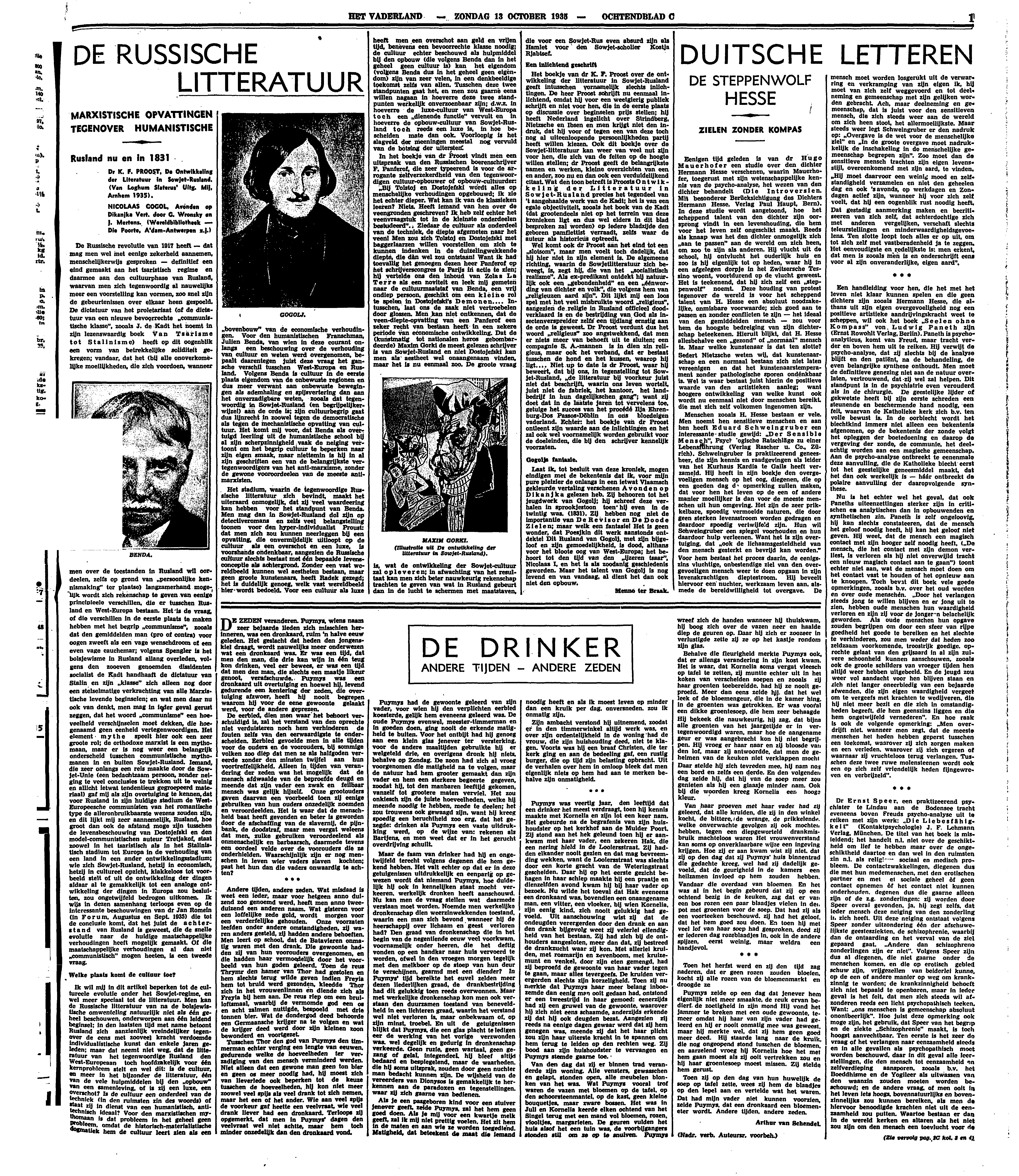 Laat ik, tot besluit van deze kroniek, mogen eindigen met de bekentenis dat ik, voor mijn pure pleizier de onlangs in een ietwat Vlaamsch gekleurde vertaling verschenen Avonden op Dikanjka gelezen heb. Zij behooren tot het jeugdwerk van Gogolj; hij schreef deze verhalen in sprookjestoon toen hij even in de twintig was, (1831). Zij hebben nog niet de importantie van De Revisor en De Doode Zielen; maar welk een fantasie! Het is geen wonder, dat Poesjkin dit werk aanstonds ontdekte! Dit Rusland van Gogolj, met zijn bijgeloof en zijn gemoedelijkheid, is dood, althans voor het bloote oog van West-Europa; het behoort tot den tijd van den ‘ijzeren tsaar’, Nicolaas I, en het is als zoodanig geschiedenis geworden. Maar het talent van Gogolj is nog levend en van vandaag, al dient het dan ook niet den opbouw.