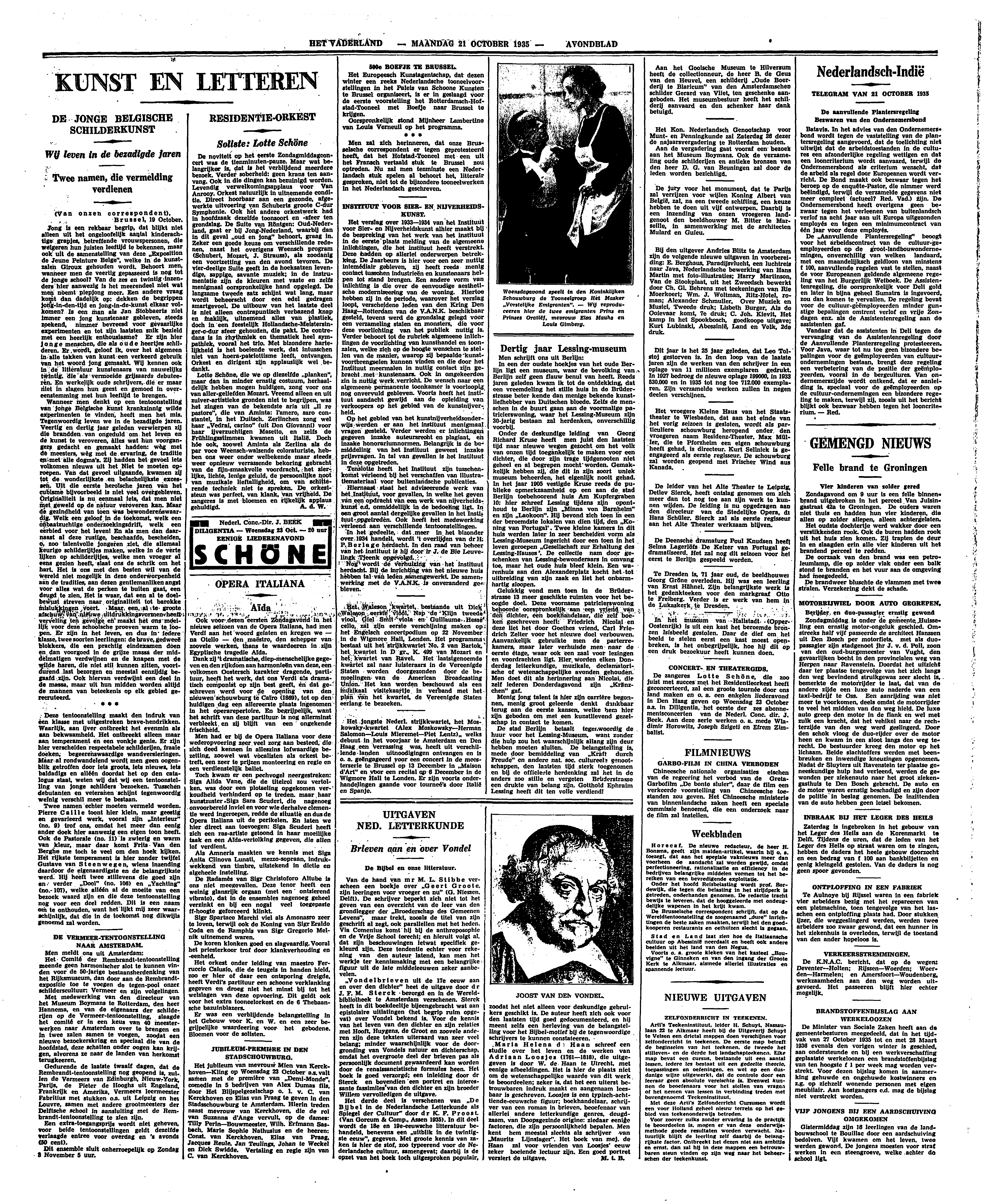 ‘Vondelbrieven uit de 17e eeuw aan en over den dichter’ heet de uitgave door dr J.F.M. Sterck bezorgd en in de Wereldbibliotheek te Amsterdam verschenen. Sterck heeft in dit boekdeeltje bijeengebracht wat aan epistolaire uitlatingen (het begrip ruim opgevat) over Vondel bekend is. Voor de kennis van het leven van den dichter en zijn relaties met Hooft, Huygens, de Groot en zoovele anderen zijn deze teksten uiteraard van zeer veel belang; minder waarschijnlijk voor de doorgronding van Vondels natuur en dichterschap, omdat het overgroote deel der brieven pas als persoonlijk document gewaardeerd kan worden door de renaissancistische formules heen. Het boek is goed verzorgd; een inleiding door dr Sterck en bovendien een portret en interessante fassimiles van den dichter en zijn broeder Willem vervolledigen de uitgave.
