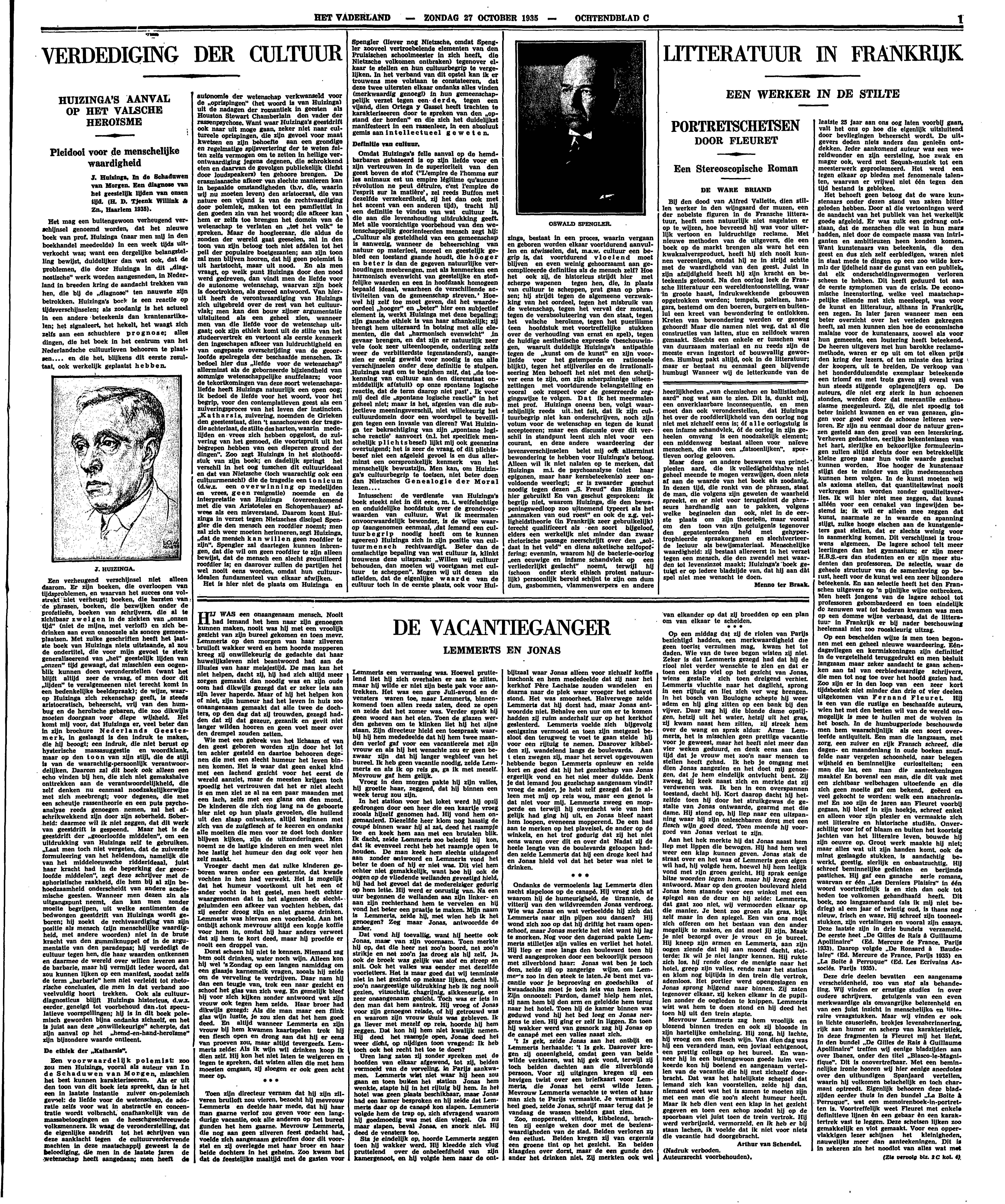 Het mag een buitengewoon verheugend verschijnsel genoemd worden, dat het nieuwe boek van prof. Huizinga (naar men mij in den boekhandel meedeelde) in een week tijds uitverkocht was; want een dergelijke belangstelling bewijst, duidelijker dan wat ook, dat de problemen, die door Huizinga in dit ‘diagnostische’ werk worden aangesneden, in Nederland in breeden kring de aandacht trekken van hen, die bij de ‘diagnose’ ten nauwste zijn betrokken. Huizinga's boek is een reactie op tijdsverschijnselen; als zoodanig is het actueel in een andere beteekenis dan krantenartikelen; het signaleert, het hekelt, het waagt zich zelfs aan een schuchtere prognose; alles dingen, die het boek in het centrum van het Nederlandsche cultuurleven behooren te plaatsen.... en die het, blijkens dit eerste resultaat, ook werkelijk geplaatst hebben.