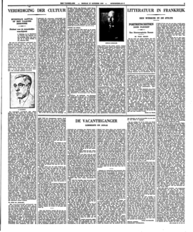 Intusschen: de verdienste van Huizinga's boek steekt niet in dit eene, m.i. weifelachtige en onduidelijke hoofdstuk over de grondvoorwaarden van cultuur. Wat ik meermalen onvoorwaardelijk bewonder, is de wijze waarop (aangenomen eenmaal, dat iemand een cultuurbegrip noodig heeft om te kunnen ageeren) Huizinga zich in zijn positie van cultuurmensch rechtvaardigt. Beter dan de omslachtige bepaling van wat cultuur is, klinkt trouwens deze uitspraak: ‘Willen wij cultuur behouden, dan moeten wij voortgaan met cultuur te scheppen’. Mogen wij uit dezen zin afleiden, dat de eigenlijke waarde van de cultuur toch in de eerste plaats, ook voor Huizinga, bestaat in een proces, waarin vergaan en geboren worden elkaar voortdurend aanvullen en afwisselen, dat, m.a.w. cultuur een begrip is, dat voortdurend vloeiend moet blijven en even weinig gehoorzaamt aan gecompliceerde definities als de mensch zelf? Hoe het ook zij, de historicus strijdt hier met scherpe wapenen tegen hen, die, in plaats van cultuur te scheppen, prat gaan op phrasen; hij strijdt tegen de algemeene verzwakking van het oordeel, tegen het misbruik van de wetenschap, tegen het verval der moraal, tegen de verabsoluteering van den staat, tegen het valsche heroïsme, tegen het puerilisme (een hoofdstuk met voortreffelijke stukken over de verhouding van ernst en spel), tegen de huidige aesthetische expressie (beschouwingen, waaruit duidelijk Huizinga's antipathie tegen de ‘kunst om de kunst’ en zijn voorliefde voor het getemperde en rationeele blijkt), tegen het stijlverlies en de irrationaliseering Men behoeft het niet met den schrijver eens te zijn, om zijn scherpzinnige uiteenzettingen met voortdurende belangstelling en vooral ook respect voor de geserreerde zeggingswijze te volgen. Dat ik het meermalen met prof. Huizinga oneens ben, volgt waarschijnlijk reeds uit het feit, dat ik zijn cultuurbegrip niet kan onderschrijven, noch zijn votum voor de wetenschap en tegen de kunst accepteeren; maar een discussie over dit verschil in standpunt leent zich niet voor een courant, en deze andere waardeering der levensverschijnselen belet mij ook allerminst bewondering te hebben voor Huizinga's betoog. Alleen wil ik niet nalaten op te merken, dat Huizinga m.i. de psychoanalyse (niet haar epigonen, maar haar kernbeteekenis) zeer onvoldoende weerlegt; er is zwaarder geschut noodig tegen dezen ‘S. Freud’ dan Huizinga hier gebruikt! En van geschut gesproken: ik begrijp niet, waarom Huizinga, die den bewapeningswedloop zoo uitnemend typeert als het ‘aanmaken van oud roest’ en ook de z.g. veiligheidstheorie (in Frankrijk zeer gebruikelijk) terecht qualificeert als een soort bijgeloof, elders een werkelijk niet minder dan zwaar rhetorische passage neerschrijft over den ‘soldaat in het veld’ en diens asketische zelfopoffering; evenmin, waarom hij de bacterie-oorlog ‘een eeuwige en infame schandvlek op een verliederlijkt geslacht’ noemt, terwijl hij (schoon onder sterk ethisch protest natuurlijk) persoonlijk bereid schijnt te zijn om dum dum, gasbommen, vlammenwerpers en andere heerlijkheden ‘van chemischen en ballistischen aard’ nog wat aan te zien. Dit is, dunkt mij, een onverklaarbare inconsequentie, en men moet dan ook veronderstellen, dat Huizinga het over de roofdierlijkheid van den oorlog nog niet met zichzelf eens is; óf alle oorlogstuig is een infame schandvlek, óf de oorlog in zijn geheelen omvang is een noodzakelijk element; een middenweg bestaat alleen voor naïeve menschen, die aan een ‘fatsoenlijken’, sportieven oorlog gelooven.
