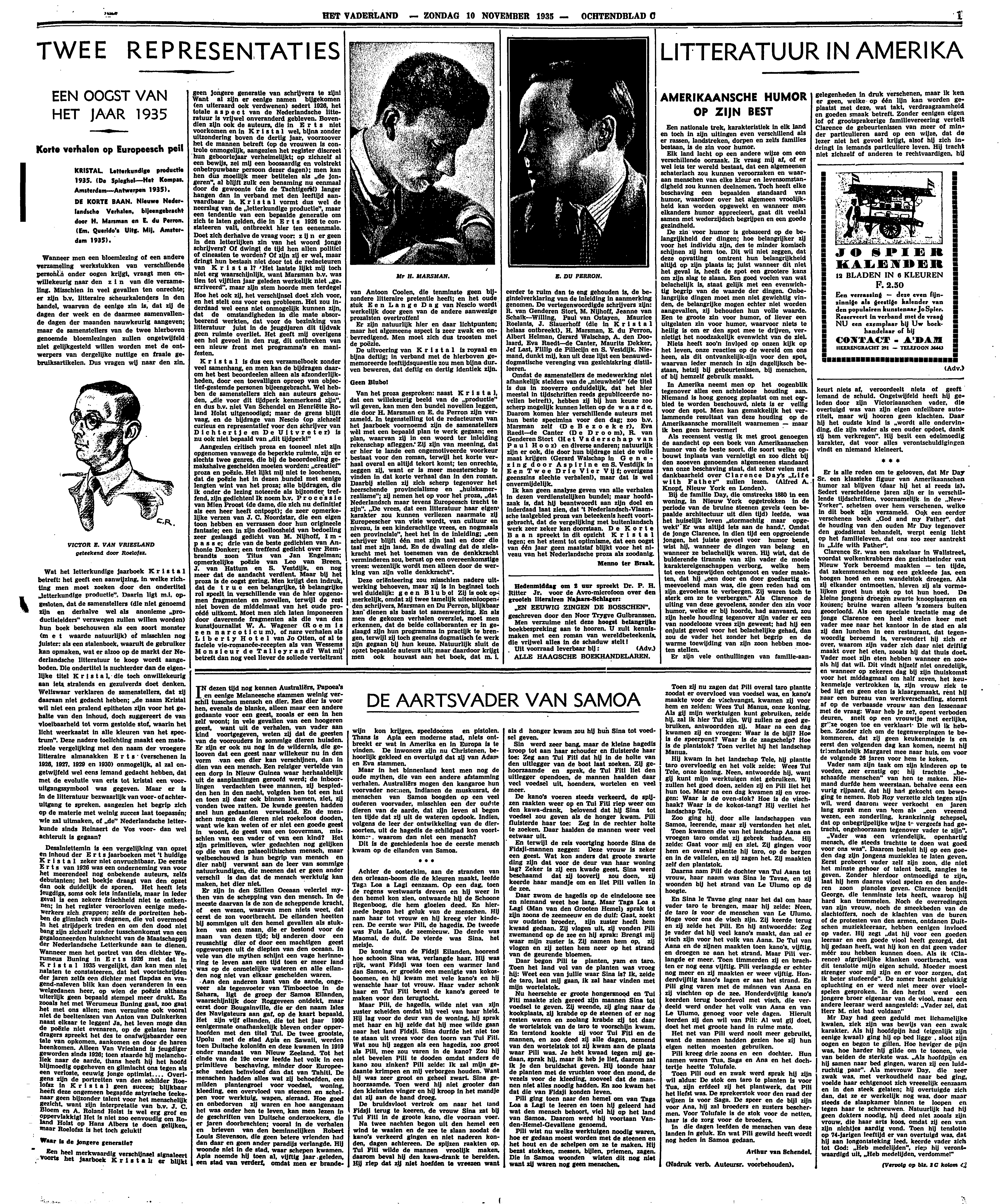 Wat het letterkundige jaarboek Kristal betreft: het geeft een aanwijzing, in welke richting men moet zoeken door den ondertitel ‘letterkundige productie’. Daarin ligt m.i. opgesloten, dat de samenstellers (die niet genoemd zijn en derhalve wel als anonieme ‘productieleiders’ verzwegen zullen willen worden) hun boek beschouwen als een soort monster (met waarde natuurlijk) of misschien nog juister: als een stalenboek, waaruit de gebruiker kan opmaken, wat er alzoo op de markt der Nederlandsche litteratuur te koop wordt aangeboden. Die ondertitel is nuchterder dan de eigenlijke titel Kristal, die toch onwillekeurig aan iets stralends en gezuiverds doet denken. Weliswaar verklaren de samenstellers, dat zij daaraan niet gedacht hebben; ‘de naam Kristal wil niet een pralend epitheton zijn voor het gehalte van den inhoud, doch suggereert de van vloeibaarheid tot vorm gestolde stof, waarin het licht weerkaatst in alle kleuren van het spectrum’. Deze nadere toelichting maakt een materieele vergelijking met den naam der vroegere litteraire almanakken Erts (verschenen in 1926, 1927, 1929 en 1930) onmogelijk, al zal ongetwijfeld wel eens iemand gedacht hebben, dat met de evolutie van erts tot kristal een vooruitgangssymbool was gegeven. Maar er is in de litteratuur bezwaarlijk van voor- of achteruitgang te spreken, aangezien het begrip zich op de materie met weinig succes laat toepassen; wie zal uitmaken, of ‘de’ Nederlandsche letterkunde sinds Reinaert de Vos voor- dan wel achteruit is gegaan?