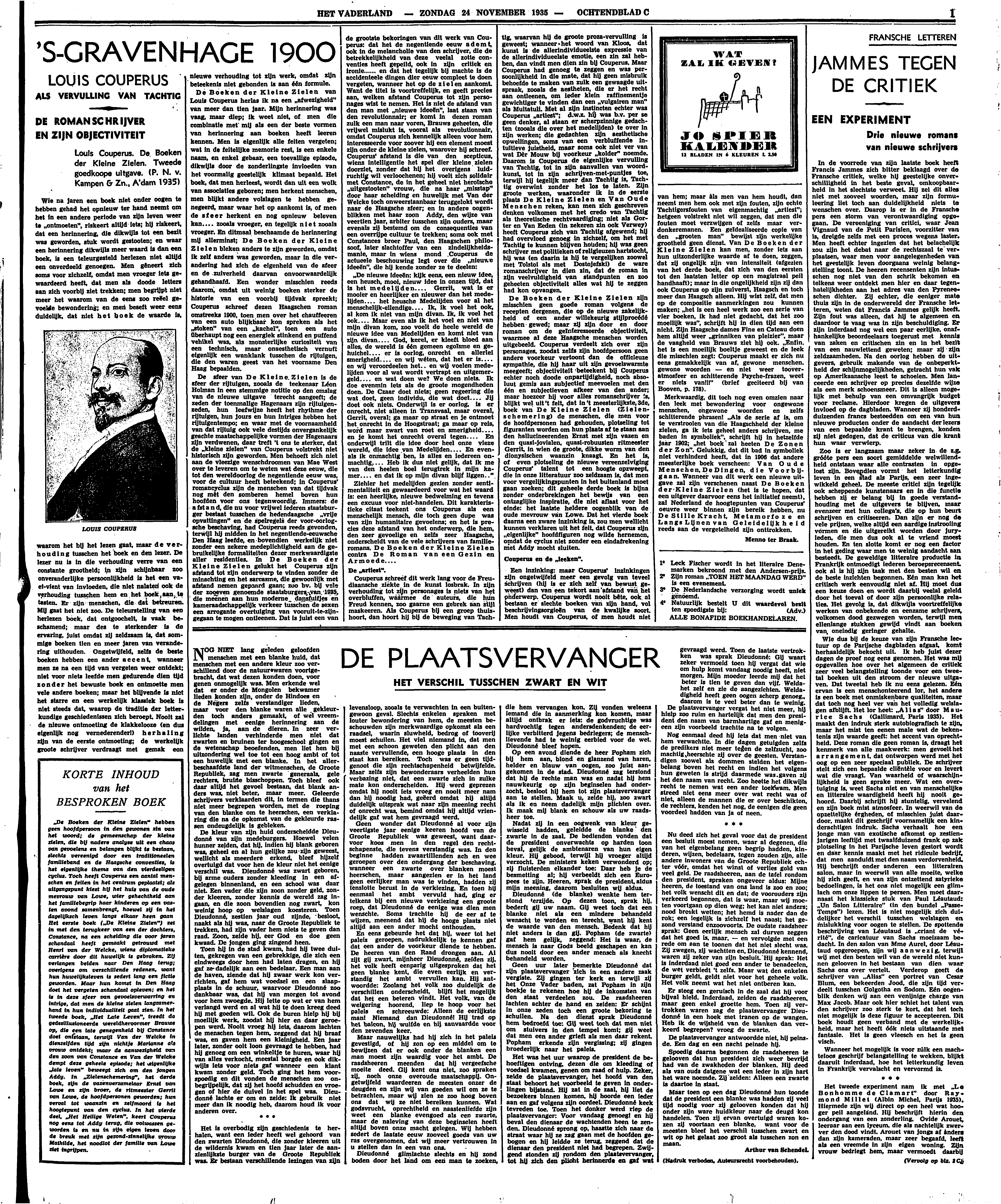 De sfeer van De Kleine Zielen is de sfeer der rijtuigen, zooals de teekenaar Léon Holman in een stemmige notitie op den omslag van de nieuwe uitgave terecht aangeeft; de zeden der toenmalige Hagenaars zijn rijtuigenzeden, hun leefwijze heeft het rhythme der rijtuigen, hun jours en hun intriges hebben het rijtuigentempo; en waar met de voornaamheid van dat rijtuig ook vele destijds onvergankelijk geachte maatschappelijke vormen der Hagenaars zijn verdwenen, daar treft 't ons te sterker, dat de ‘kleine zielen’ van Couperus volstrekt niet historisch zijn geworden. Men behoeft zich niet aan de vleezige wenschdroomen van Mae West over te leveren om te weten wat deze eeuw, die tot den wereldoorlog de negentiende eeuw was, voor de cultuur heeft beteekend; in Couperus' romancyclus zijn de menschen van dat tijdvak nog mèt den somberen hemel boven hun hoofden voor ons tegenwoordig. Immers: de afstand, die nu voor vrijwel iederen staatsburger bestaat tusschen de hedendaagsche ‘vrije opvattingen’ en de spelregels der voor-oorlogsche beschaving, had Couperus reeds gevonden, terwijl hij midden in het negentiende-eeuwsche Den Haag leefde, en bovendien werkelijk niet zonder een zekere medeplichtigheid aan de gebruikelijke formaliteiten dezer merkwaardigste aller residenties. In De Boeken der Kleine Zielen gelukt het Couperus zijn afstand tot zijn onderwerp te vinden zonder de minachting en het sarcasme, die gewoonlijk met afstand nemen gepaard gaan; zoo bv. bij vele der zooeven genoemde staatsburger van 1935, die meenen aan hun moderne dansfuifjes en kameraadschappelijk verkeer tusschen de sexen een arrogante overtuiging van vooruit-te-zijn-gegaan te mogen ontleenen. Dat is juist een van de grootste bekoringen van dit werk van Couperus: dat het de negentiende eeuw ademt, ook in de melancholie van den schrijver, die de betrekkelijkheid van deze veelal zotte conventies heeft gepeild, ook in zijn critiek en ironie...... en dat het tegelijk bij machte is de accidenteele dingen dier eeuw compleet te doen vergeten, wanneer het op de zielen aankomt. Want de titel is voortreffelijk, en geeft precies aan, welken afstand Couperus tot zijn personages wist te nemen. Het is niet de afstand van den man met ‘nieuwe ideeën’, laat staan van den revolutionnair; er komt in dezen roman zulk een man naar voren, Brauws geheeten, die vrijwel mislukt is, vooral als revolutionnair, omdat Couperus zich kennelijk alleen voor hem interesseerde voor zoover hij een element moest zijn onder de kleine zielen, waarover hij schreef. Couperus' afstand is die van den scepticus, wiens intelligentie het spel dier kleine zielen doorziet, zonder dat hij het overigens luidruchtig wil verloochenen; hij voelt zich solidair met Constance, de in het geheel niet heroïsche ‘uitgestooten’ vrouw, die na haar ‘misstap’ door haar scheiding en huwelijk met Van der Welcke toch onweerstaanbaar teruggelokt wordt naar de Haagsche sfeer; en in andere oogenblikken met haar zoon Addy, den wijze van veertien jaar, arbiter tusschen zijn ouders, maar evenals zij bestemd om de consequenties van een overrijpe cultuur te trekken; soms ook met Constances broer Paul, den Haagschen philosoof, later slachtoffer van een zindelijkheidsmanie, maar in wiens mond Couperus de actueele beschouwing legt over die ‘nieuwe ideeën’, die hij kende zonder ze te deelen: