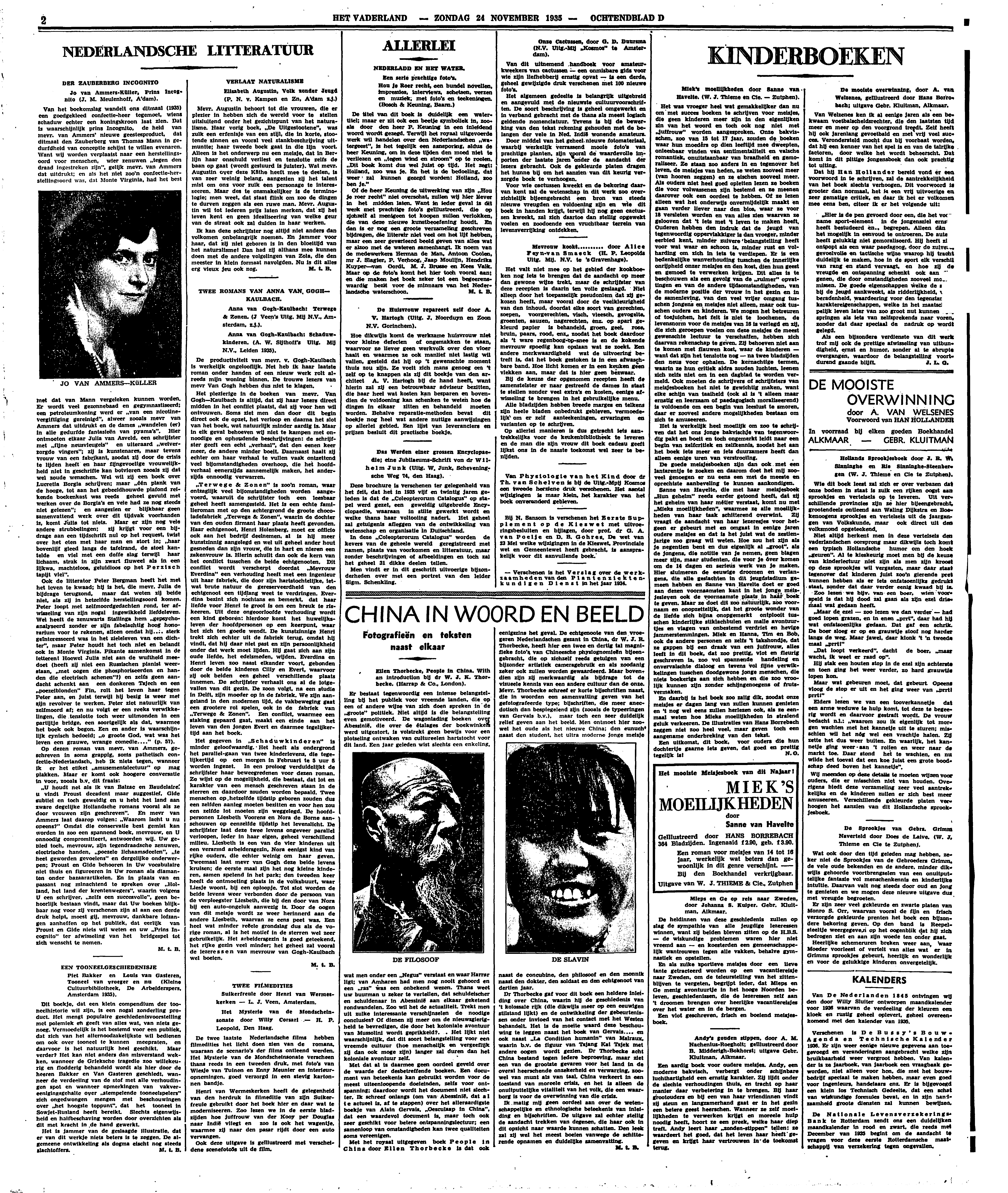 Of de heer Keuning de uitwerking van zijn ‘Hou je roer recht’ niet overschat, zullen wij hier liever in het midden laten. Want in ieder geval is dit werk met prachtige foto's geïllustreerd, die op zichzelf al menigeen tot koopen zullen verlokken, die van deze nieuwe kunstbeoefening houdt. En dan is er nog een groote verzameling geschreven bijdragen, die litterair niet veel om het lijf hebben, maar een zeer gevarieerd beeld geven van alles wat er alzoo met de wateren samenhangt. Ik noem van de medewerkers Herman de Man, Antoon Coolen, mr J. Slagter, P. Verhoog, Jaap Moulijn, Hendrika Kuyper - van Oordt, M.J. Brusse en Kees Valk. Maar op de foto's komt het hier toch vooral aan; en die maken het boek zeker tot een begeerenswaardig bezit voor de minnaars van het Nederlandsche waterschoon.