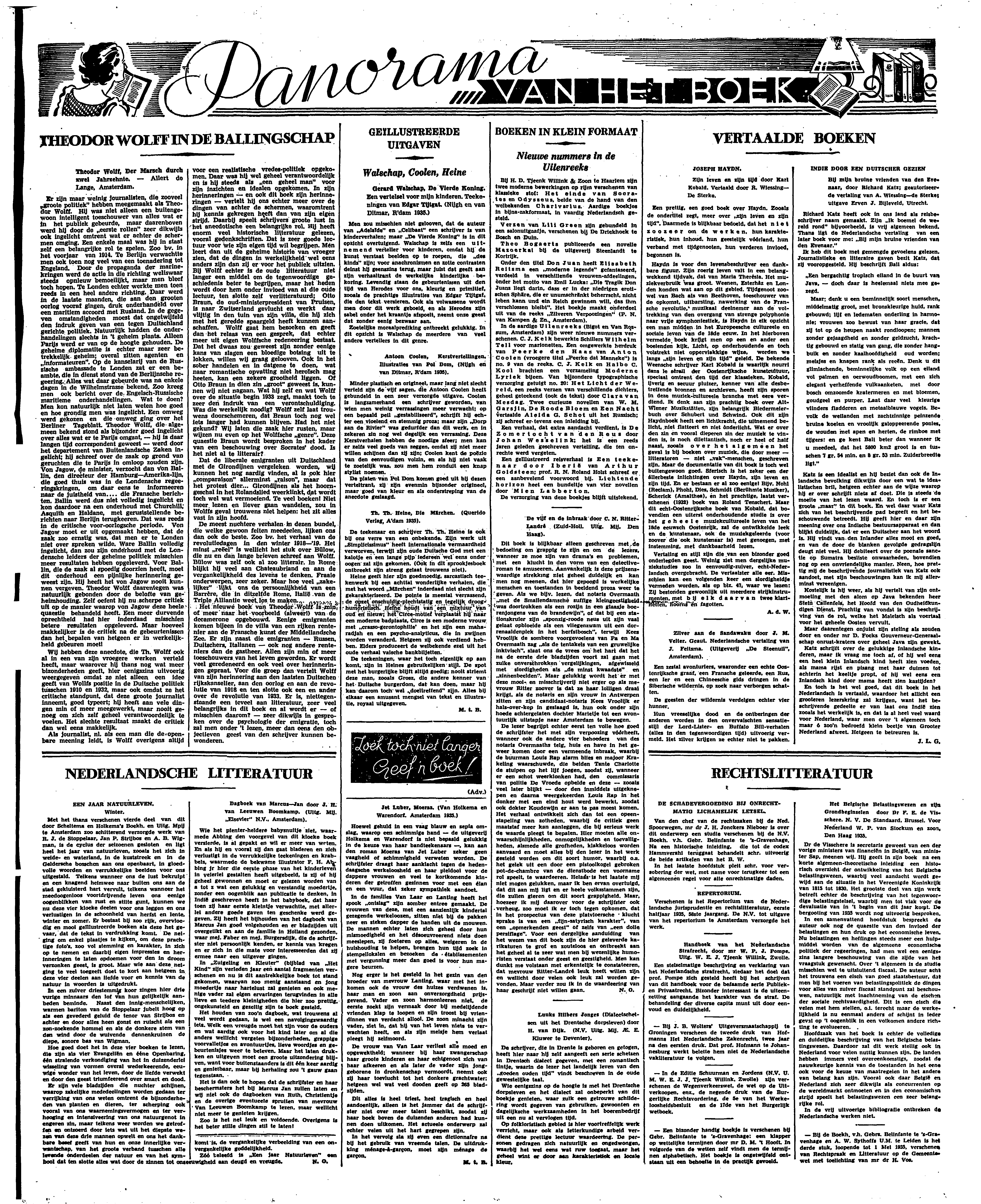 Minder plastisch en origineel, maar lang niet slecht verteld zijn de vijf sagen, die Antoon Coolen heeft gebundeld in een zeer verzorgde uitgave. Coolen is langzamerhand een schrijver geworden, van wien men weinig verrassingen meer verwacht; op een bepaald pell ‘gestabilliseerd’, schrijft hij echter een vloelend en stemmig proza; maar zijn ‘Dorp aan de Rivier’ was gedurfder dan dit werk, en in zekeren zin nog wel degelijk een verrassing. Deze Kerstverhalen hebben de noodige sfeer; men kan er zelfs veel goeds van zeggen, omdat zij niet meer willen schijnen dan zij zijn; Coolen kent de poëzie van den eenvoudigen volzin, en als hij niet vaak te zoetelijk was, zou men hem ronduit een knap stylist noemen.
