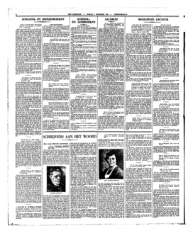 Mijn collega 's Gravesande heeft eenigen tijd geleden in een artikel in ‘Het Vaderland’ de stelling verkondigd (tegenover mijn opvatting), dat men als medewerkers van een en hetzelfde blad gerust over elkaar kan schrijven. Theoretisch heeft hij daarin, ik geef het onmiddellijk toe, volkomen gelijk; en als ik desondanks practisch blijf prefereeren, dat over mijn werk in deze courant niet wordt geschreven, dan is dat geenszins, omdat ik aan de objectiviteit van mijn eventueele critici zou twijfelen. Maar wat dies ook zij, 's Gravesande heeft het bij het rechte eind, en ik schroom dan ook niet voor zijn boek hier de aandacht te vragen. Dat wordt mij nog gemakkelijker gemaakt, omdat hij in dit geval de interviewer is, die anderen hoofdzakelijk aan het woord laat: en die anderen staan buiten de bureelen van ‘Het Vaderland’. Maar hoewel het dus grootendeels de inzichten van anderen zijn, die het boek ‘Sprekende Schrijvers’ vullen, is de tact, die noodig is om hen tot die uitspraken te krijgen en om orde te houden in hun uiteenzettingen, niet iedereen gegeven. De interviews van 's Gravesande hebben niet ten onrechte een zekere vermaardheid gekregen, van het moment af waarop zij in ‘Den Gulden Winckel’ begonnen te verschijnen; men herinnert zich ongetwijfeld het geruchtmakende gesprek met Geerten Gossaert, dat natuurlijk ook in dezen bundel te vinden is. En als men deze methode van interview eens vergelijkt met wat tegenwoordig in sommige boekenblaadjes voor hetzelfde wil doorgaan, dan valt het verschil aanstonds op, het zij hier zonder eenige reserve gezegd. Niet de kietspraatjes over ditjes en datjes treden bij 's Gravesande op den voorgrond: in elk van deze gesprekken, waarvan het eene natuurlijk beter geslaagd is dan het andere, staat het essentieele zooveel mogelijk bovenaan. Niet ieder geïnterviewde heeft echter hetzelfde talent voor het gesprek; er zijn schrijvers, die als zij praten, dadelijk willen divageeren, anderen, die moeilijk kunnen veralgemeenen en loskomen van hun eigen ervaringen, weer anderen, die een gesprek opbouwen als een essay. Van deze en soortgelijke kategorieën vindt men voorbeelden in 's Gravesandes boek.