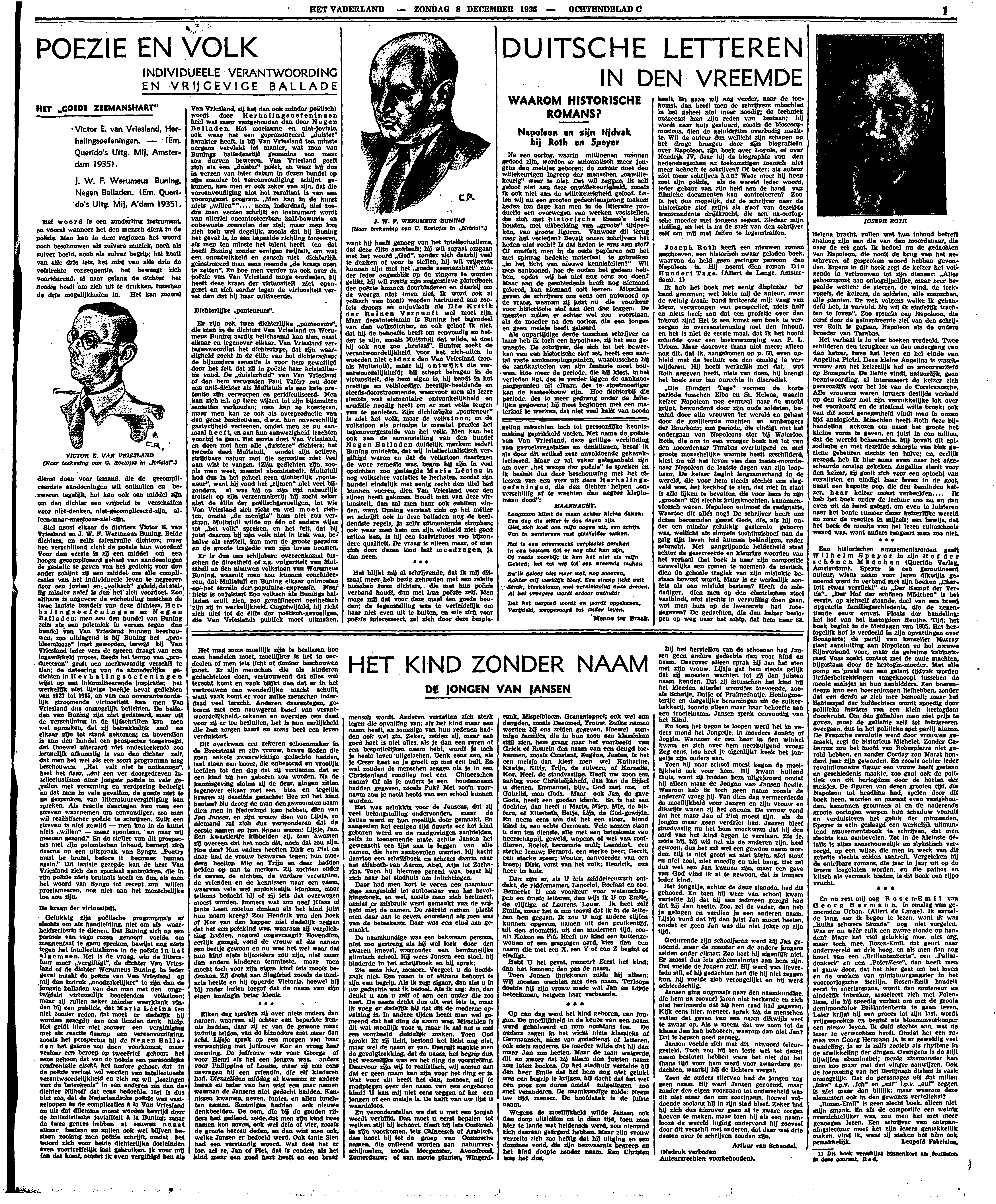 Stel naast elkaar de dichters Victor E. van Vriesland en J.W.F. Werumeus Buning. Beide dichters, en zelfs talentvolle dichters; maar hoe verschillend richt de poëzie hun woorden! Voor den eerste is zij een middel om een hoogst gecompliceerd geheel van aandoeningen de gestalte te geven van het gedicht; voor den ander schijnt zij een middel om alle complicaties van het individueele leven te negeeren door een joviaal en ‘volksch’ geluid, dat stellig minder naïef is dan het zich voordoet. Zoo althans is ongeveer de verhouding tusschen de twee laatste bundels van deze dichters, Herhalingsoefeningen en Negen Balladen; men zou den bundel van Buning zelfs als een polemiek in verzen tegen den bundel van Van Vriesland kunnen beschouwen, zoo uitdagend is bij Buning het ‘probleemlooze’ inzet geworden, terwijl bij Van Vriesland ieder vers de sporen draagt van een ingewikkeld proces. Reeds het tempo van ‘produceeren’ geeft een merkwaardig verschil te zien; de dateering van de afzonderlijke gedichten in Herhalingsoefeningen wijst op een intermitteerende inspiratie; het werkelijk niet lijvige boekje bevat gedichten van 1927 tot 1935, en van een onverantwoordelijk stroomende virtuositeit kan men Van Vriesland dus onmogelijk betichten. De balladen van Buning zijn niet gedateerd, maar uit de verschijning in de tijdschriften kan men wel opmaken, dat zij betrekkelijk snel na elkaar zijn tot stand gekomen; en bovendien is aan den bundel een prospectus toegevoegd, dat (hoewel uiteraard niet onderteekend) zoo kennelijk afkomstig is van den dichter zelf, dat men het wel als een soort programma mag beschouwen. ‘Het valt niet te ontkennen’, heet het daar, ‘dat een ver doorgedreven intellectualisme onze jongste poëzie in vele gevallen met verarming en verdorring bedreigt en dat men in vele gevallen, de goede niet te na gesproken, van litteratuurvergiftiging kan spreken. Als reactie daartegen kan men een streven waarnemen om eenvoudiger, zoo men wil realistischer poëzie te schrijven. Zulk een streven is niet gewild - men kan in de kunst niets “willen” - maar spontaan, en naar wij meenen gezond.’ En de steller van dit prospectus met zijn polemischen inhoud, beroept zich daarna op een uitspraak van Synge: ‘Poetry must be brutal, before it becomes human again.’ Dit laatste gezegde kan de heer Van Vriesland zich dan speciaal aantrekken, die in zijn poëzie niets brutaals heeft en dus, als men het woord van Synge tot recept zou willen proclameeren, nog niet aan het menschelijke toe zou zijn.