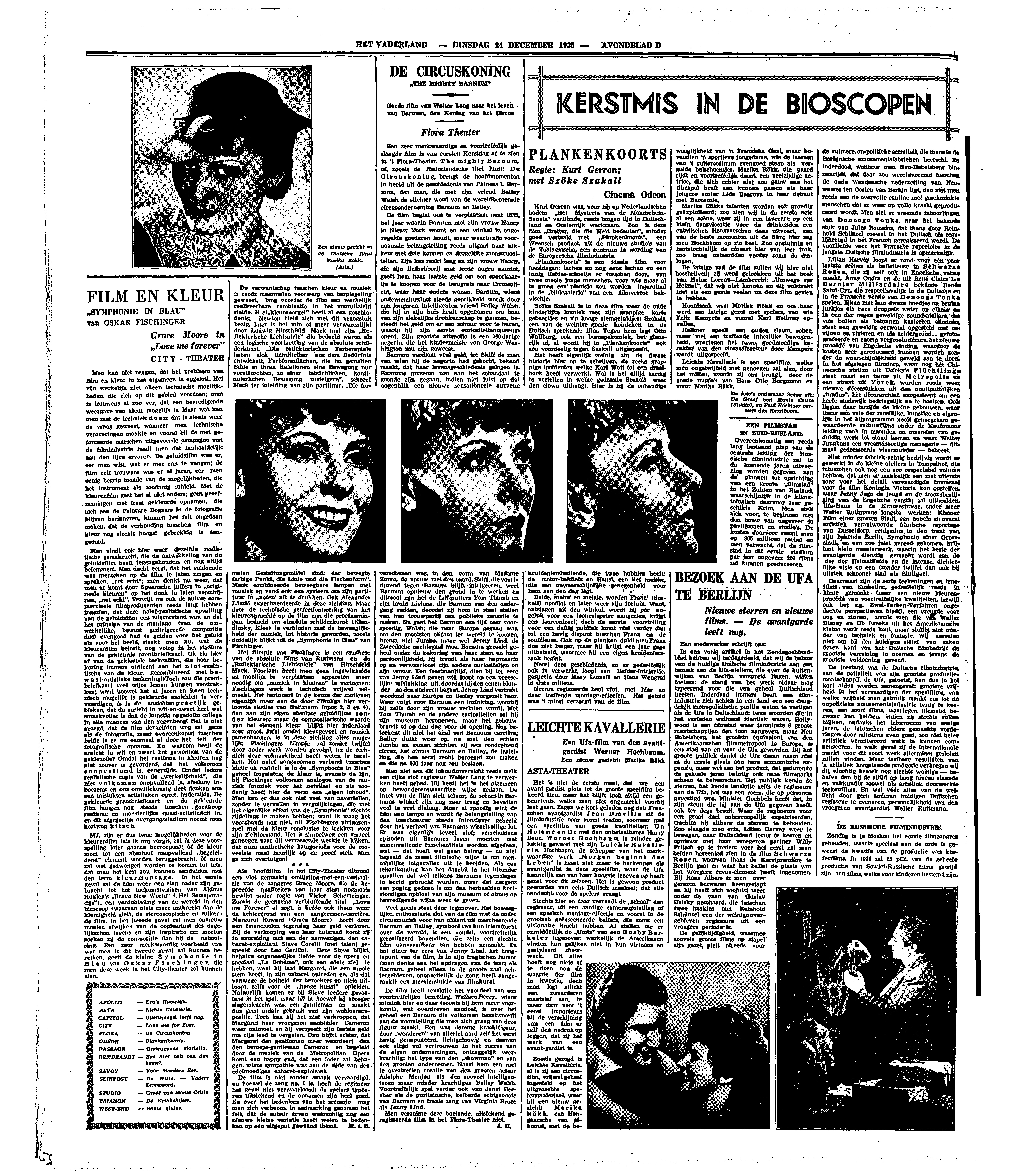 Als hoofdfilm in het City-Theater ditmaal een vlot gemaakte omlijsting-met-een-verhaaltje van de zangeres Grace Moore, die de beproefde qualiteiten van haar stem nogmaals bewijst onder regie van Victor Schertzinger. Zooals de geenszins verbluffende titel ‘Love me Forever’ al zegt, is liefde ook thans weer de achtergrond van een zangeressen-carrière. Margaret Howard (Grace Moore) heeft door een financieelen tegenslag haar geld verloren. Bij de verkooping van haar huisraad komt zij in aanraking met een der aanwezigen, den cabaret-exploitant Steve Corelli (met talent gespeeld door Leo Carillo). Deze Steve blijkt, behalve ongeneeslijke liefde voor de opera en speciaal ‘La Bohème’, ook een edele ziel te hebben, want hij laat Margaret, die een mooie stem heeft, in zijn cabaret optreden en, als dat vanwege de botheid der bezoekers op niets uitloopt, zelfs voor de ‘hooge kunst’ opleiden. Natuurlijk komen er bij Steve teedere gevoelens in het spel, maar hij is, hoewel hij vroeger slagersknecht was, een gentleman en maakt dus geen unfair gebruik van zijn weldoenerspositie. Toch kan hij het niet verkroppen, dat Margaret haar vroegeren aanbidder Cameron weer ontmoet, en hij verspeelt zijn laatste geld om zijn leed te vergeten. Dan blijkt echter, dat Margaret den gentleman meer waardeert dan den beroeps-gentleman Cameron en begeleid door de muziek van de Metropolitan Opera komt een happy end, dat een ieder zal behagen, wiens sympathie was aan de zijde van den edelmoedigen cabaret-exploitant.