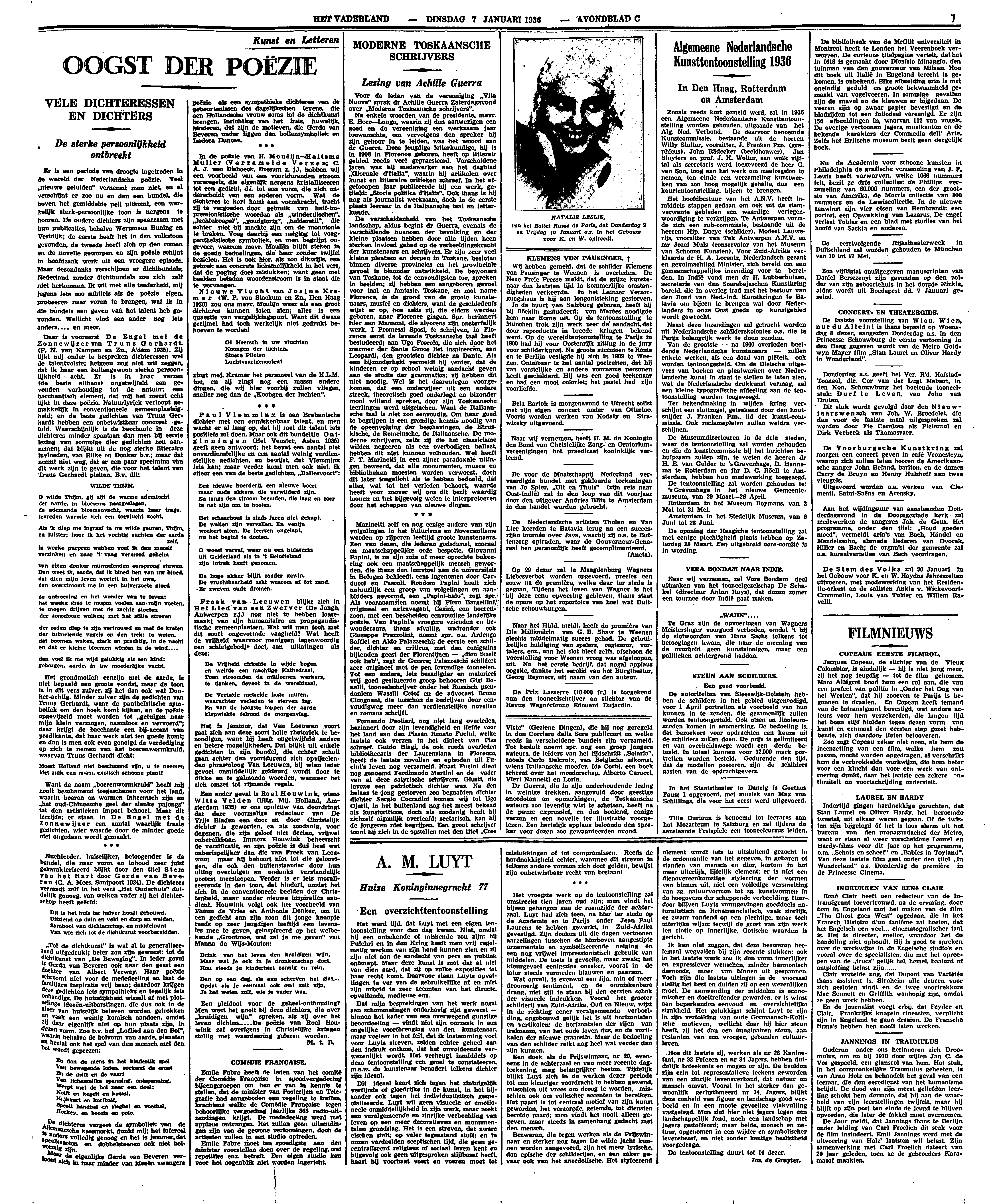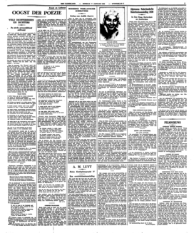 Het is jammer, dat Van Leeuwen voort gaat zich aan deze soort holle rhetoriek te bezondigen, want hij heeft ongetwijfeld andere en betere mogelijkheden. Dat blijkt uit enkele gedichten in zijn bundel, die echter schuil gaan achter den voortdurend zich opvijzelenden phraseoloog Van Leeuwen, bij wien ieder gevoel onmiddellijk gekleurd wordt door te dikke en te galmende woorden, wanneer het zich omzet tot rijmende regels.