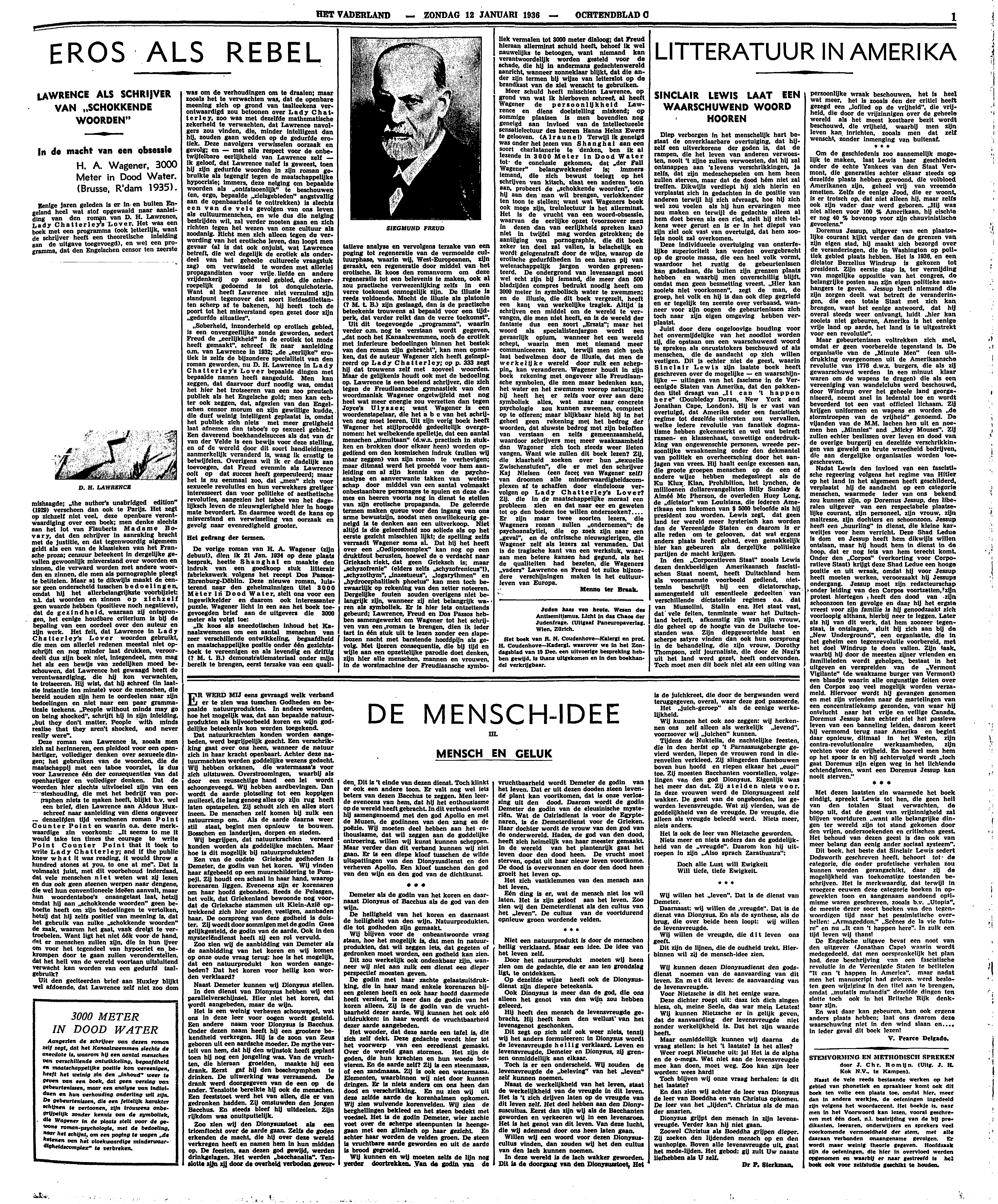 Uit dit toegevoegde ‘programma’, waarin verder o.m. nog te verstaan wordt gegeven, ‘dat noch het Kanaalzwemmen, noch de erotiek met inferieure bedoelingen binnen het bestek van den roman zijn gebracht’, kan men opmaken, dat de auteur Wagener heeft geïnspireerd op Lady Chatterley; op p. 333 zegt hij dat trouwens zelf met zooveel woorden. Maar de gelijkenis houdt ook met de bedoeling op. Lawrence is een boeiend schrijver, die zich tegen de Freudiaansche gymnastiek van den woordmaniak Wagener ongetwijfeld met nog heel wat meer energie zou verzetten dan tegen Joyce's Ulysses; want Wagener is een woordenstapelaar, die het abc van het schrijven nog moet leeren. Uit zijn vorig boek heeft Wagener het stijlprocédé gedeeltelijk overgenomen: het welbekende spelletje, dat een aantal menschen ‘simultaan’ (d.w.z. practisch in stukken en brokken door elkaar heen) worden opgediend om den kosmischen indruk (zullen wij maar zeggen) van zijn roman te verhevigen; maar ditmaal werd het procédé voor hem aanleiding om al zijn kennis van de psychoanalyse en aanverwante takken van wetenschap door middel van een aantal volmaakt onbestaanbare personages te spuien en deze dames en heeren voorts nog in dienst te stellen van zijn erotische propaganda. De geleerde termen maken queue voor den ingang van ons arme bewustzijn, zoodat men onwillekeurig geneigd is te denken aan een uitverkoop. Niet altijd is die geleerdheid zoo soliede als op het eerste gezicht misschien lijkt; de spelling zelfs verraadt Wagener soms al. Dat hij het heeft over een ‘Oediposcomplex’ kan nog op een druktfout berusten, hoewel de o verdacht naar Grieksch riekt, dat geen Grieksch is; maar ‘schyzofrenie’ (elders zelfs ‘schyzofrenicus’!), ‘schyzothym’, ‘inzestueus’, ‘logarythmen’ en ‘hydrocephalitisch phoetus’ kan men toch bezwaarlijk op rekening van den zetter noteeren. Dergelijke fouten zouden overigens niet belangrijk zijn, wanneer zij niet belangrijk waren als symboliek. Er is hier iets ontzettends gebeurd; Lawrence, Freud en Dos Passos hebben samengewerkt om Wagener tot het schrijven van een roman te brengen, dien ik ieder tart in één stuk uit te lezen zonder een slapeloozen nacht met barstende hoofdpijn als gevolg. Met ijzeren consequentie, die bij tijd en wijle aan een opzettelijke parodie doet denken, zijn hier alle menschen, mannen en vrouwen, in de worstmachine der Freudiaansche symboliek vermalen tot 3000 meter dialoog; dat Freud hieraan allerminst schuld heeft, behoef ik wel nauwelijks te betoogen, want niemand kan verantwoordelijk worden gesteld voor de schade, die hij in andermans gedachtenwereld aanricht, wanneer zonneklaar blijkt, dat die ander zijn termen bij wijze van letterslot op de brandkast van de ziel wenscht te gebruiken.