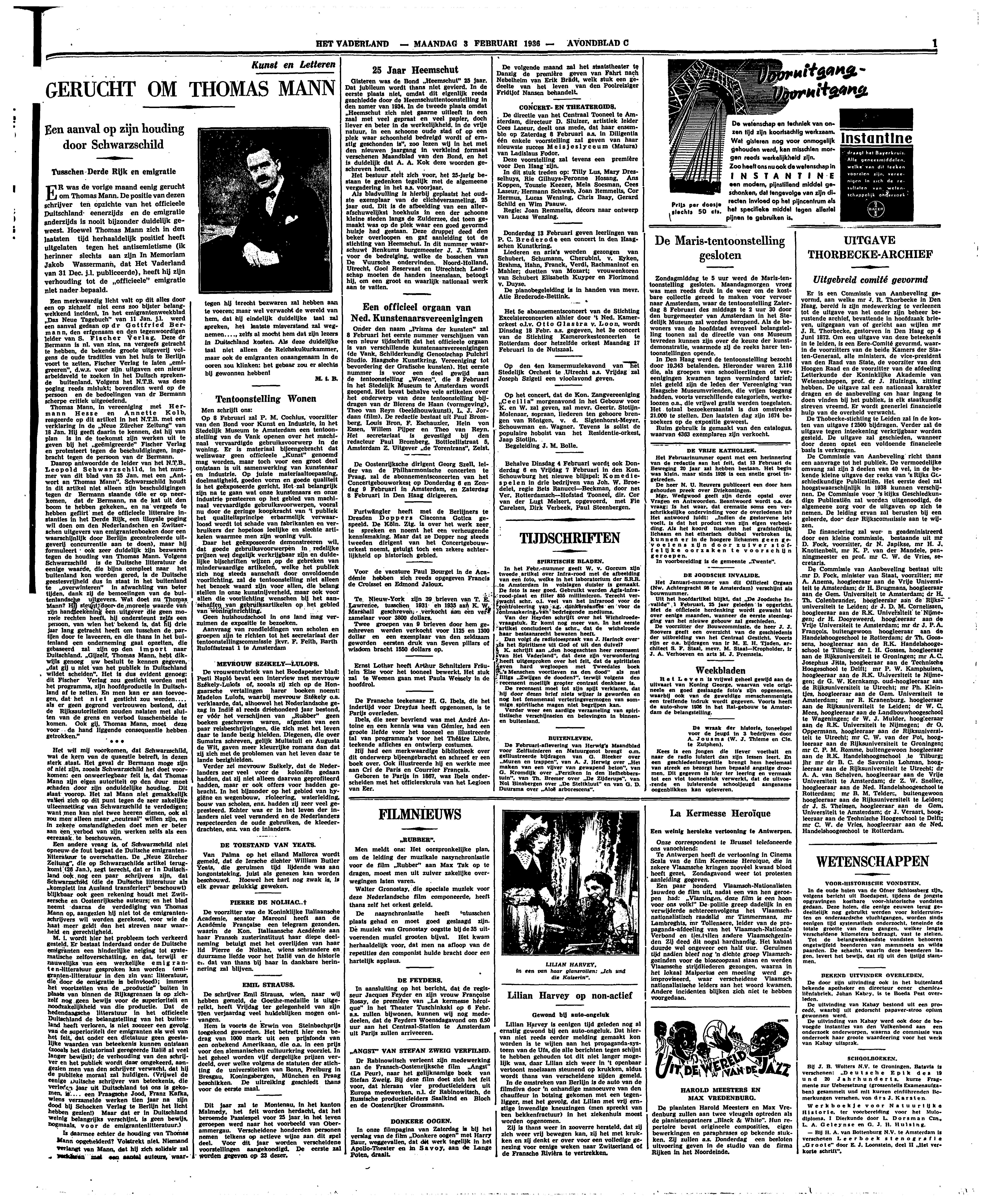 ER was de vorige maand eenig gerucht om Thomas Mann. De positie van dezen schrijver ten opzichte van het officieele Duitschland eenerzijds en de emigratie anderzijds is nooit bijzonder duidelijk geweest. Hoewel Thomas Mann zich in den laatsten tijd herhaaldelijk positief heeft uitgelaten tegen het antisemietisme (ik herinner slechts aan zijn In Memoriam Jakob Wassermann, dat Het Vaderland van 31 Dec. j.l. publiceerde), heeft hij zijn verhouding tot de ‘officieele’ emigratie niet nader bepaald.