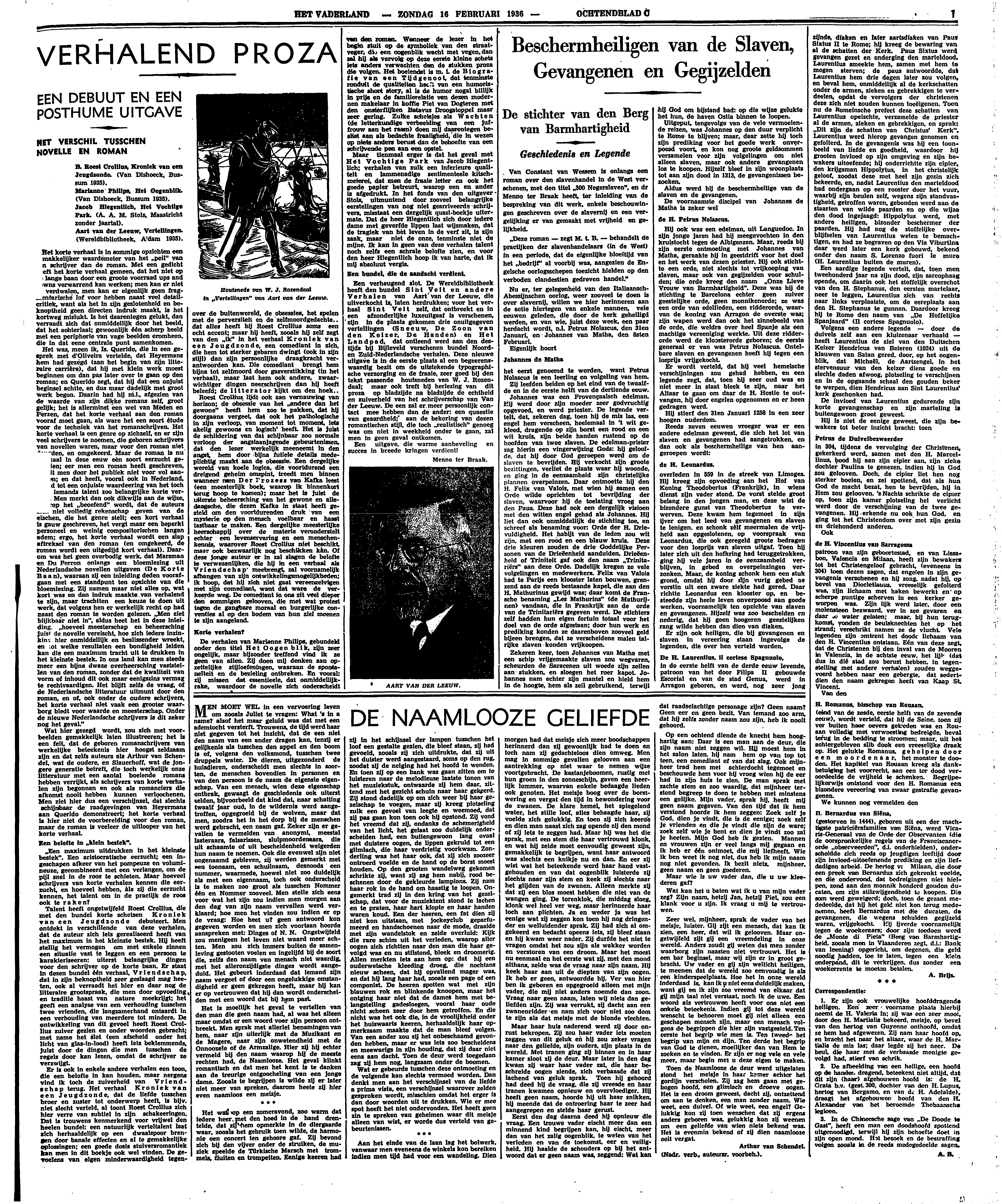 Een verheugend slot. De Wereldbibliotheek heeft den bundel Sint Veit en andere Verhalen van Aart van der Leeuw, die uitverkocht is, laten herdrukken; voor het verhaal Sint Veit zelf, dat ontbreekt en in een afzonderlijke luxeuitgaaf is verschenen, zijn in de plaats gekomen drie onuitgegeven vertellingen (Sneeuw, De Zoon van den Keizer, De Handen) en Het Landpad, dat ontleend werd aan den destijds bij Bijleveld verschenen bundel Noord- en Zuid-Nederlandsche verhalen. Deze nieuwe uitgave is in de eerste plaats al een begeerenswaardig bezit om de uitstekende typographische verzorging en de fraaie, zeer goed bij den tekst passende houtsneden van W.J. Rozendaal; maar ook treft bij herlezing van dit proza op bladzijde na bladzijde de echtheid en zuiverheid van het schrijverschap van Van der Leeuw. De een zal er meer persoonlijk contact mee hebben dan de ander: een quaestie van geaardheid; aan de bekoring van dezen romantischen stijl, die toch ‘realistisch’ genoeg was om niet in weekheid onder te gaan, zal men in geen geval ontkomen.