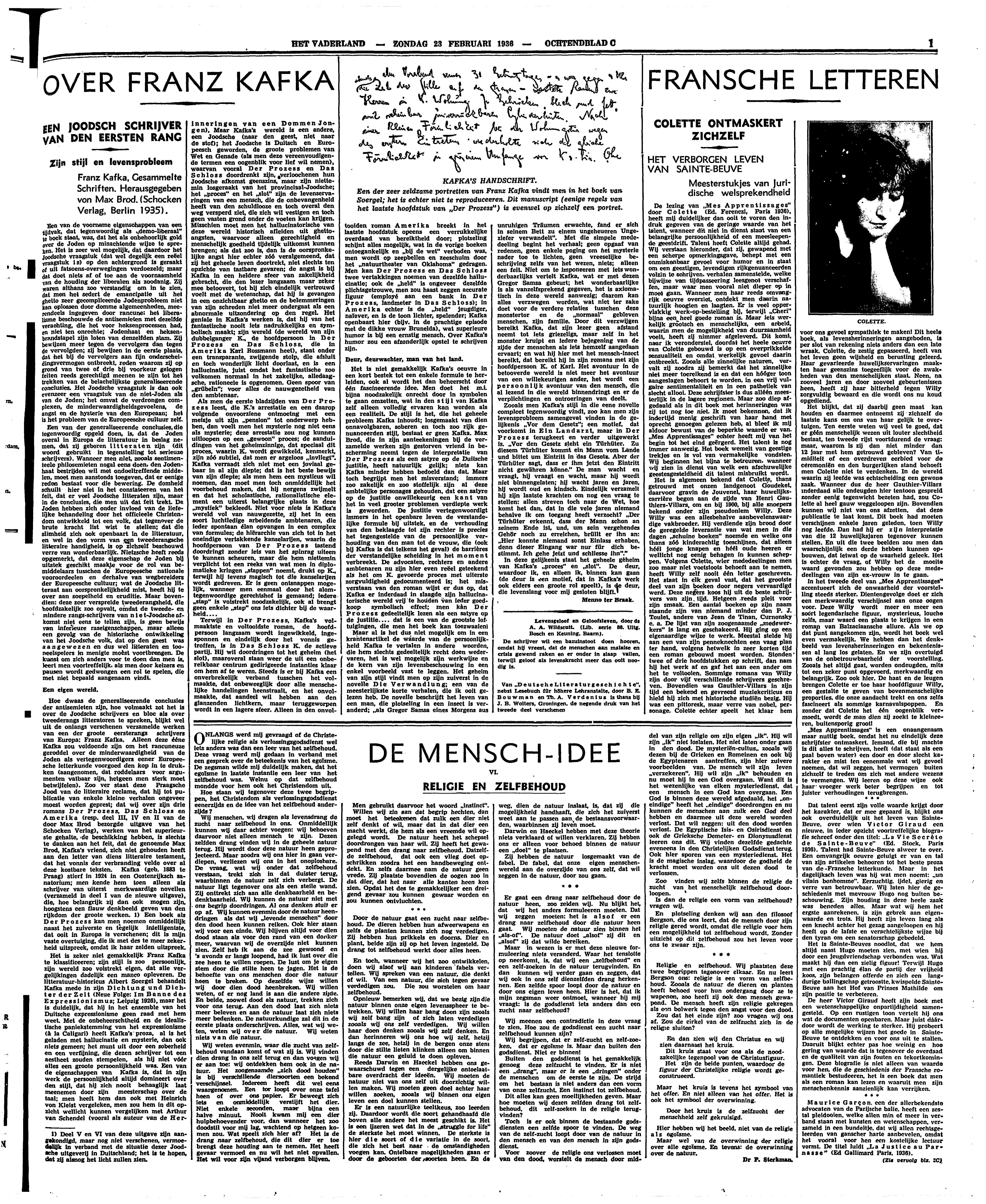 Hoe dwaas de generaliseerende conclusies der antisemieten zijn, hoe volmaakt zot het is over de Joodsche schrijvers en bloc als over tweederangs litteratoren te spreken, blijkt wel uit de onlangs verschenen verzamelde werken van een der groote eersterangs schrijvers van Europa: Franz Kafka. Alleen deze ééne Kafka zou voldoende zijn om het rancuneuze geroddel over de minderwaardigheid van de Joden als vertegenwoordigers eener Europeesche letterkunde voorgoed den kop in te drukken (aangenomen, dat roddelaars voor argumenten vatbaar zijn, hetgeen men sterk moet betwijfelen). Zoo ver staat deze Praagsche Jood van de litteraire reclame, dat hij tot publicatie van enkele kleine verhalen ongeveer moest worden geprest; dat wij over zijn drie romans Der Prozess, Das Schloss en Amerika (resp. deel III, IV en II van de door Max Brod bezorgde uitgave van het Schocken Verlag), werken van het superieurste gehalte, de beschikking hebben, is slechts te danken aan het feit, dat de genoemde Max Brod, Kafka's vriend, zich niet gehouden heeft aan den letter van diens litteraire testament, dat het vonnis der verbranding velde over al deze kostbare teksten. Kafka (geb. 1883 te Praag) stierf in 1924 in een Oostenrijksch sanatorium; men kende hem toen alleen als schrijver van uiterst merkwaardige novellen (verzameld in deel I van de nieuwe uitgave), die, hoe belangrijk zij dan ook mogen zijn, hoogstens een flauw denkbeeld geven van den rijkdom der groote werken.1 Een boek als Der Prozess kan men noemen onmiddellijk naast het zuiverste en tegelijk intelligentste, dat ooit in Europa is verschenen; dit is mijn vaste overtuiging, die ik met des te meer zekerheid uitspreek, omdat ik haar zelden uitspreek.
