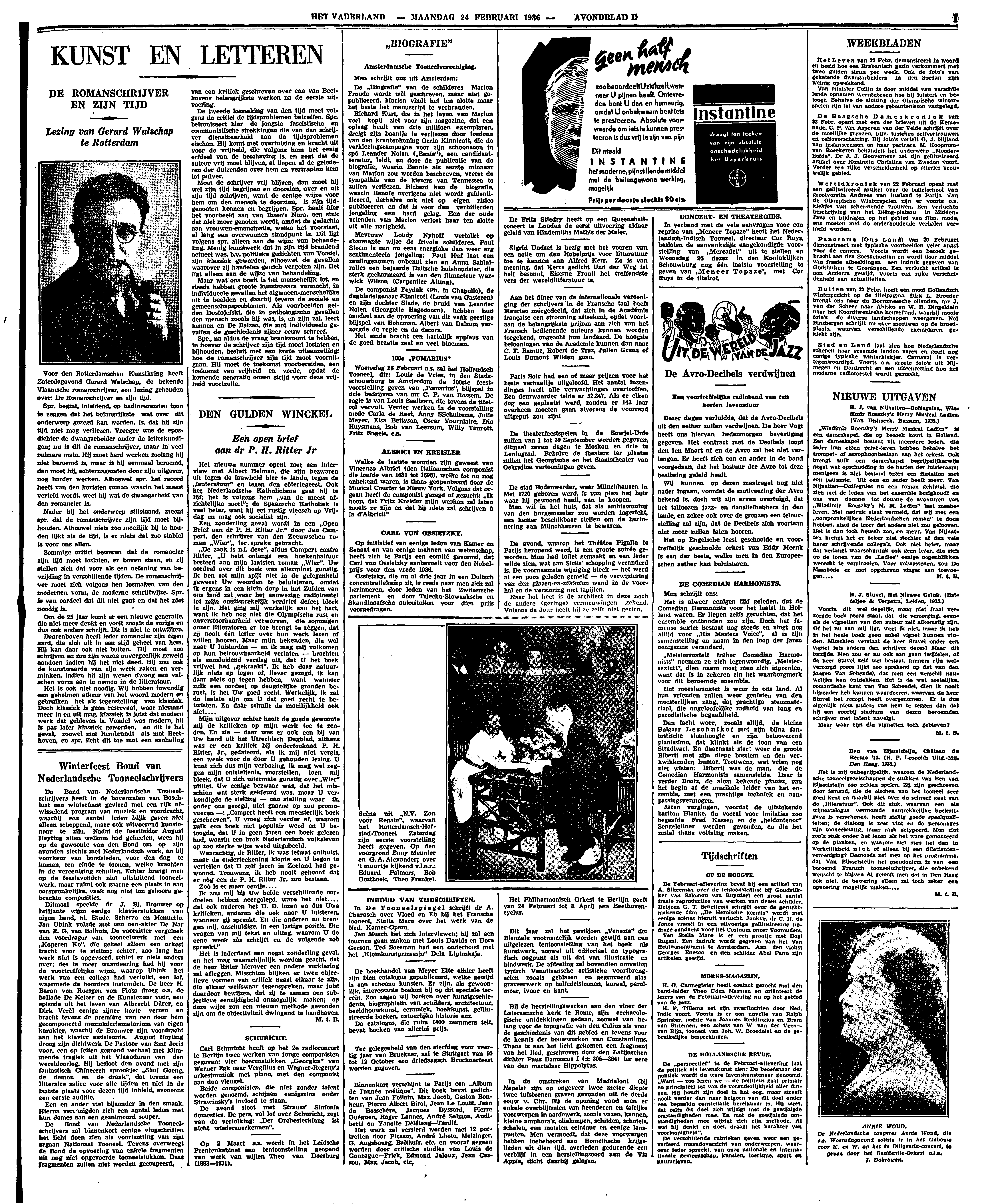 ‘Wladimir Roeszky's Merry Musical Ladies’ is een dameskapel, die op bezoek komt in Holland. Een dameskapel bestaat uit meerdere ieden, die ieder hun eigen privé-leven hebben behalve het trompet- of saxophoonbestaan van het orkest. Ook brengt zulk een dameskapel begrijpelijkerwijs nogal wat opschudding in de harten der luisteraars; menigeen is niet bestand tegen een flirtation met een pausante. Uit een en ander heeft mevr. Van Nijnatten - Doffegnies nu een roman geklutst, die zich met de leden van het ensemble bezighoudt en ons van douane tot douane de avonturen van ‘Wladimir Roeszky's M.M. Ladies’ laat meebeleven. Met nadruk staat vermeld, dat wij met een ‘oorspronkelijken Nederlandschen roman’ te doen hebben, alsof de lezer dat anders niet zou gelooven. Het is dan toch heusch zoo, en mevr. Van Nijnatten brengt het er zeker niet slechter af dan vele harer schrijvende collega's. Ook niet beter, maar dat verlangt waarschijnlijk ook geen lezer, die zich op de tonen van de ‘Ladies’ eenige oogenblikken wenscht te verstrooien. Voor volwassenen, zou De Maasbode er met opgeheven vinger aan toevoegen....