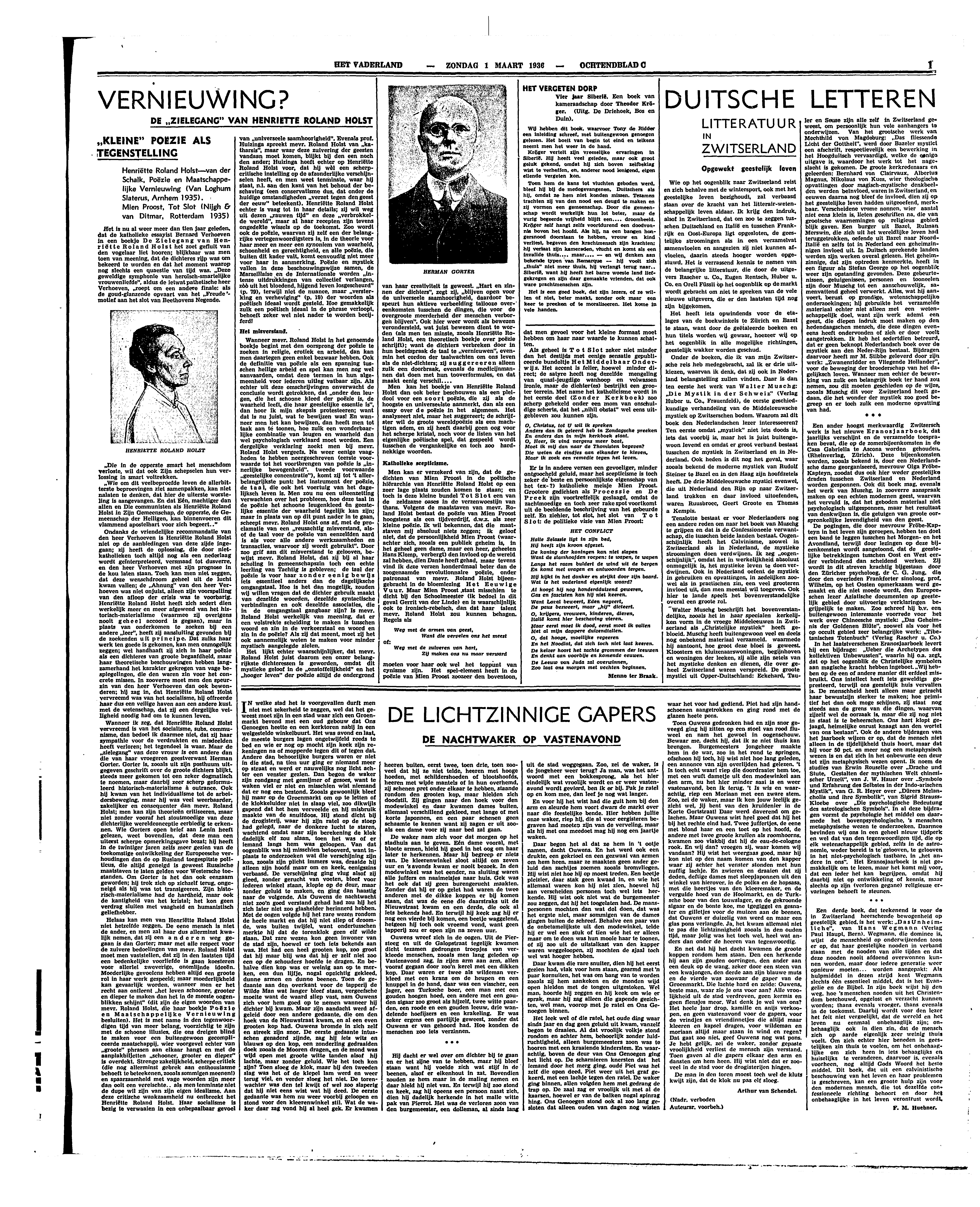 Het is nu al weer meer dan tien jaar geleden, dat de katholieke essayist Bernard Verhoeven in een boekje De Zielegang van Henriëtte Roland Holst het zoet gefluit van den vogelaar liet hooren; blijkbaar was men toen van meening, dat de dichteres rijp was om bekeerd te worden en dat het moment waarop nog slechts een quaestie van tijd was. ‘Deze geweldige symphonie van heroïsch-smartelijke vrouwenliefde’, aldus de ietwat pathetische heer Verhoeven, ‘roept om een andere finale: als de goud-glanzende opvaart van het “Freude” motief aan het slot van Beethovens Negende.