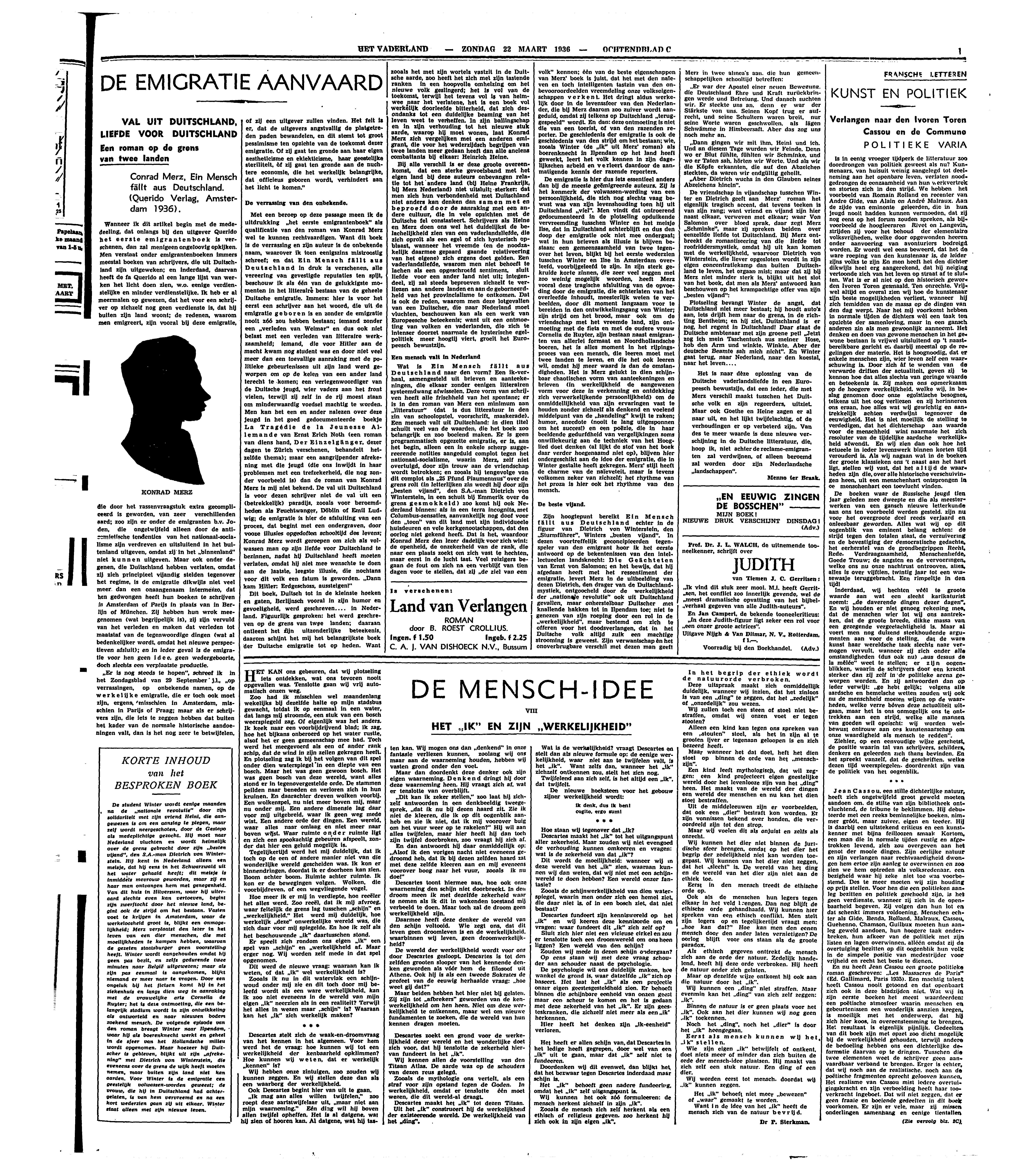 Wanneer ik dit artikel begin met de mededeeling, dat onlangs bij den uitgever Querido het eerste emigrantenboek is verschenen, dan zal menigeen ongeloovig opkijken. Men verstaat onder emigrantenboeken immers meestal boeken van schrijvers, die uit Duitschland zijn uitgeweken; en inderdaad, daarvan heeft de fa Querido al een lange lijst van werken het licht doen zien, w.o. eenige verdienstelijke en minder verdienstelijke. Ik heb er al meermalen op gewezen, dat het voor een schrijver op zichzelf nog geen verdienste is, dat hij buiten zijn land woont; de redenen, waarom men emigreert, zijn vooral bij deze emigratie, die door het rassenvraagstuk extra gecompliceerd is geworden, van zeer verschillenden aard; zoo zijn er onder de emigranten b.v. Joden, die ongetwijfeld alleen door de anti-semietische tendenties van het nationaal-socialisme zijn verdreven en uitsluitend in het buitenland uitgeven, omdat zij in het ‘binnenland’ niet kunnen uitgeven. Maar ook onder degenen, die Duitschland hebben verlaten, omdat zij zich principieel vijandig stelden tegenover het regime, is de emigratie dikwijls niet veel meer dan een onaangenaam intermezzo, dat hen gedwongen heeft hun boeken te schrijven in Amsterdam of Parijs in plaats van in Berlijn of München. Zij hebben hun wrok meegenomen (wat begrijpelijk is), zij zijn vervuld van het verleden en maken dat verleden tot maatstaf van de tegenwoordige dingen (wat al bedenkelijker wordt, omdat het nieuwe perspectieven afsluit); en in ieder geval is de emigratie voor hen geen idee, geen wedergeboorte, doch slechts een verplaatste productie.