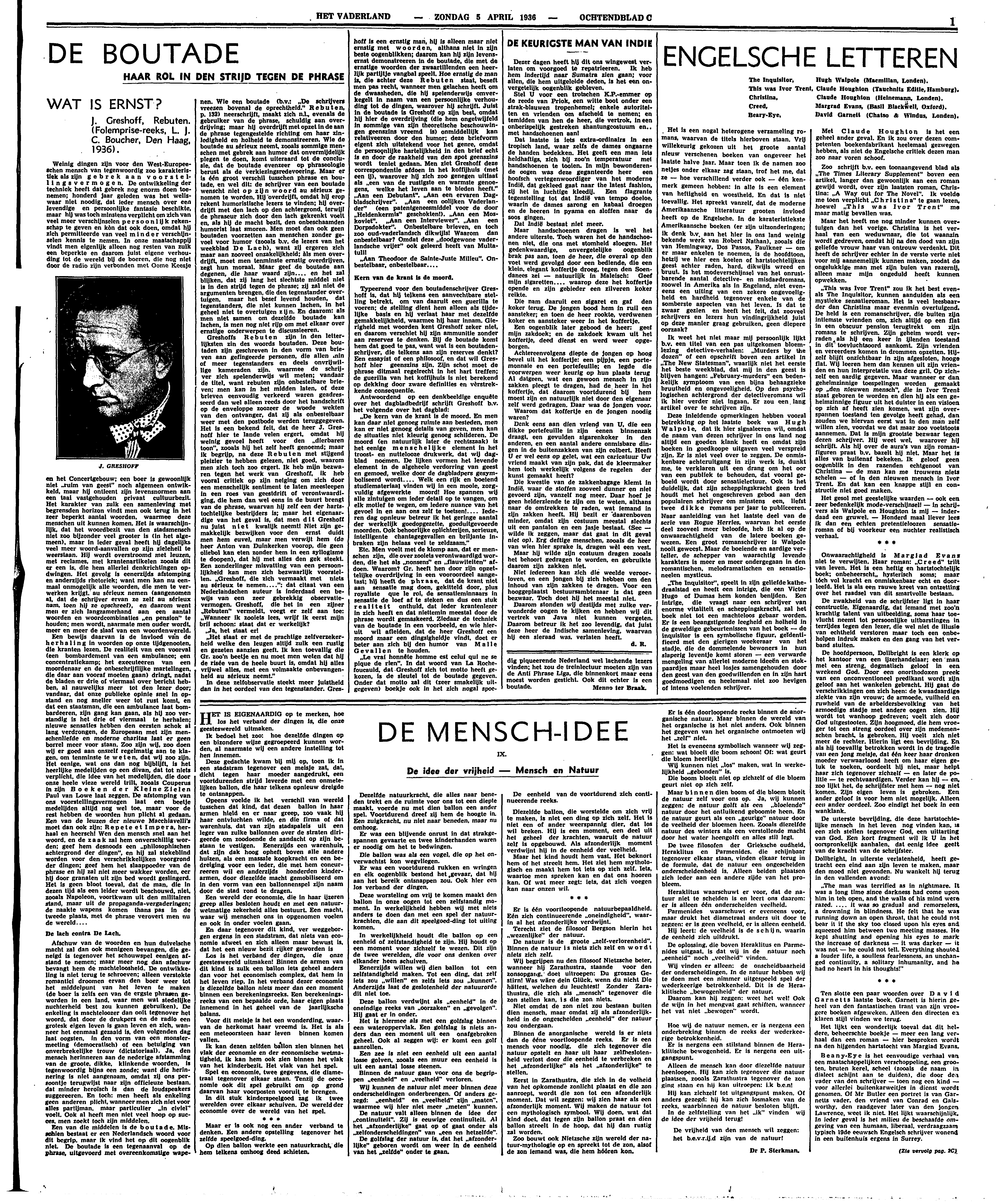 ‘Le vrai honnête homme est celui qui ne se pique de rien’. In dat woord van La Rochefoucauld, dat Greshoff zich tot motto heeft gekozen, is de sleutel tot de boutade gegeven. Onder dat motto zal dit (zeer smakelijk uitgegeven) boekje ook in het zich nogal spoedig piqueerende Nederland wel lachende lezers vinden; het zou de treinlectuur moeten zijn van de Anti Phrase Liga, die binnenkort maar eens moest worden gesticht. Ook dit echter is een boutade.