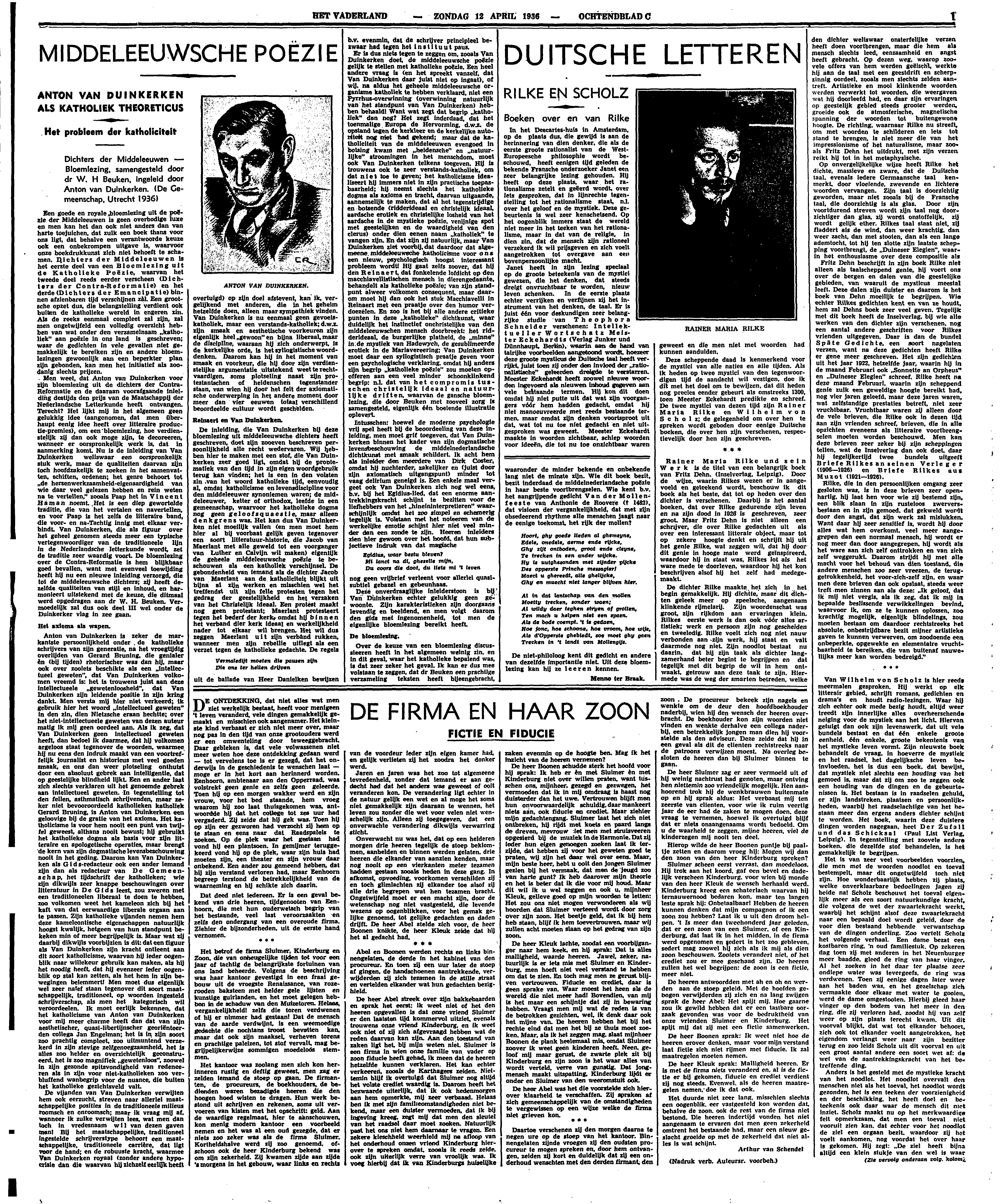 Men weet, dat Anton van Duinkerken voor zijn bloemlezing uit de dichters der Contra-Reformatie en de daaraan voorafgaande inleiding destijds den prijs van de Maatschappij der Nederlandsche Letterkunde heeft ontvangen. Terecht? Het lijkt mij in het algemeen geen gelukkig idee (aangenomen, dat men überhaupt eenig idee heeft over litteraire productie-premies), om een bloemlezing, hoe verdienstelijk zij dan ook moge zijn, te decoreeren, wanneer er oorspronkelijk werk is, dat in aanmerking komt. Nu is de inleiding van Van Duinkerken weliswaar een oorspronkelijk stuk werk, maar de qualiteiten daarvan zijn toch hoofdzakelijk te zoeken in het samenvatten, schiften, ordenen; het genre behoort tot ‘de hersenwerkzaamheid-eigenaardigheid van wie daar veel gelezen hebben en rein weten na te vertellen,’ zooals Paap het in Vincent Haman noemt. Het is een diep gewortelde traditie, die van het vertalen en navertellen, en voor Paap is het zelfs de litteraire band, die voor- en na-Tachtig innig met elkaar verbindt. Van Duinkerken, die als figuur over het geheel genomen steeds meer een typische vertegenwoordiger van de traditioneele lijn in de Nederlandsche letterkunde wordt, zet de traditie zeer waardig voort. De bloemlezing over de Contra-Reformatie is hem blijkbaar goed bevallen, want met evenveel toewijding heeft hij nu een nieuwe inleiding verzorgd, die tot de middeleeuwsche dichters; zij heeft dezelfde qualiteiten van stijl en inhoud, en harmonieert uitstekend met de keuze, die ditmaal werd opgedragen aan dr W.H. Beuken. Vermoedelijk zal dus ook deel III wel onder de Duinkerker vlag in zee gaan.