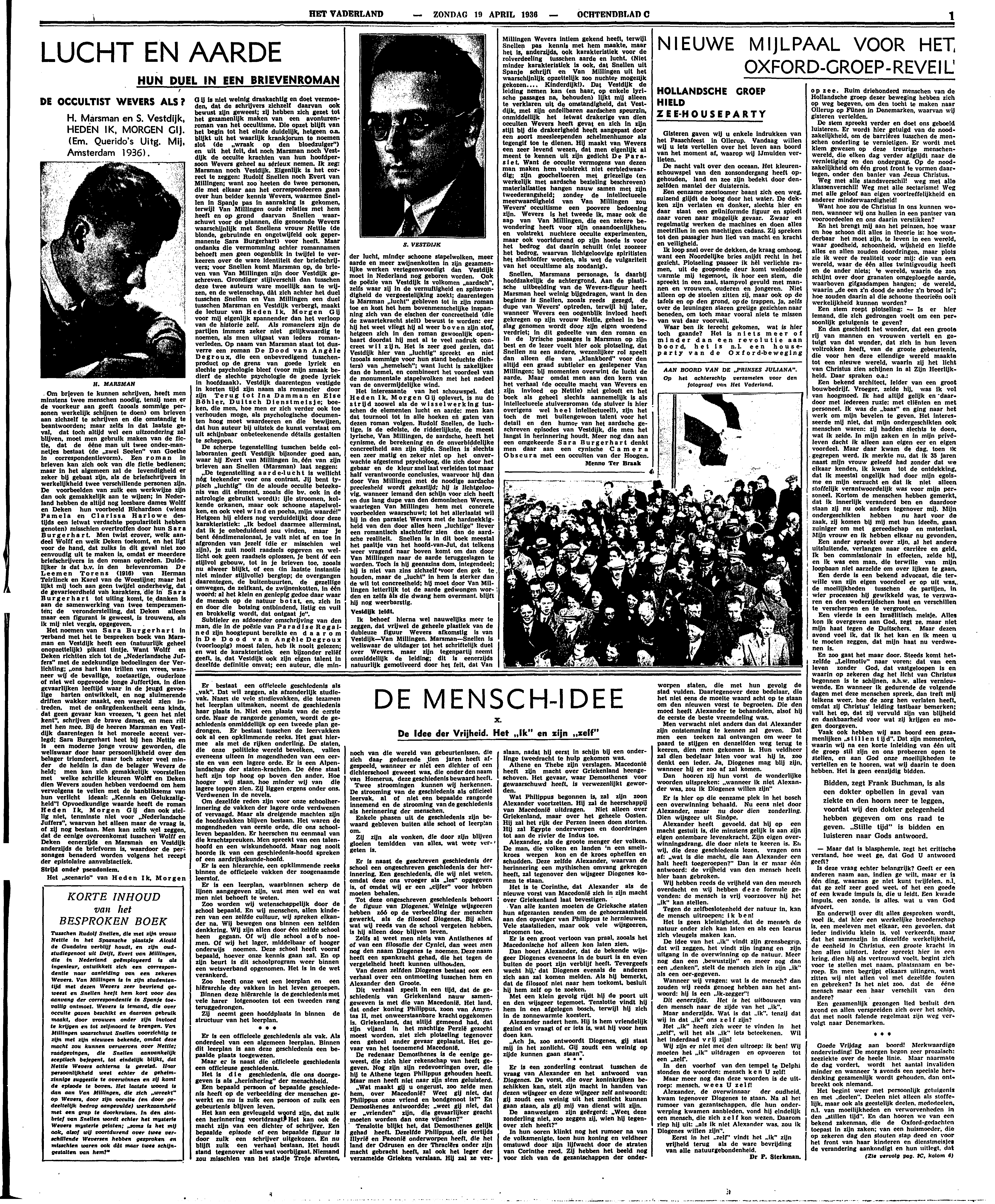 Het ‘scenario’ van Heden Ik, Morgen Gij is niet weinig draakachtig en doet vermoeden, dat de schrijvers zichzelf daarvan ook bewust zijn geweest; zij hebben zich gezet tot het gezamenlijk maken van een avonturenroman van het occultisme. Die opzet blijft van het begin tot het einde duidelijk, hetgeen o.a. blijkt uit het waarlijk krankjorum te noemen slot (de ‘wraak op den bloedzuiger’) en uit het feit, dat noch Marsman noch Vestdijk de occulte krachten van hun hoofdpersoon Wevers geheel au sérieux nemen. Ik zeg: Marsman noch Vestdijk. Eigenlijk is het correct te zeggen; Rudolf Snellen noch Evert van Millingen; want zoo heeten de twee personen, die met elkaar aan het correspondeeren gaan over hun beider kennis Wevers, waarmee Snellen in Spanje pas in aanraking is gekomen, terwijl Van Millingen oude relaties met hem heeft en op grond daarvan Snellen waarschuwt voor de plannen, die genoemde Wevers waarschijnlijk met Snellens vrouw Nettie (de blonde, gebruinde en ongetwijfeld ook gepermanente Sara Burgerhart) voor heeft. Maar ondanks die vermomming achter romannamen behoeft men geen oogenblik in twijfel te verkeeren over de ware identiteit der briefschrijvers; voor Snellen komt Marsman op, de brieven van Van Millingen zijn door Vestdijk geschreven. Grondiger stijlverschil dan tusschen deze twee auteurs ware moeilijk aan te wijzen, en de wetenschap, dàt zich achter het duel tusschen Snellen en Van Millingen een duel tusschen Marsman en Vestdijk verbergt, maakt de lectuur van Heden Ik, Morgen Gij voor mij eigenlijk spannender dan het verloop van de historie zelf. Als romanciers zijn de partijen immers zeker niet gelijkwaardig te noemen, als men uitgaat van ieders romanverleden. Op naam van Marsman staat tot dusverre een roman De Dood van Angèle Degroux, die een onbevredigend tusschenproduct op de grens van goede lyriek en slechte psychologie bleef (voor mijn smaak bedierf de slechte psychologie de goede lyriek in hoofdzaak). Vestdijk daarentegen vestigde in korten tijd zijn naam als romancier door zijn Terug tot Ina Damman en Else Böhler, Duitsch Dienstmeisje; boeken, die men, hoe men er zich verder ook toe verhouden moge, als psychologische documenten hoog moet waardeeren en die bewijzen, dat hun auteur bij uitstek de kunst verstaat om uit schijnbaar onbeteekenende détails gestalten te scheppen.