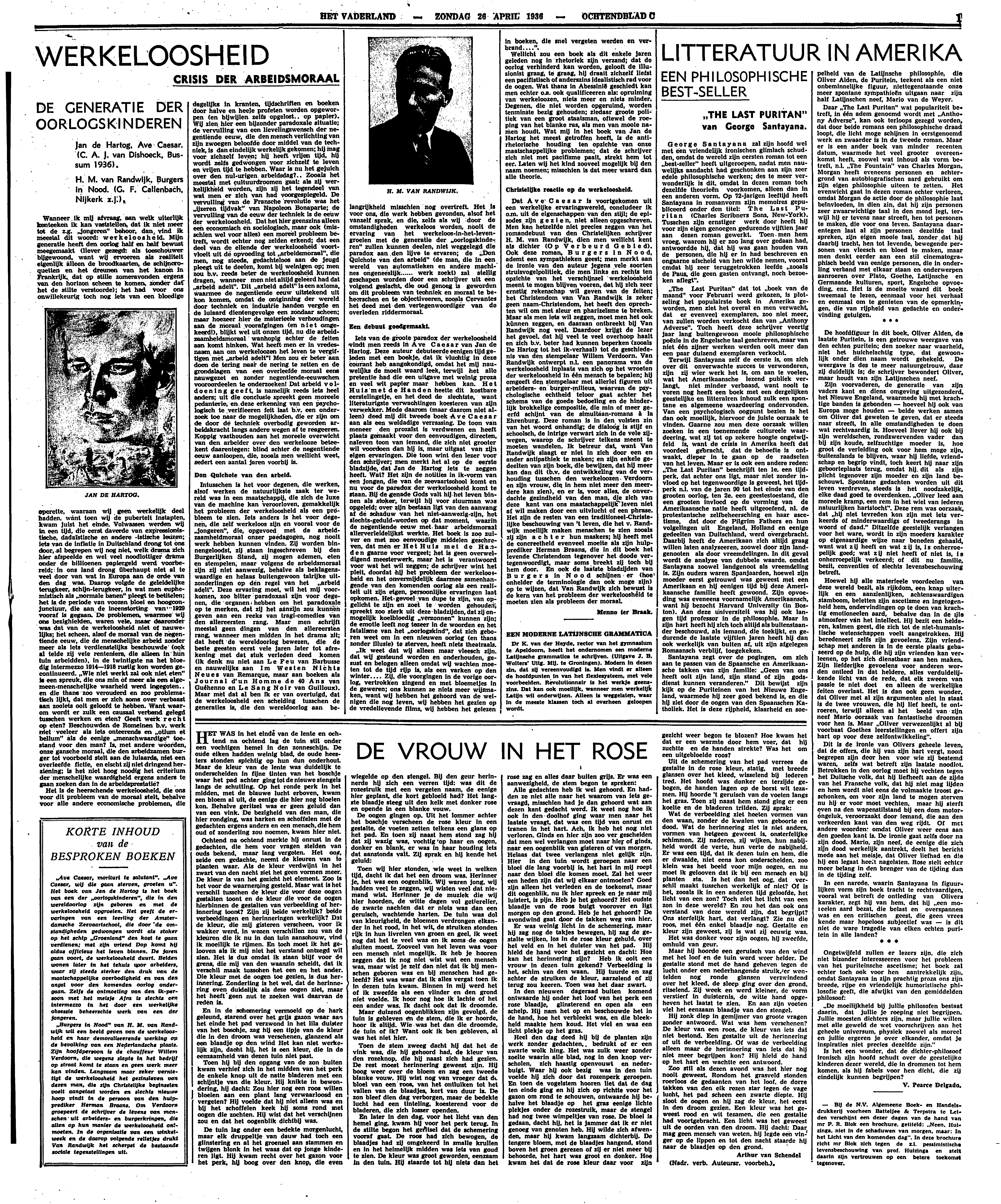 Iets van de groote paradox der werkeloosheid vindt men reeds in Ave Caesar van Jan de Hartog. Deze auteur debuteerde eenigen tijd geleden met een boekje, dat ik vluchtig in deze courant heb aangekondigd, omdat het mij nauwelijks de moeit waard leek, terwijl het alle pretentie had die een uitgave met weinig proza en veel wit papier maar hebben kan. Het Huis met de Handen heette dit kostbare eerstelingetje, en het deed de slechtste, want literaturigste verwachtingen koesteren van zijn verwekker. Mede daarom (maar daarom niet alleen) deed mij dit tweede boek Ave Caesar aan als een weldadige verrassing. De toon van meneer den prozaïst is verdwenen en heeft plaats gemaakt voor den eenvoudigen, directen, naïeven toon van iemand, die zich niet grooter wil voordoen dan hij is, maar uitgaat van zijn eigen ervaringen. Die toon wint den lezer voor den schrijver; men merkt het al op de eerste bladzijde, dat Jan de Hartog iets te zeggen heeft. Wat? Het zijn de notities in ik-vorm van een jongen, die van de zeevaartschool komt en nu voor de paradox der werkeloosheid komt te staan. Bij de genade Gods valt hij het leven binnen als stoker, terwijl hij voor stuurman was opgeleid; over zijn bestaan ligt van den aanvang af de schaduw van het niet-aanwezig-zijn, het slechts-geduld-worden op dat moment, waarin de negentiende eeuw met haar arbeidsmoraal allerverleidelijkst werkte. Het boek is zoo zuiver en met zoo eenvoudige middelen geschreven, dat men er Het Huis met de Handen gaarne voor vergeet; het is geen overweldigend meesterwerk, maar het is verantwoord voor wat het wil zeggen; de schrijver wint het pleit, doordat hij het probleem der werkeloosheid en het onvermijdelijk daarmee samenhangende van den komenden oorlog als een realiteit uit zijn eigen, persoonlijke ervaringen laat opkomen. Het gevoel van dupe te zijn, van opgelicht te zijn en zoet te worden gehouden, spreekt zoo sterk uit deze bladzijden, dat zij onmogelijk koelbloedig ‘verzonnen’ kunnen zijn; de emotie leeft nog tezeer in de woorden en het fatalisme van het ‘oorlogskind’, dat zich geboren weet om in een nieuwen oorlog (en thans zonder illusie) te sterven, heeft niets theatraals.