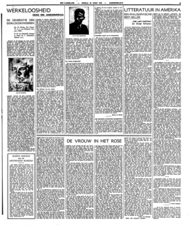 Intusschen is het voor degenen, die werken, alsof werken de natuurlijkste zaak ter wereld was in een maatschappij, die zich de luxe van de machine kan veroorloven, gemakkelijk het probleem der werkeloosheid als een probleem te zien. Iets anders is het voor degenen, die zelf werkeloos zijn en vooral voor de ‘jongeren’, die, opgevoed met de arbeidzaamheidmoraal onzer paedagogen, nog nooit werk hebben kunnen vinden. Zij worden binnengeloodst, zij staan ingeschreven bij den Burgerlijken Stand, zij mogen ademen, eten en stempelen, maar volgens de arbeidsmoraal zijn zij niet aanwezig, behalve als beklagenswaardige en helaas buitengewoon talrijke uitzonderlingen op den regel van het ‘arbeid adelt’. Deze ervaring moet, wil het mij voorkomen, zoo bitter paradoxaal zijn voor degenen, die organen hebben om het paradoxale op te merken, dat zij het aanzijn zou kunnen geven aan een reeks van tragi-comedies van den allereersten rang. Maar men schrijft meestal geen dingen van den allereersten rang, wanneer men midden in het drama zit; dat heeft de wereldoorlog bewezen, die de beste geesten eerst vele jaren later tot afrekening met dat stuk verleden deed komen (ik denk nu niet aan Le Feu van Barbusse en nauwelijks aan Im Westen Nichts Neues van Remarque, maar aan boeken als Journal d'un Homme de 40 Ans van Guéhenno en Le Sang Noir van Guilloux). Maar met dat al ben ik er van overtuigd, dat de werkeloosheid een scheiding tusschen de generaties is, die den wereldoorlog aan belangrijkheid misschien nog overtreft. Het is voor ons, die werk hebben gevonden, alsof het vanzelf sprak, en die, zelfs als wij door de omstandigheden werkeloos worden, nooit de ervaring van het werkeloos-in-het-levengroeien met de generatie der ‘oorlogskinderen’ zullen kunnen deelen, niet weggelegd die paradox aan den lijve te ervaren; de ‘Don Quichote van den arbeid’ (de man, die in een wereld van automatieken en andere machines ongeneeslijk...... werk zoekt) zal stellig geschapen worden door een schrijver uit een volgend geslacht, die oud genoeg is geworden om dit probleem van techniek en moraal te beheerschen en te objectiveeren, zooals Cervantes het deed met den vertegenwoordiger van de overleden riddermoraal.