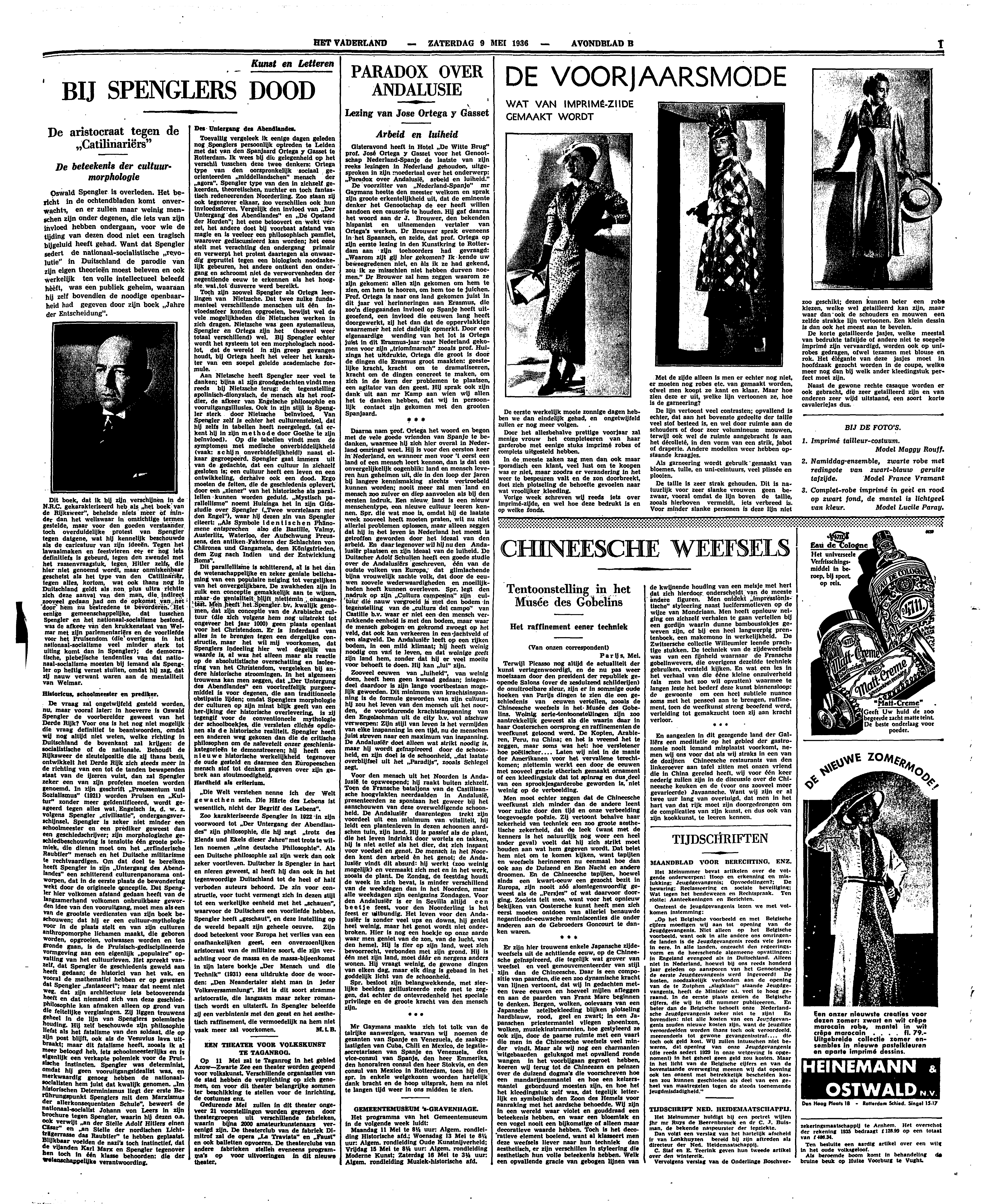 Oswald Spengler is overleden. Het bericht in de ochtendbladen komt onverwachts, en er zullen maar weinig menschen zijn onder degenen, die iets van zijn invloed hebben ondergaan, voor wie de tijding van dezen dood niet een tragisch bijgeluid heeft gehad. Want dat Spengler sedert de nationaal-socialistische ‘revolutie’ in Duitschland de parodie van zijn eigen theorieën moest beleven en ook werkelijk ten volle intellectueel beleefd hèèft, was een publiek geheim, waaraan hij zelf bovendien de noodige openbaarheid had gegeven door zijn boek ‘Jahre der Entscheidung’.