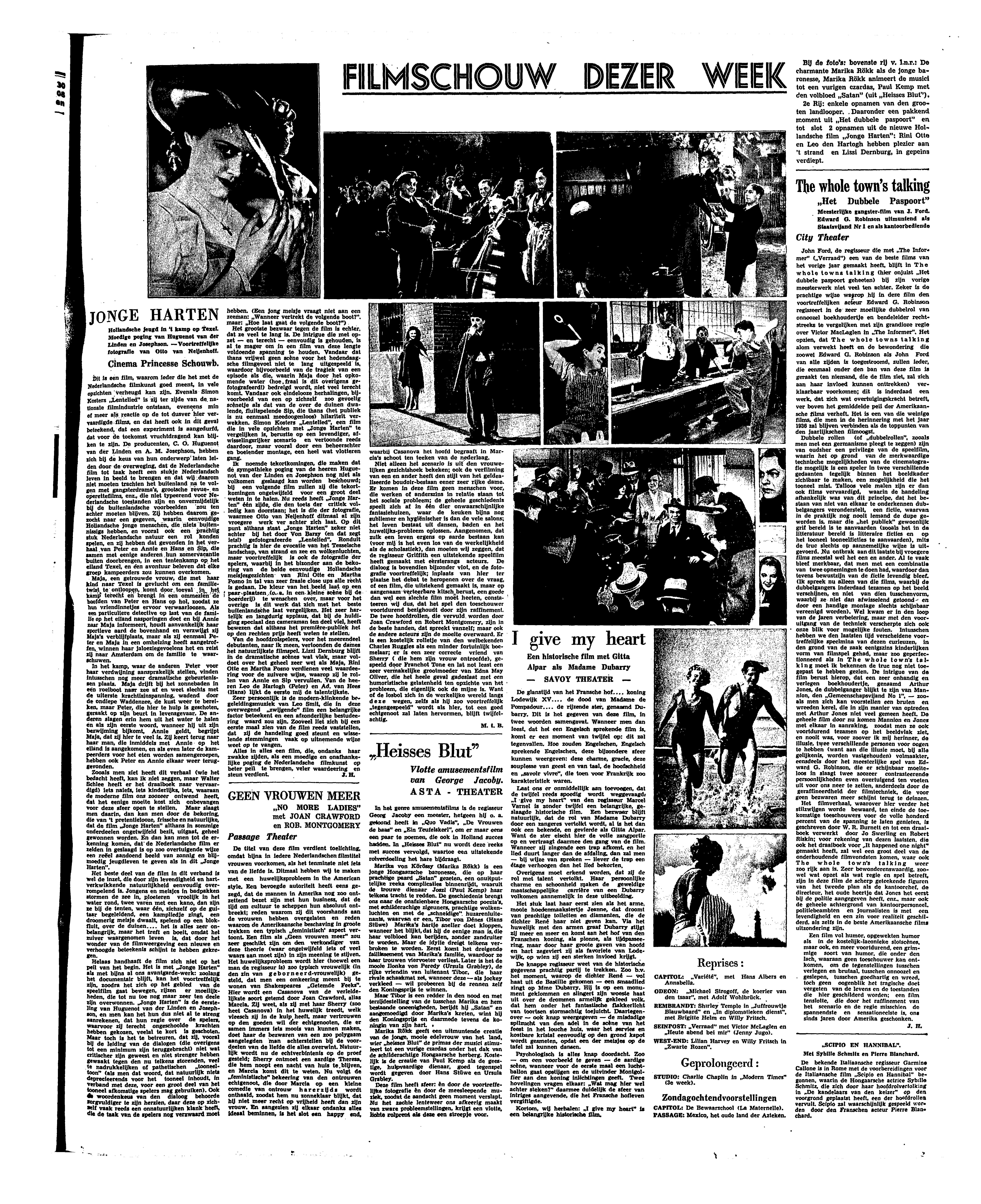De titel van deze film verdient toelichting, omdat bijna in iedere Nederlandschen filmtitel vrouwen voorkomen, als het tenminste niet iets van de liefde is. Ditmaal hebben wij te maken met een huwelijksprobleem in the American style. Een bevoegde autoriteit heeft eens gezegd, dat de mannen in Amerika nog zoo ontzettend bezet zijn met hun business, dat de tijd om cultuur te scheppen hun absoluut ontbreekt; reden waarom zij dit voorshands aan de vrouwen hebben overgelaten en reden waarom de Amerikaansche beschaving in groote trekken een typisch ‘feministisch’ aspect vertoont. Een film als ‘Geen vrouwen meer’ zou zeer geschikt zijn om den verkondiger van deze theorie (waar ongetwijfeld iets of veel waars aan moet zijn) in zijn meening te stijven. Het huwelijksprobleem wordt hier (hoewel een man de regisseur is) zoo typisch vrouwelijk (in den zin van geborneerd-vrouwelijk) gesteld, dat men een omkeering meent bij te wonen van Shakespeares ‘Getemde Feeks’. Hier wordt een Casanova van de verleidelijkste soort getemd door Joan Crawford, alias Marcia. Zij weet, als zij met haar Sherry (zoo heet Casanova) in het huwelijk treedt, welk vleesch zij in de kuip heeft, maar vertrouwen op den goeden wil der echtgenooten, die er samen immers iets moois van kunnen maken, doet haar de bezwaren van een zoo polygaam aangelegden man achterstellen bij de voordeelen van de liefde die alles overwint. Natuurlijk wordt nu de echtverbintenis op de proef gesteld; Sherry ontmoet een aardige Theresa, die hem noopt een nacht van huis te blijven, en Marcia komt dit te weten. Nu volgt de ‘feministische’ bekeering van den ontrouwen echtgenoot, die door Marcia op een kleine comedie van ontrouw harerzijds wordt onthaald, zoodat hem nu zonneklaar blijkt, dat hij niet meer recht op vrijheid heeft dan zijn vrouw. En aangezien zij elkaar ondanks alles ideaal beminnen, is het slot een happy end, waarbij Casanova het hoofd begraaft in Marcia's schoot ten teeken van de nederlaag.