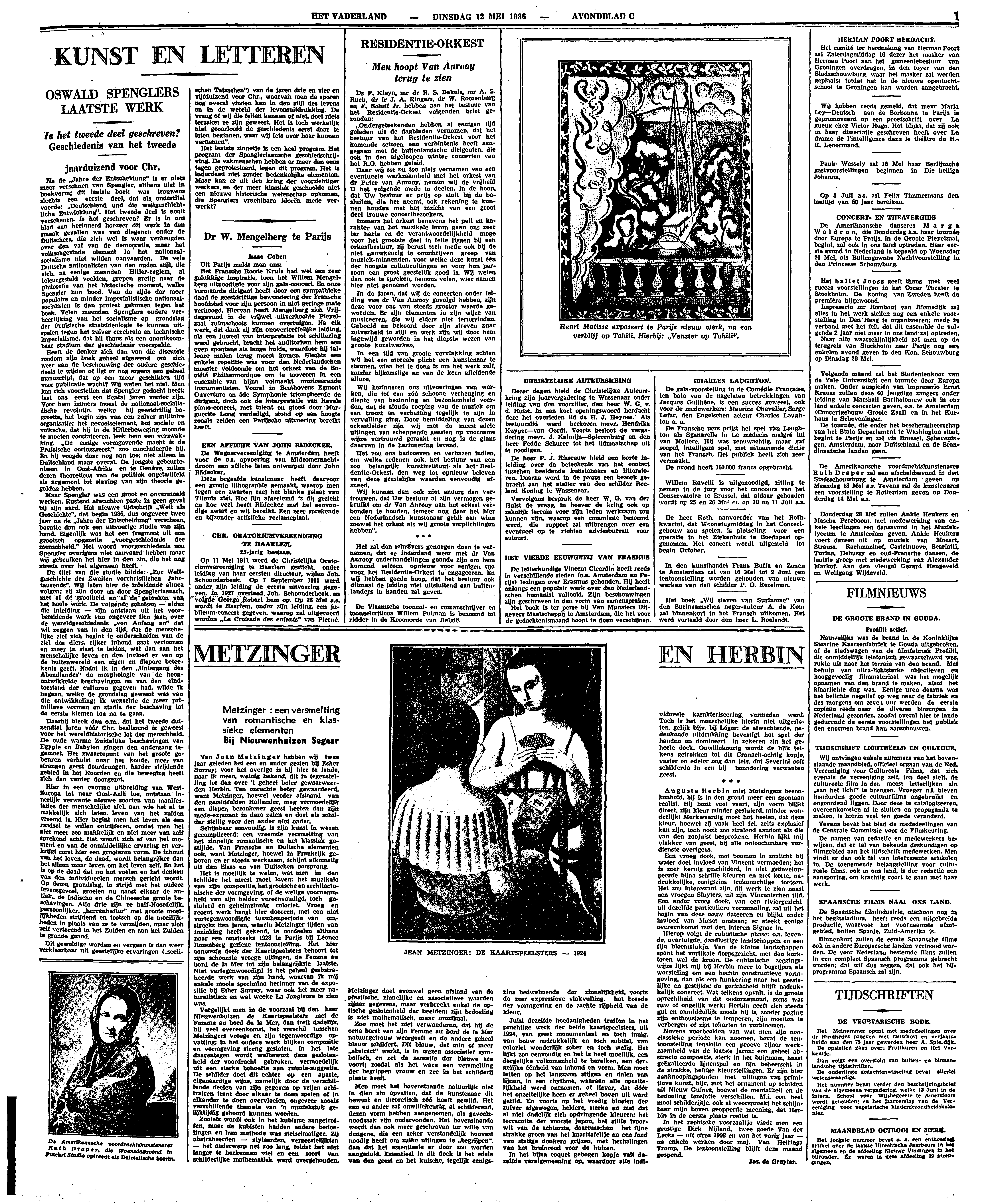 Na de ‘Jahre der Entscheidung’ is er niets meer verschnen van Spengler, althans niet in boekvorm; dit laatste boek was trouwens slechts een eerste deel, dat als ondertitel voerde: ‘Deutschland und die weltgeschichtliche Entwicklung’. Het tweede deel is nooit verschenen. Is het geschreven? Er is in ons blad aan herinnerd hoezeer dit werk in den smaak gevallen was van diegenen onder de Duitschers, die zich wel is waar verheugden over den val van de democratie, maar het volkschgezinde element in het nationaal-socialisme niet wilden aanvaarden. De vele Duitsche nationalisten van den ouden stijl, die zich, na eenige maanden Hitler-regiem, al teleurgesteld voelden, grepen gretig naar de philosofie van het historische moment, welke Spengler hun bood. Van de zijde der meer populaire en minder imperialistische nationaal-socialisten is dan protest gekomen tegen het boek. Velen meenden Spenglers oudere verheerlijking van het socialisme op grondslag der Pruisische staatsideologie te kunnen uitspelen tegen het zuiver cerebrale en technische imperialisme, dat hij thans als een onontkoombaar stadium der geschiedenis voorspelde.