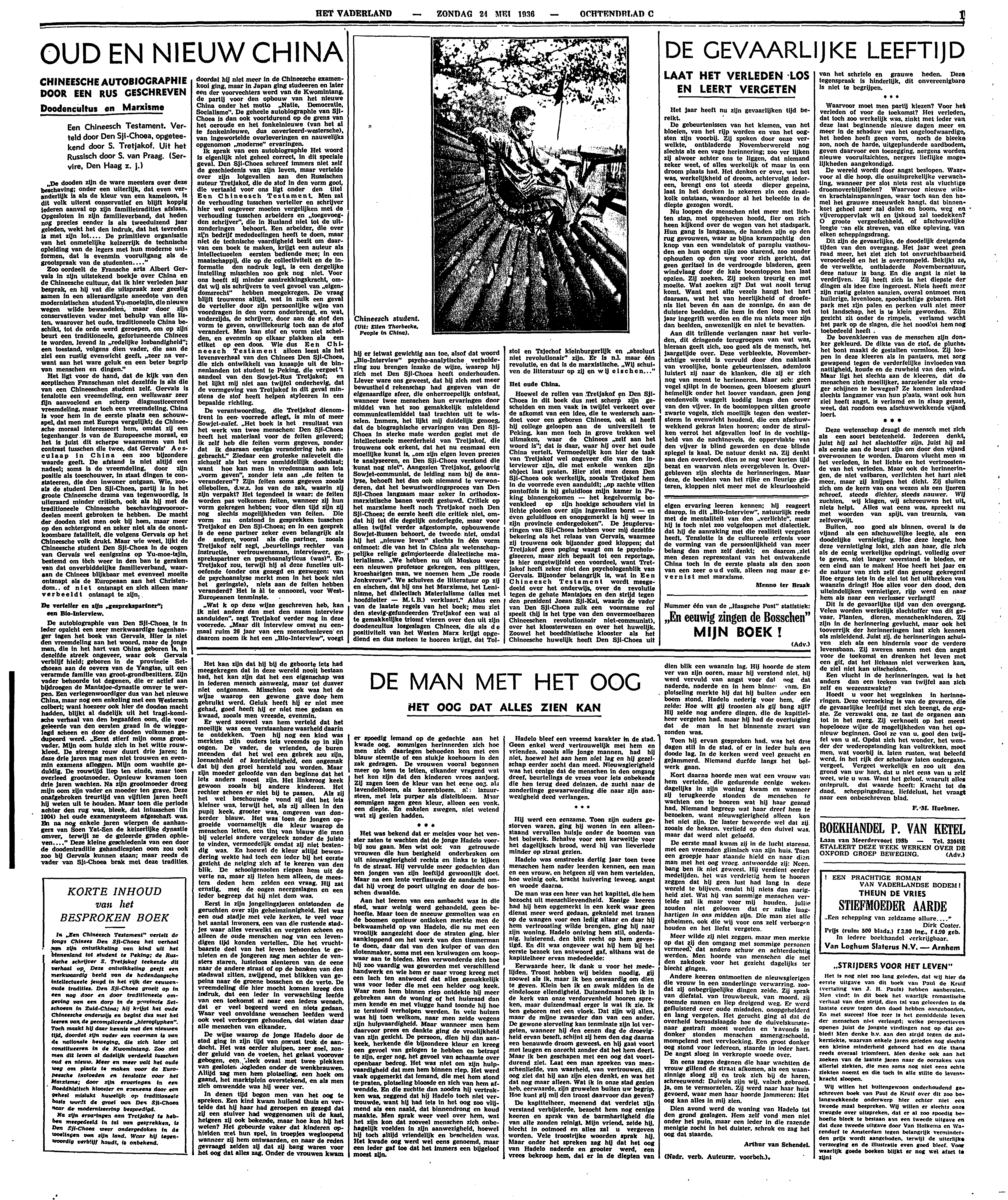 Hoewel de rollen van Tretjakof en Den Sji-Choea in dit boek dus met scherp zijn gescheiden en men vaak in twijfel verkeert over de afkomst van een idee, die te westersch aandoet voor een geboren Chinees, ook al heeft hij college geloopen aan de universiteit te Peking, kan men toch in grove trekken wel uitmaken, waar de Chinees ‘zelf aan het woord is’; dat is daar, waar hij over het oude China vertelt. Vermoedelijk kon hier de taak van Tretjakof wel ongeveer die van den interviewer zijn, die met enkele wenken zijn object laat praten. Hier ziet men dezen Den Sji-Choea ook werkelijk, zooals Tretjakof hem in de voorrede even aanduidt; ‘op zachte vilten pantoffels is hij geluidloos mijn kamer in Peking binnengekomen - het kegelvormig bovenkleed op zijn hoekige schouders viel in lichte plooien over zijn ingevallen borst - en even geluidloos en onopgemerkt is hij weer in zijn provincie ondergedoken’. De jeugdervaringen van Sji-Choea hebben voor mij dezelfde bekoring als het relaas van Gervais, waarmee zij trouwens ook bijzonder goed kloppen; dat Tretjakof geen poging waagt om te psychologiseeren, maar zich bepaalt tot een reportage, is hier ongetwijfeld een voordeel, want Tretjakof heeft zeker niet den psychologenblik van Gervais. Bijzonder belangrijk is, wat in Een Chineesch Testament wordt meegedeeld over het onderwijs, over de revolutie tegen de gehate Mantsjoes en den strijd tegen den president Joean Sji-Kai, waarin de vader van Den Sji-Choea zulk een voorname rol speelt (hij is het type van den onvermoeibaren Chineeschen revolutionnair niet-communist), over het kloosterwezen en over het huwelijk. Zoowel het boeddhistische klooster als het Chineesche huwelijk heeft Den Sji-Choea uit eigen ervaring leeren kennen; hij reageert daarop, in dit ‘Bio-Interview’, natuurlijk reeds met de mentaliteit van den ‘verlichte’, maar hij is toch niet zoo volgeloopen met dialectiek, dat hij de aanraking met die realiteit vergeten heeft. Tenslotte is de cultureele erfenis voor de vorming van de persoonlijkheid van meer belang dan men zelf denkt; en daarom ziet men dezen representant van het ontwakende China toch in de eerste plaats als den zoon van een zeer oud volk, alleen nog maar gevernist met marxisme.