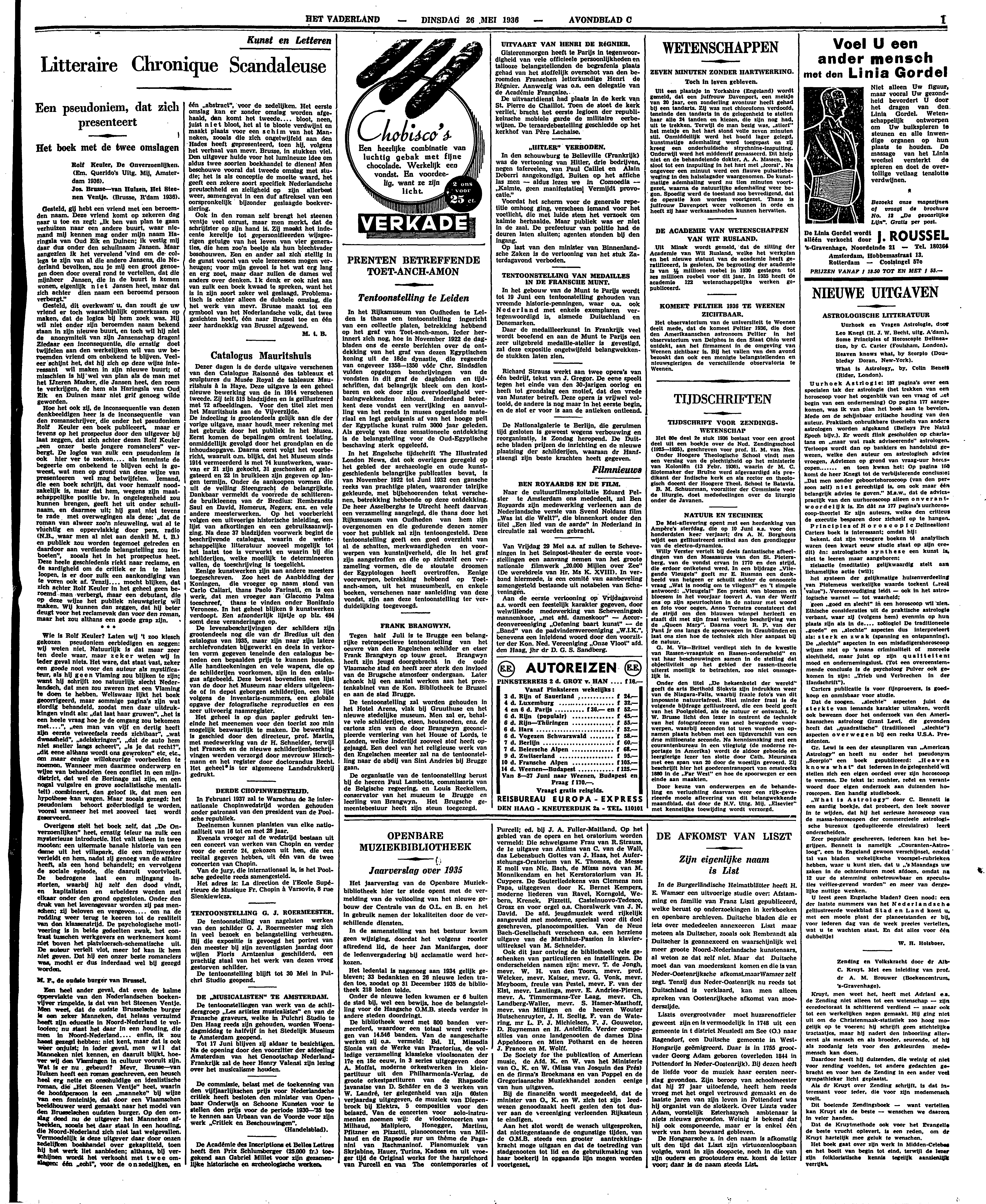 Hoe het ook zij, de inconsequentie van dezen denkbeeldigen heer is de inconsequentie van den romanschrijver, die onder het pseudoniem Rolf Keuler een boek publiceert, maar er tevens op het prospectus door den uitgever bij laat zeggen, dat zich achter dezen Rolf Keuler ‘een onzer beste jongere romanciers’ verbergt. De logica van zulk een pseudoniem is ook hier ver te zoeken.... als tenminste de begeerte om onbekend te blijven echt is geweest, wat men op grond van deze wijze van presenteeren wel mag betwijfelen. Iemand, die een boek schrijft, dat voor hemzelf noodzakelijk is, maar dat hem, wegens zijn maatschappelijke positie bv. in ongelegenheid zou kunnen brengen, geeft het uit onder schuilnaam, en daarmee uit; hij gaat niet tevens te rade met overwegingen als deze: ‘dat de roman van alweer zoo'n nieuweling, wat al te vluchtig en oppervlakkig door pers, radio (N.B., waar men al niet aan denkt! M.t.B.) en publiek zou worden tegemoet getreden en daardoor aan verdiende belangstelling zou inboeten’, zooals het in het prospectus heet. Deze heele geschiedenis riekt naar reclame, en de aardigheid om de critiek er in te laten loopen, is er door zulk een aankondiging van te voren ook af. Tenzij.... mocht blijken, dat zich achter Rolf Keuler in het geheel geen beroemd man verbergt, maar een debutant, die op deze wijze het publiek nieuwsgierig wil maken. Wij kunnen dan zeggen, dat hij beter deugt voor het reclamevak dan voor den roman, maar het zou althans een goede grap zijn.