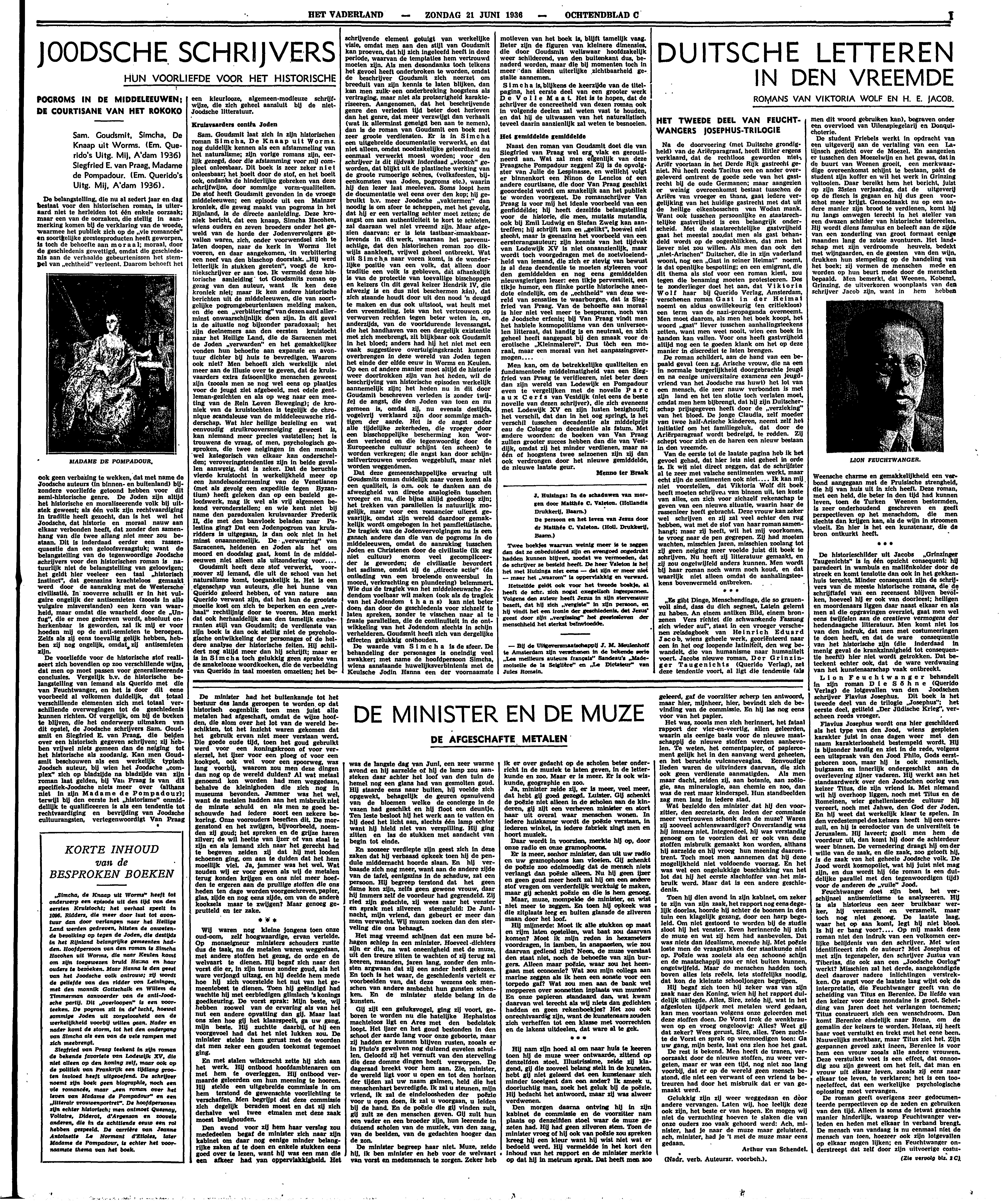 De voorliefde voor de historische stof realiseert zich bovendien op zoo verschillende wijze, dat men op moet passen voor generaliseerende conclusies. Vergelijk b.v. de historische belangstelling van iemand als Querido met die van Feuchtwanger, en het is door dit eene voorbeeld al volkomen duidelijk, dat totaal verschillende elementen zich met totaal verschillende overwegingen tot de geschiedenis kunnen richten. Of vergelijk, om bij de boeken te blijven, die het onderwerp uitmaken van dit opstel, de Joodsche schrijvers Sam. Goudsmit en Siegfried E. van Praag, die beiden over een historisch gegeven schrijven; zij hebben vrijwel niets gemeen dan de neiging tot het historische als zoodanig. Kan men Goudsmit beschouwen als een werkelijk typisch Joodsch auteur, bij wien het Joodsche ‘complex’ zich op bladzijde na bladzijde van zijn roman laat gelden, bij Van Praag is van dit specifiek-Joodsche niets meer over (althans niet in zijn Madame de Pompadour); terwijl bij den eerste het ‘historisme’ onmiddellijk te qualificeeren is als een tendentie tot rechtvaardiging en bevrijding van Joodsche cultuurangsten, vertegenwoordigt Van Praag een kleurlooze, algemeen-modieuze schrijfwijze, die zich geheel aansluit bij de niet-Joodsche litteratuur.