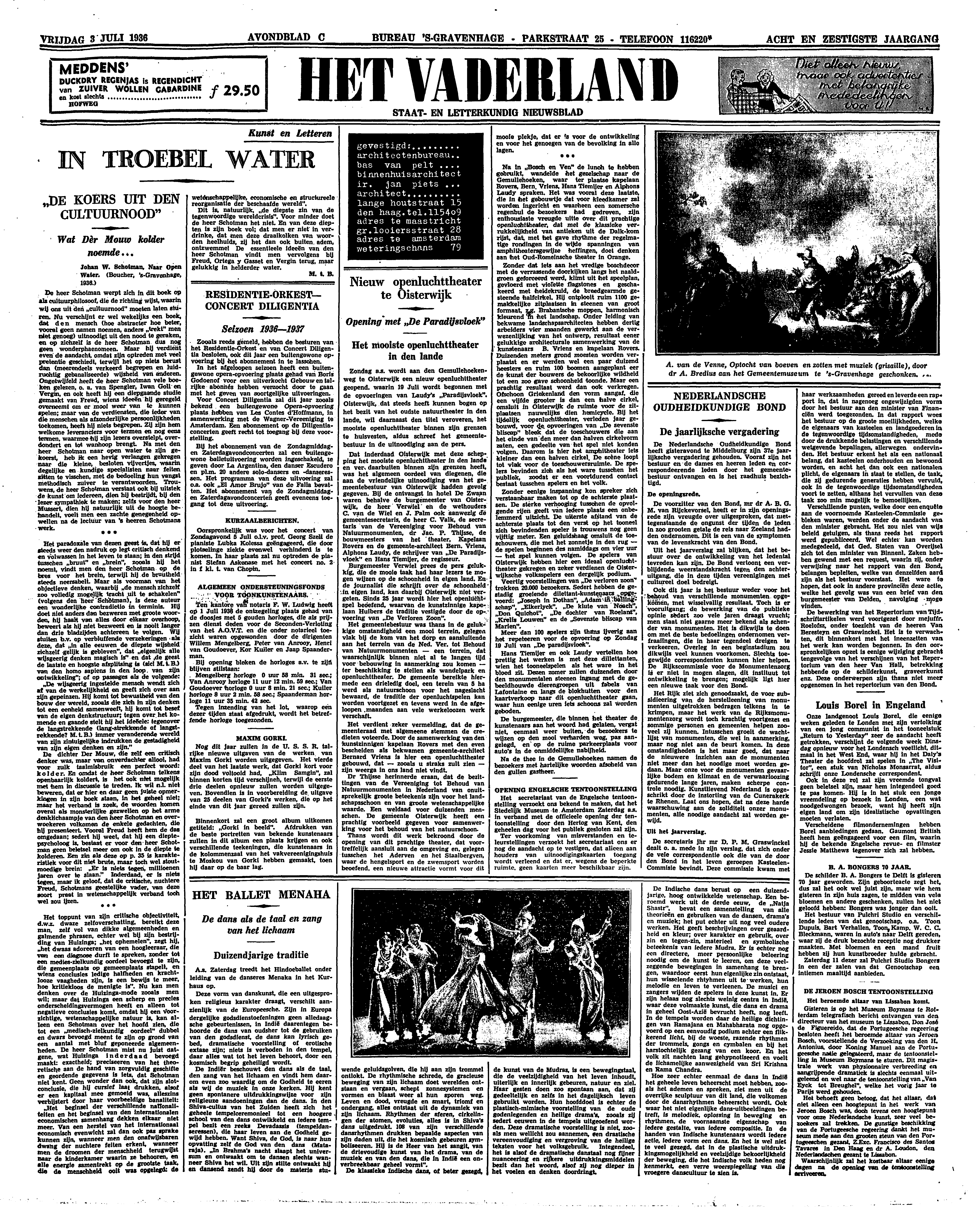 De heer Schotman werpt zich in dit boek op als cultuurphilosoof, die de richting wijst, waarin wij ons uit den ‘cultuurnood’ moeten laten sturen. Nu verschijnt er wel wekelijks een boek, dat den mensch (hoe abstracter hoe beter, vooral geen namen noemen, anders ‘trekt’ men niet genoeg) uitnoodigt uit den nood te geraken, en op zichzelf is de heer Schotman dus nog geen wonderphaenomeen. Maar hij verdient even de aandacht, omdat zijn optreden met veel pretentie geschiedt, terwijl het op niets berust dan (meerendeels verkeerd begrepen en luidruchtig gebanaliseerde) wijsheid van anderen. Ongetwijfeld heeft de heer Schotman vele boeken gelezen, o.a. van Spengler, Iwan Goll en Vergin, en ook heeft hij een diepgaande studie gemaakt van Freud, wiens ideeën hij geregeld overneemt om er mooi weer van te kunnen spelen; maar van de verdiensten, die ieder van die menschen als afzonderlijke persoonlijkheden toekomen, heeft hij niets begrepen. Zij zijn hem welkome leveranciers voor termen en nog eens termen, waarmee hij zijn lezers overstelpt, overdondert en tot wanhoop brengt. Na met den heer Schotman naar open water te zijn gekoerst, heb ik een hevig verlangen gekregen naar die kleine, besloten vijvertjes, waarin degelijke en kundige specialisten naar feiten zitten te visschen, met de bedoeling hun vangst methodisch zuiver te verantwoorden. Trouwens, de heer Schotman verstaat ook bij uitstek de kunst om iedereen, dien hij bestrijdt, bij den lezer sympathiek te maken; zelfs voor den heer Mussert, dien hij natuurlijk uit de hoogte behandelt, voelt men een zachte genegenheid opwellen na de lectuur van 's heeren Schotmans werk.