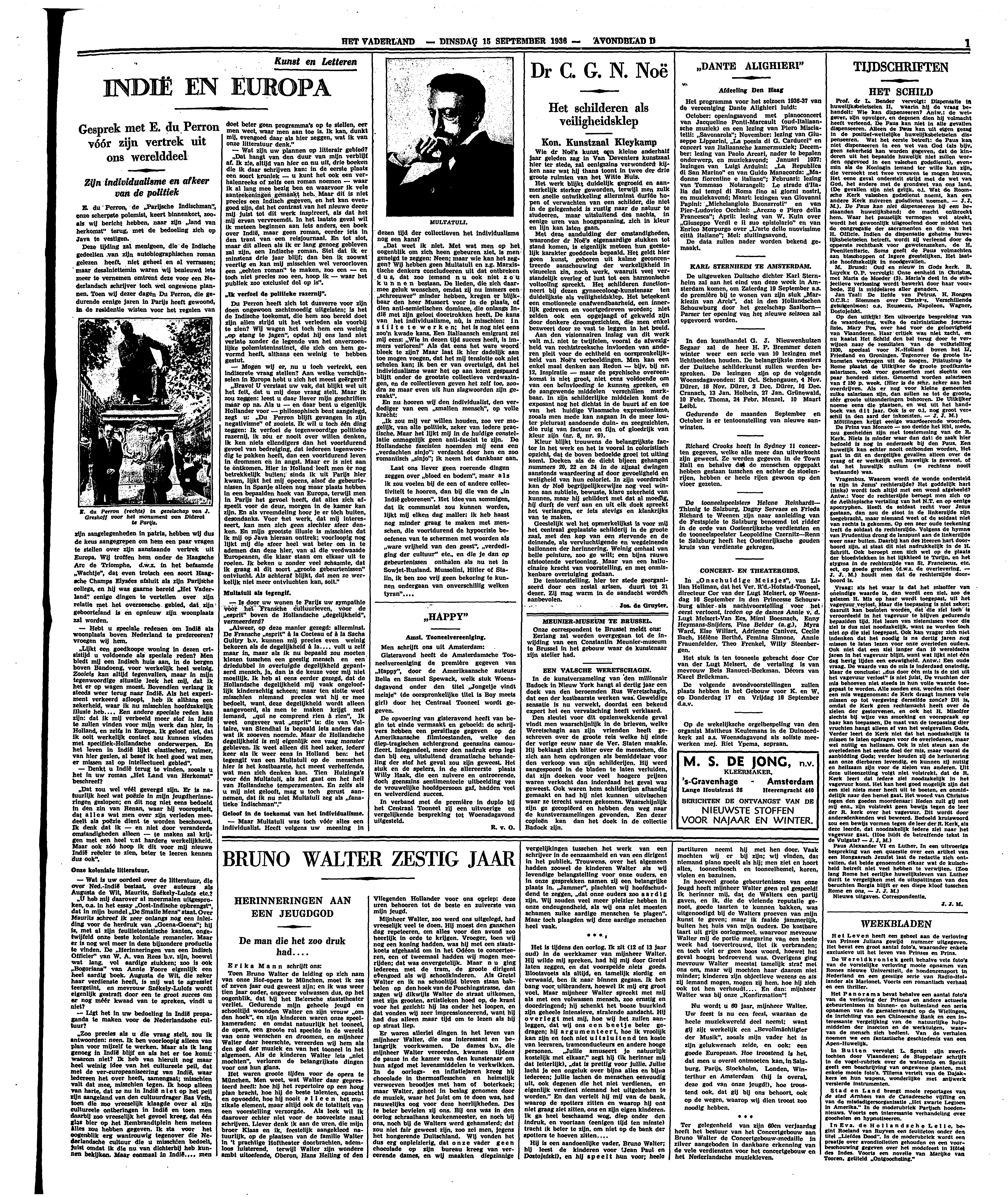 Deze tijding zal menigeen, die de Indische gedeelten van zijn autobiographischen roman gelezen heeft, niet geheel en al verrassen; maar desalniettemin waren wij benieuwd iets meer te vernemen omtrent deze voor een Nederlandsch schrijver toch wel ongewone plannen. Toen wij dezer dagen Du Perron, die gedurende eenige jaren in Parijs heeft gewoond, in de residentie wisten voor het regelen van zijn aangelegenheden in patria, hebben wij dus de keus aangegrepen om hem een paar vragen te stellen over zijn aanstaande vertrek uit Europa. Wij troffen hem onder de Haagsche Arc de Triomphe, d.w.z. in het befaamde ‘Wachtje’, dat even trotsch een soort Haagsche Champs Elysées afsluit als zijn Parijsche collega, en hij was gaarne bereid ‘Het Vaderland’ eenige dingen te vertellen over zijn relatie met het overzeesche gebied, dat zijn geboorteland is en opnieuw zijn woonplaats zal worden.