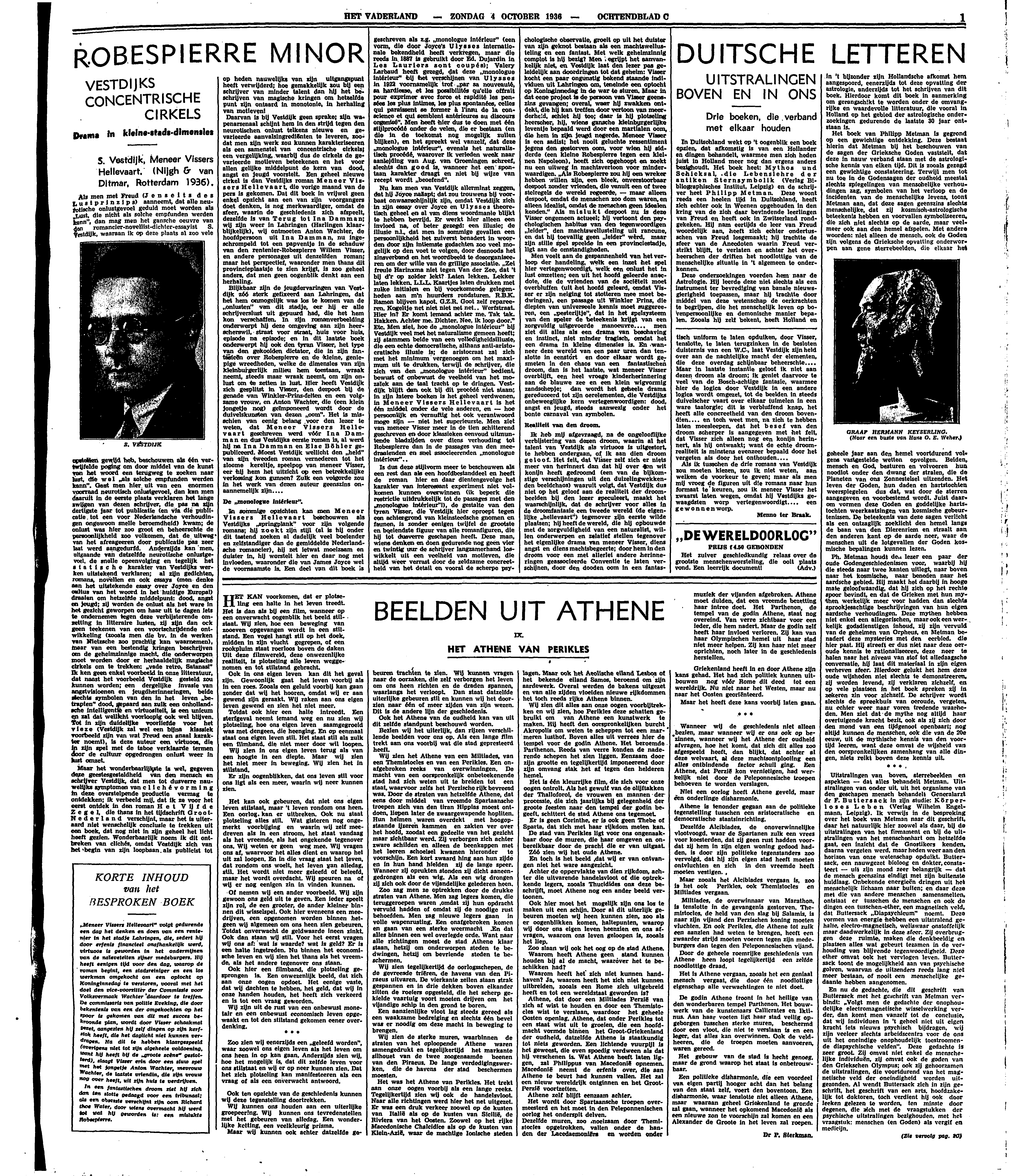 Als ik tusschen de drie romans van Vestdijk zou moeten kiezen, zou ik niet weten, aan welken de voorkeur te geven; maar als men mij vroeg de figuren uit die romans naar hun formaat te keuren, zou ik meneer Visser het zwaarst laten wegen, omdat hij Vestdijks gewaagdsten worp vertegenwoordigt.... een gewonnen worp.