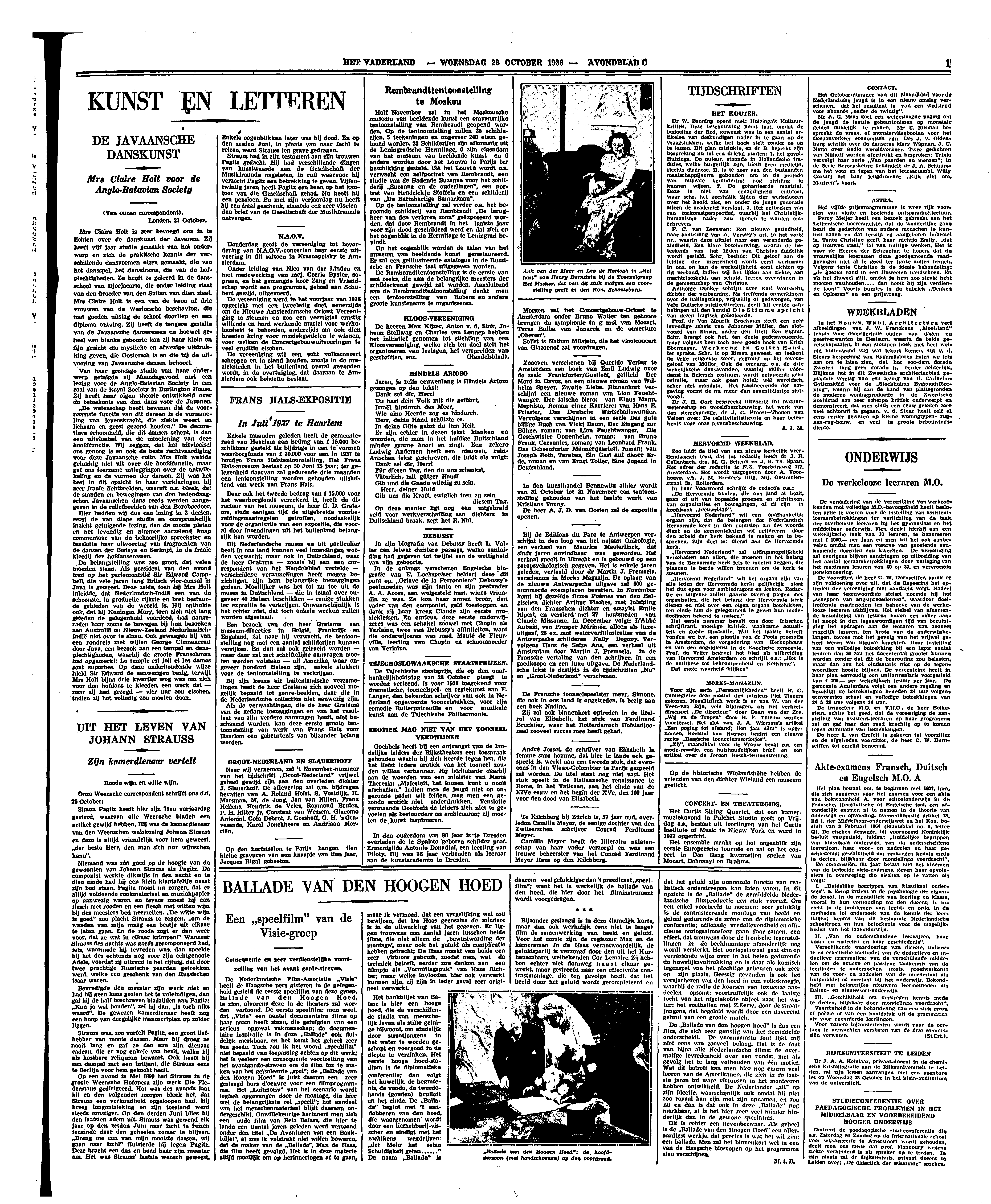 De Nederlandsche Film-Associatie ‘Visie’ heeft de Haagsche pers gisteren in de gelegenheid gesteld de eerste speelfilm van deze groep, Ballade van den Hoogen Hoed, te zien, alvorens deze in de theaters zal worden vertoond. De eerste speelfilm: men weet, dat ‘Visie’ een aantal documentaire films op haar naam heeft staan, die getuigden van een serieus opgevat vakmanschap; de documentaire inspiratie is in deze ‘Ballade’ ook duidelijk merkbaar, en het komt het geheel zeer ten goede. Toch zou ik het woord ‘speelfilm’ niet bepaald van toepassing achten op dit werk; het is veeleer een consequente voortzetting van het avantgarde-streven om de film los te maken van het geïsoleerde ‘spel’; de ‘Ballade van den Hoogen Hoed’ is juist daarom een zeer geslaagd hors d'oeuvre voor een filmprogramma. Het ‘Leitmotiv’ van het scenario wordt logisch opgevangen door de montage, die hier wel de belangrijkste rol ‘speelt’; het aandeel van het menschenmateriaal blijft daaraan ondergeschikt. Onwillekeurige herinnert men zich een oude film van Bela Balasz, die hier te lande een tiental jaren geleden werd vertoond onder den titel ‘De Avonturen van een Bankbiljet’, al zou ik volstrekt niet willen beweren, dat de maker van de ‘Ballade’, Max de Haas, die film heeft gevolgd. Het is in deze materie altijd moeilijk om op herinneringen af te gaan, maar ik vermoed, dat een vergelijking wel zou bewijzen, dat De Haas geenszins de mindere is in de uitwerking van het gegeven. Er liggen trouwens een aantal jaren tusschen beide films, die niet alleen de ‘bewustwording der montage’, maar ook het geluid als complicatie hebben getracht; De Haas maakt van beide een zeer virtuoos gebruik, zoodat men, wat de techniek betrest, eerder zou denken aan een filmpje als ‘Vormittagspuk’ van Hans Richter; maar welke invloeden hier ook verwerkt kunnen zijn, zij zijn in ieder geval zeer origineel verwerkt.