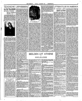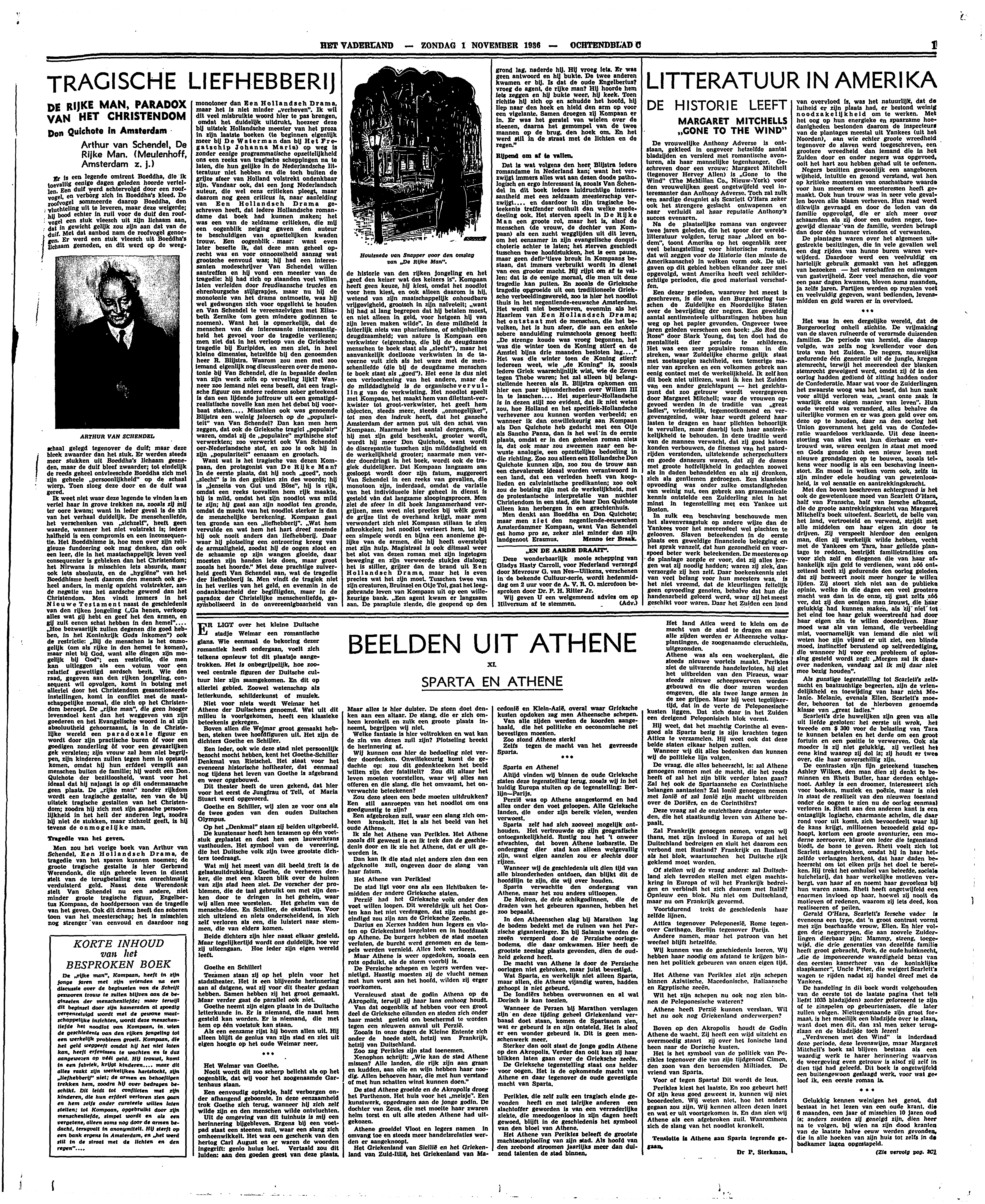 Dat is wat volgens den heer Blijstra iedere romandame in Nederland kan; want het verzwijgt immers alles wat aan dezen doode pathologisch en ergo interessant is, zooals Van Schendel in dit boek iedere luidruchtige interessantheid met een zeldzaam meesterschap verzwijgt.... en daardoor in zijn tragische beteekenis treffender onthult dan welke mededeeling ook. Het sterven speelt in De Rijke Man een groote rol, maar het is, alsof de menschen (de vrouw, de dochter van Kompaan) als een zucht wegglijden uit dit leven, om het eenzamer in zijn evangelische donquichoterie achter te laten; het sterven geschiedt tusschen twee hoofdstukken, het is een pauze, maar geen definitieve breuk in Kompaans bestaan, dat immers verbruikt wordt in dienst van een grooter macht. Hij rijpt om af te vallen: dat is de eenige moraal, die men uit deze tragedie kan putten. En zooals de Grieksche tragedie opgroeide uit een traditioneele Grieksche verbeeldingswereld, zoo is hier het noodlot thuis in het negentiende-eeuwsche Amsterdam. Het wordt niet beschreven, evenmin als het Haarlem van Een Hollandsch Drama; het ontstaat met de menschen, die het bevolken, het is hun sfeer, die aan een enkele sobere aanduiding ruimschoots genoeg heeft: ‘De strenge koude was vroeg begonnen, het was die winter toen de Koning stierf en de Amstel bijna drie maanden besloten lag....’ Het was die winter toen de Koning stierf: iedereen weet, wie ‘de Koning’ is, zooals iedere Griek waarschijnlijk wist, wie de Zeven tegen Thebe waren; het zal alleen bij belangstellende heeren als R. Blijstra opkomen om hier een paar bijzonderheden over Willem III in te lasschen.... Het superieur-Hollandsche is in dezen stijl zoo evident, dat ik niet weten zou, hoe Holland en het specifiek-Hollandsche verhevener zou kunnen worden verbeeld; en wanneer ik dan onwillekeurig aan Kompaan als Don Quichote heb gedacht met een Otje als Sancho Panza, dan is het wel in de eerste plaats, omdat er in den geheelen roman niets is, dat ook maar zou zweemen naar een bewuste analogie, een opzettelijke bedoeling in die richting. Zoo zou alleen een Hollandsche Don Quichote kunnen zijn, zoo zou de trouw aan een chevaleresk ideaal worden verantwoord in een land, dat een verleden heeft van kooplieden en calvinistische predikanten; zoo ook zou de botsing zijn met de werkelijkheid, met de protestantsche interpretatie van nuchter Christendom in een stad, die haar Don Quichote alleen kan herbergen in een grachtenhuis.