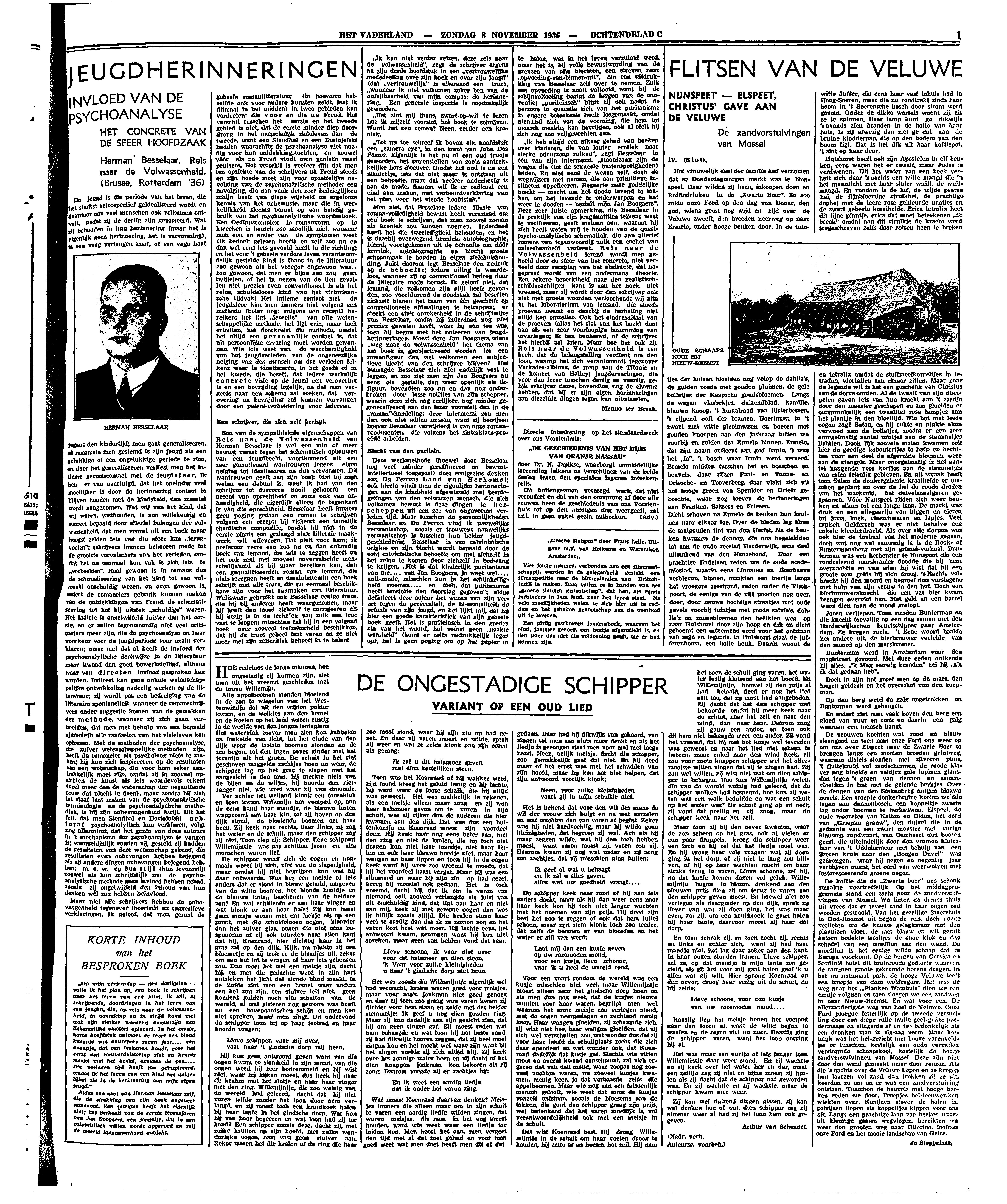 Een van de sympathiekste eigenschappen van Reis naar de Volwassenheid van Herman Besselaar is wel een min of meer bewust verzet tegen het schematisch opbouwen van een jeugdbeeld, voortkomend uit een zeer gemotiveerd wantrouwen jegens eigen neiging tot idealiseeren en dus vervormen. Dit wantrouwen geeft aan zijn boek (dat bij mijn weten een debuut is, want ik had van den schrijver tot dusverre nooit gehoord) een accent van oprechtheid en soms ook van onhandigheid, die eigenlijk alleen de tegenkant is vàn die oprechtheid. Besselaar heeft immers geen poging gedaan een roman te schrijven volgens een recept; hij riskeert een tamelijk chaotische compositie, omdat hij niet in de eerste plaats een geslaagd stuk litterair maakwerk wil afleveren. Dat pleit voor hem; ik prefereer verre een zoo nu en dan onhandig boek van iemand, die iets te zeggen heeft en het ook zegt met zooveel onvervalschte menschelijkheid als hij maar bereiken kan, dan een gequalificeerden roman van iemand, die niets tezeggen heeft en desalniettemin een boek schrijft met alle trucs, die nu eenmaal beschikbaar zijn voor het aanmaken van litteratuur. Weliswaar gebruikt ook Besselaar eenige trucs, die hij bij anderen heeft waargenomen, maar hij heeft den moed zichzelf te corrigeeren als hij bezig is in de techniek van zulk een truc vast te loopen; misschien zal hij in een volgend boek over zooveel trefzekerheid beschikken, dat hij de trucs geheel laat varen en ze niet meer met zijn zelfcritiek behoeft in te halen!