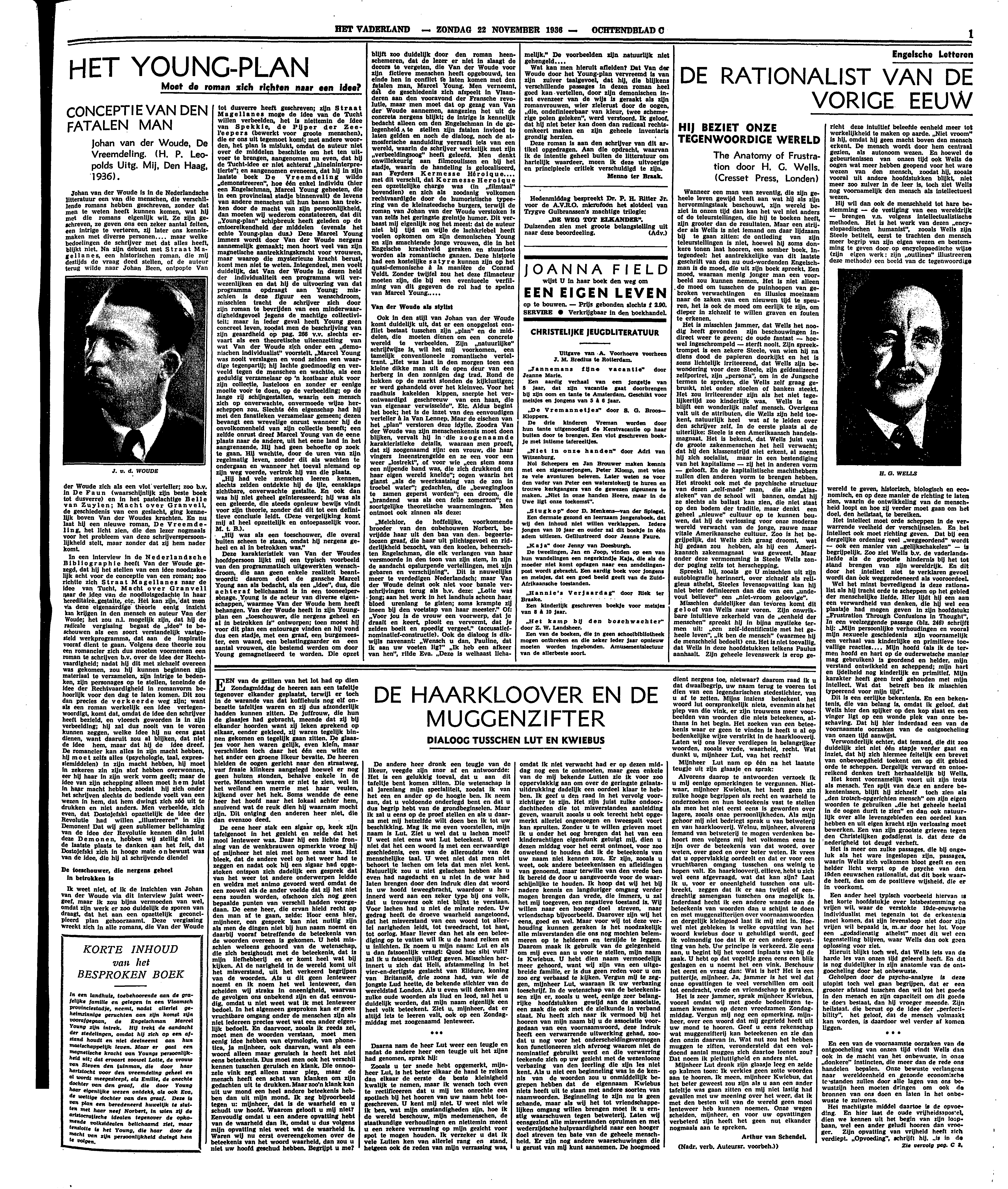 Ik weet niet, of ik de inzichten van Johan van der Woude via dit interview juist weergeef, maar ik zou bijna vermoeden van wel, omdat zijn werk er zoo duidelijk de sporen van draagt, dat het aan een opzettelijk geconcipieerd plan gehoorzaamt. Deze vergissing wreekt zich in alle romans, die Van der Woude tot dusverre heeft geschreven; zijn Straat Magellanes moge de idee van de Tucht willen verbeelden, het is niettemin de idee van Spekkie, de Pijper der Zee-l'eepers (bewerkt voor groote menschen), die er ons uit tegemoet komt; met andere woorden, het plan is mislukt, omdat de auteur niet over de middelen beschikte om het ten uitvoer te brengen, aangenomen nu even, dat hij de Tucht-idee er niet achteraf ‘hineininterpretierte’; en aangenomen eveneens, dat hij in zijn laatste boek De Vreemdeling wilde ‘demonstreeren’, hoe één enkel individu (hier een Engelschman, Marcel Young geheeten, die in een provinciaal stadje binnenvalt) de levens van andere menschen uit hun banen kan trekken door de macht van zijn persoonlijkheid, dan moeten wij wederom constateeren, dat dit ‘Young-plan’ schipbreuk heeft geleden op de ontoereikendheid der middelen (evenals het echte Young-plan dus.) Deze Marcel Young immers wordt door Van der Woude nergens aannemelijk gemaakt; men hoort veel van zijn magnetische aantrekkingskracht voor vrouwen, maar waarop die mysterieuze kracht berust, komt men niet te weten. Integendeel, men voelt duidelijk, dat Van der Woude in dezen held der individualiteit een programma wil verwezenlijken en dat hij de uitvoering van dat programma opdraagt aan Young; misschien is deze figuur een wenschdroom, misschien tracht de schrijver zich door zijn roman te bevrijden van een minderwaardigheidsgevoel jegens de machtige collectiviteit: maar in ieder geval heeft Young geen concreet leven, zoodat men de beschrijving van zijn geaardheid op pag. 266 v.v. slechts ervaart als een theoretische uiteenzetting van wat Van der Woude zich onder een ‘demonischen individualist’ voorstelt. ‘Marcel Young was nooit verslagen en vond zelden een waardige tegenpartij; hij lachte goedmoedig en verveeld tegen de menschen en wachtte, als een geduldig verzamelaar op 'n kostbaar stuk voor zijn collectie, lusteloos en zonder er eenige moeite voor te doen, op de verbeelding; op de lange rij schijngestalten, waarin een mensch zich op onverwachte, onvermoede wijze herscheppen zou. Slechts één eigenschap had hij met den fanatieken verzamelaar gemeen; dezen bevangt een wrevelige onrust wanneer hij de onvolkomenheid van zijn collectie beseft; een zelfde onrust dreef Marcel Young van de eene plaats naar de andere, uit het eene land in het aangrenzende. Hij had geen behoefte op zoek te gaan. Hij wachtte, door de uren van zijn regelmatig leven, zonder dit als wachten te ondergaan en wanneer het toeval niemand op zijn weg voerde, vertrok hij van die plaats.