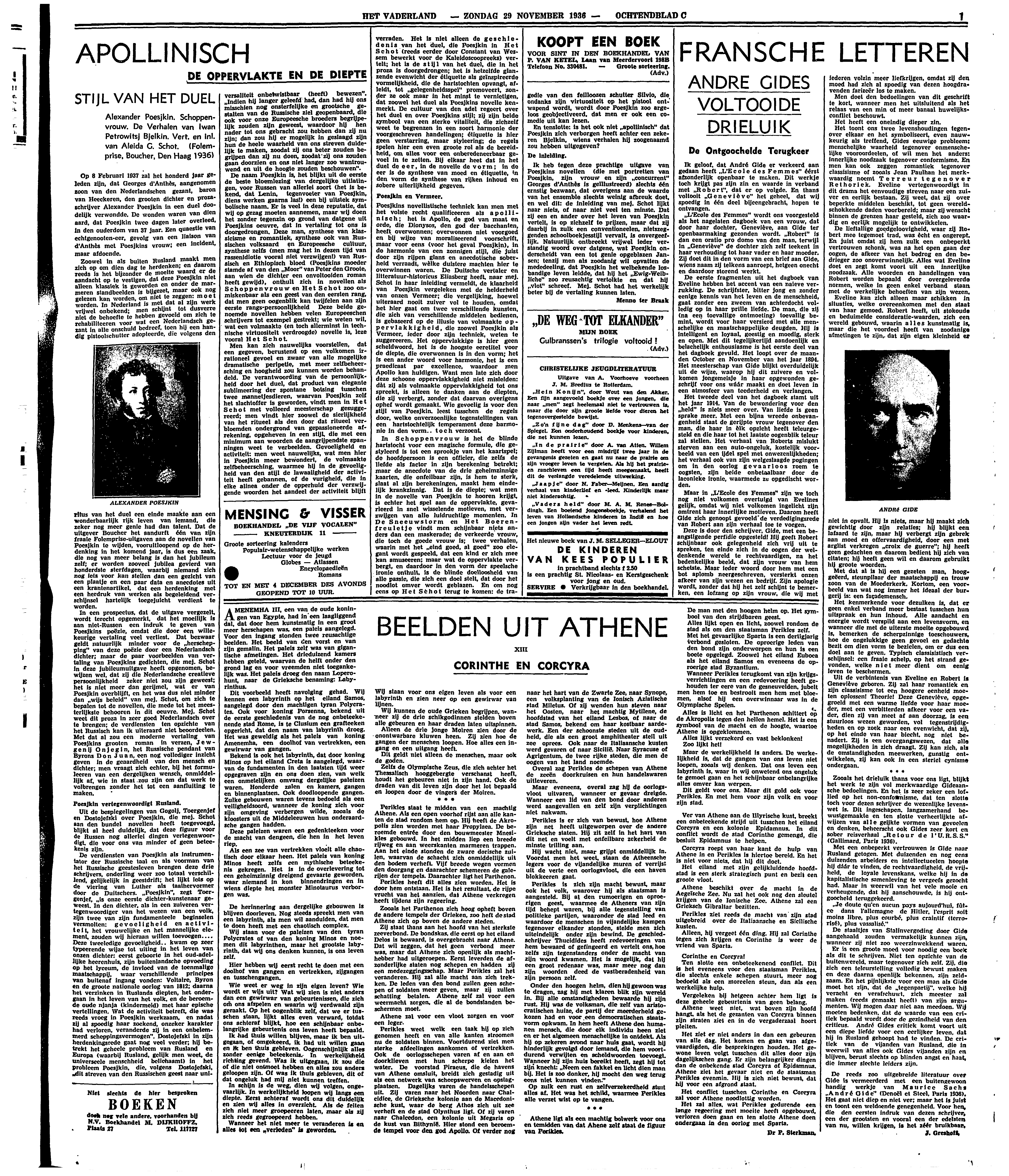 Ik heb tegen deze prachtige uitgave van Poesjkins novellen (die met portretten van Poesjkin, zijn vrouw en zijn ‘concurrent’ Georges d'Anthès is geïllustreerd) slechts één ernstig bezwaar, dat overigens aan de waarde van het ensemble slechts weinig afbreuk doet, en wel dit: de inleiding van mej. Schot lijkt naar niets, of naar niet veel ten minste. Dat zij een en ander over het leven van Poesjkin vertelt, is op zichzelf te prijzen, maar dat zij daarbij in zulk een conventioneelen, nietszeggenden schoolboekjesstijl vervalt, is onvergeeflijk. Natuurlijk ontbreekt vrijwel ieder verstandig woord over datgene, wat Poesjkin onderscheidt van een tot genie opgeblazen Jansen; tenzij men als zoodanig wil opvatten de mededeeling, dat Poesjkin het welbekende losbandige leven leidde, dat hij het ‘Ewig-Weibliche’ zoo reusachtig vertolkte en dat hij ‘vlot’ schreef. Mej. Schot had het werkelijk beter bij de vertaling kunnen laten.
