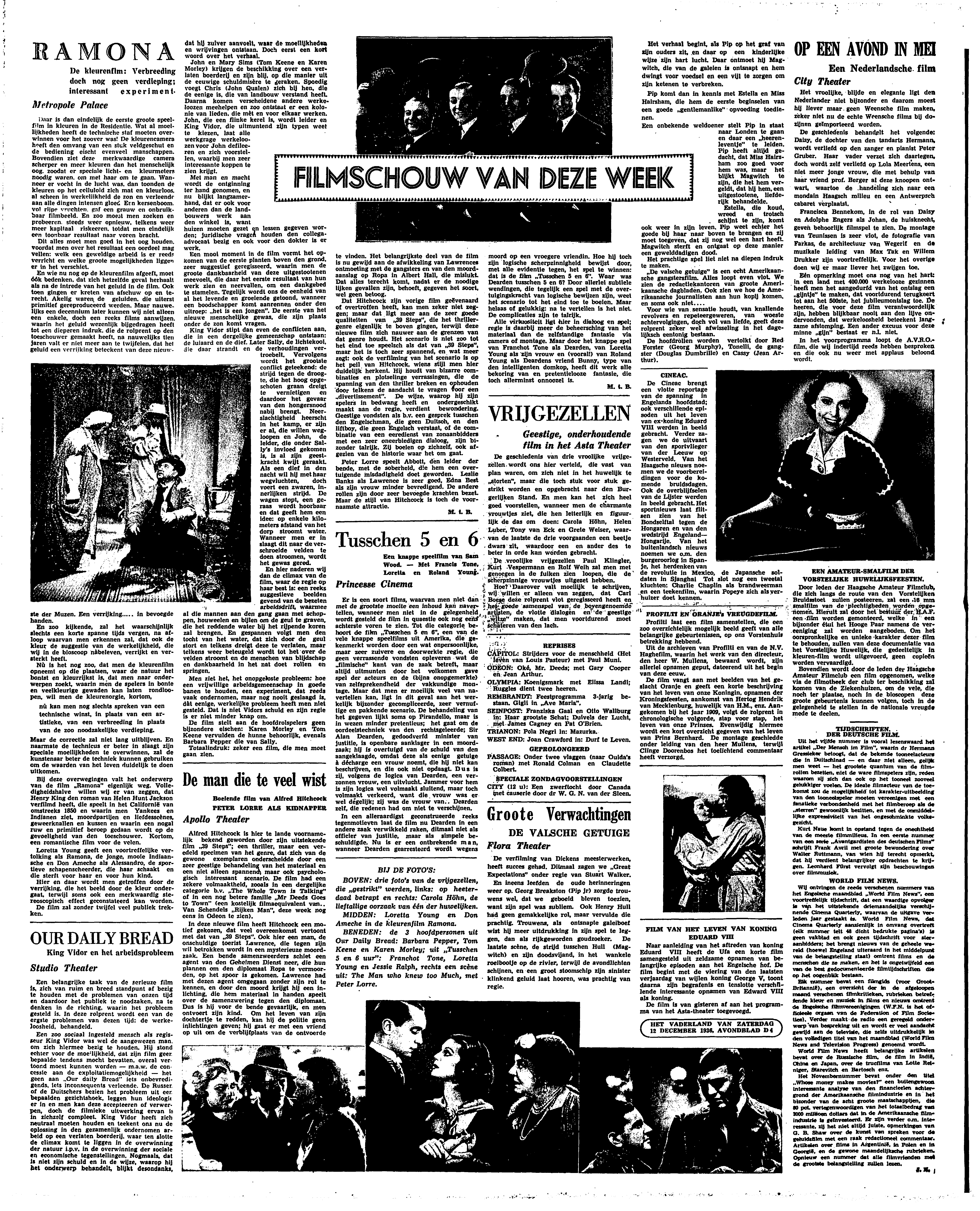 Alfred Hitchcock is hier te lande voornamelijk bekend geworden door zijn uitstekende film ‘39 Steps’; een thriller, maar een veredeld specimen van het genre, dat zich van de gewone exemplaren onderscheidde door een zeer geestige behandeling van het materiaal en een niet alleen spannend, maar ook psychologisch interessant scenario. De film had een zekere volmaaktheid, zooals in een dergelijke categorie b.v. ‘The Whole Town is Talking’ of in een nog betere familie ‘Mr Deeds Goes to Town’ (een kostelijk filmaequivalent van.. Van Schendels ‘Rijken Man’, deze week nog eens in Odeon te zien).