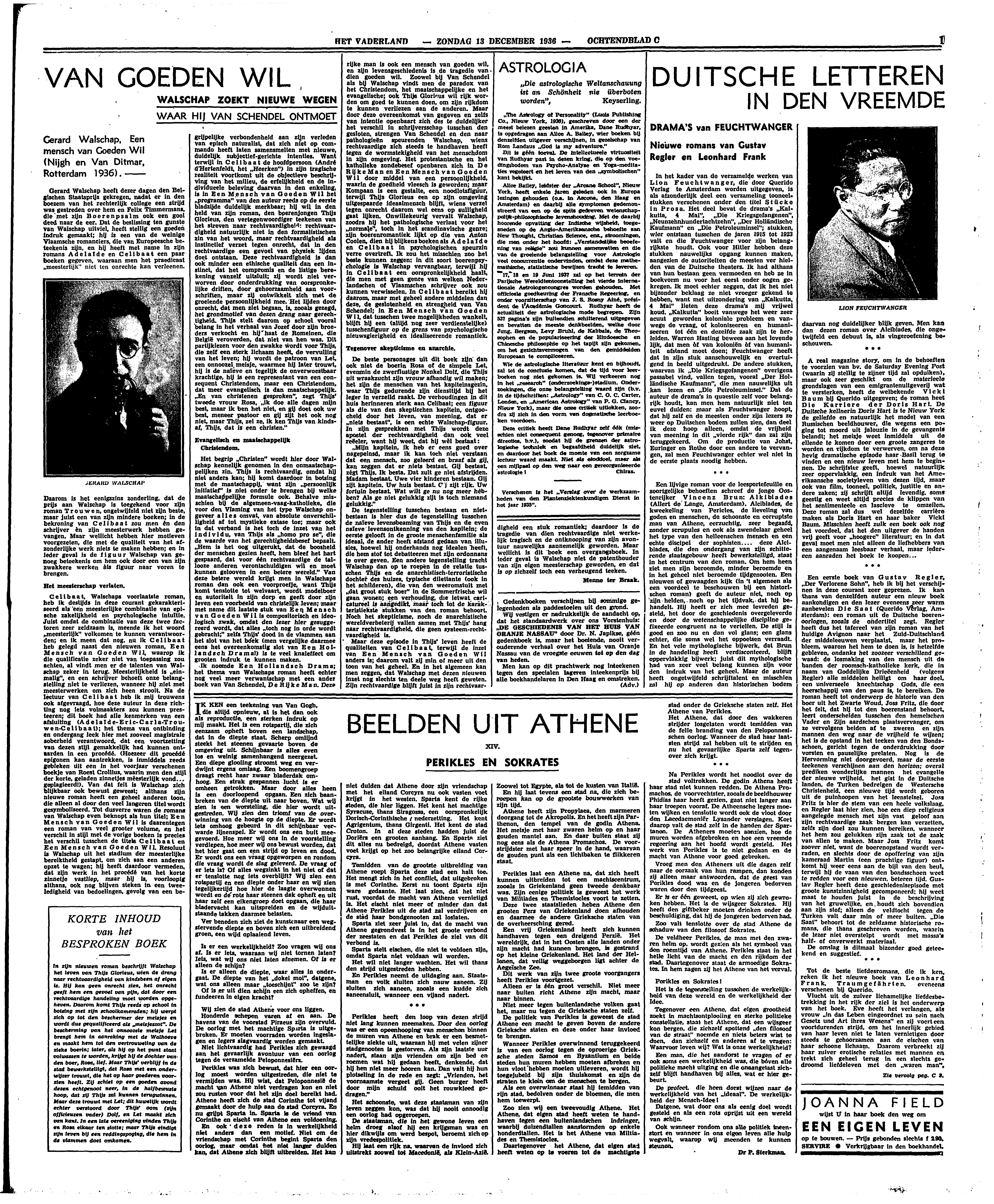 Gerard Walschap heeft dezer dagen den Belgischen Staatsprijs gekregen, nadat er in den boezem van het rechterlijk college een strijd was gestreden over hem en Felix Timmermans, die met zijn Boerenpsalm ook een gooi deed naar de eer. Dat de beslissing ten gunste van Walschap uitviel, heeft stellig een goeden indruk gemaakt; hij is een van de weinige Vlaamsche romanciers, die van Europeesche beteekenis zijn, en hij heeft met name in zijn romans Adelaide en Celibaat een paar boeken gegeven, waaraan men het praedicaat ‘meesterlijk’ niet ten onrechte kan verleenen. Daarom is het eenigszins zonderling, dat de prijs aan Walschap is toegekend voor zijn roman Trouwen, ongetwijfeld niet zijn beste, maar Juist een van zijn mindere boeken; in de bekroning van Celibaat zou men èn den schrijver èn zijn meesterwerk hebben gevangen. Maar wellicht hebben hier motieven voorgezeten, die met de qualiteit van het afzonderlijke werk niets te maken hebben; en in ieder geval is de figuur Walschap van genoeg beteekenis om hem ook door een van zijn zwakkere werken àls figuur naar voren te brengen.