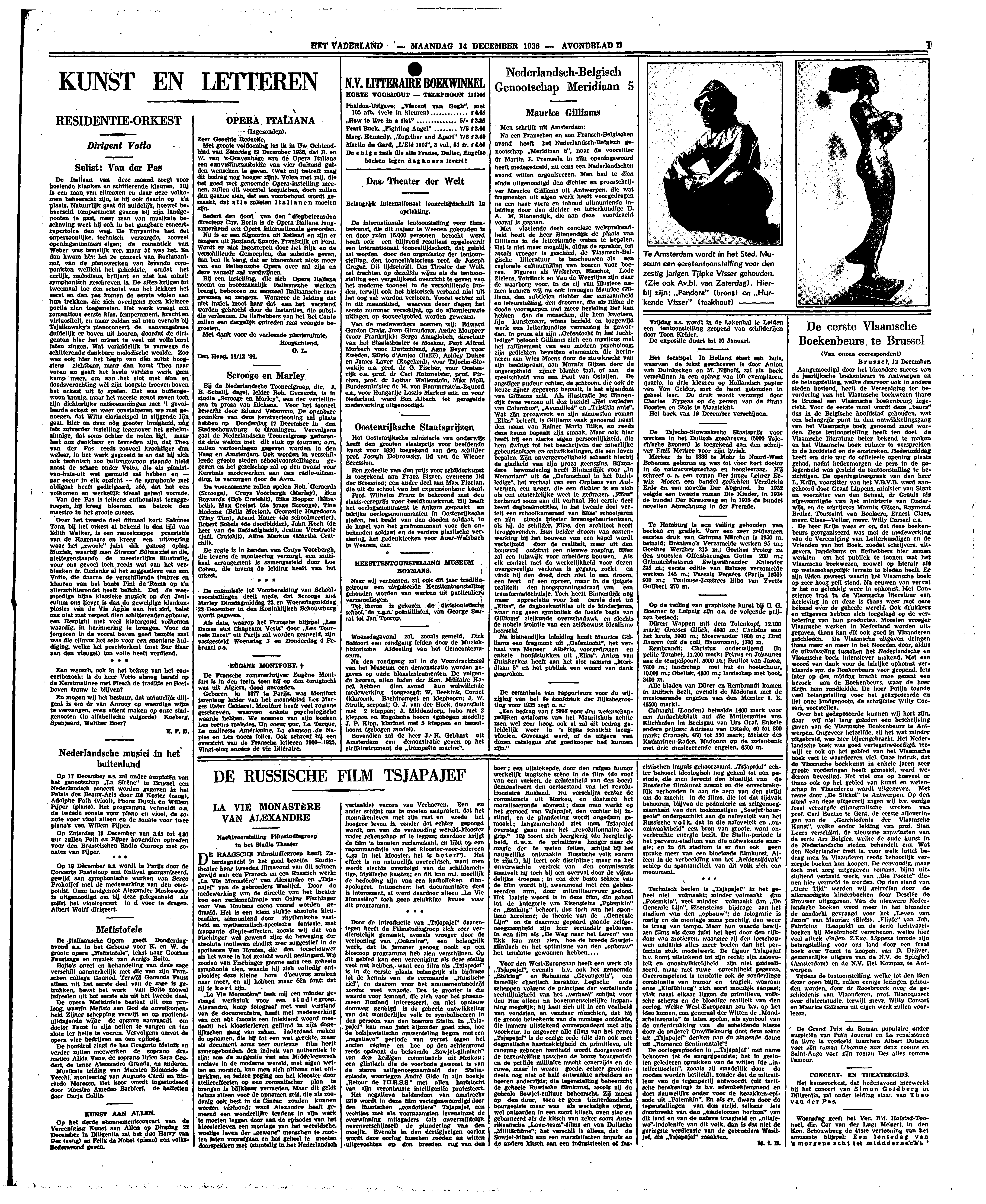 DE HAAGSCHE Filmstudiegroep heeft Zaterdagnacht in het goed bezette Studiotheater haar tweeden filmavond van dit seizoen gewijd aan een Fransch en een Russisch werk: ‘La Vie Monastère’ van Alexandre en ‘Tsjapajef’ van de gebroeders Wasiljef. Door de medewerking van de directie van het theater kon een reclamefilmpje van Oskar Fischinger voor Van Houtens cacao vooraf worden gedraaid. Het is een klein stukje absolute kleurenfilm, uitmuntend door rhythmische vastheid en mathematisch-speelsche fantasie, met frappante diepte-effecten, zooals wij dat van Fischinger wel gewend zijn; de beweging der absolute motieven eindigt zeer suggestief in de apotheose Van Houten, die den toeschouwer als het ware in het gezicht wordt geslingerd. Wij zouden van Fischinger gaarne eens een geheele symphonie zien, waarin hij zich volledig ontplooide; deze kleine hors d'oeuvres smaken naar meer, en zij hebben maar één fout: dat zij te kort zijn.