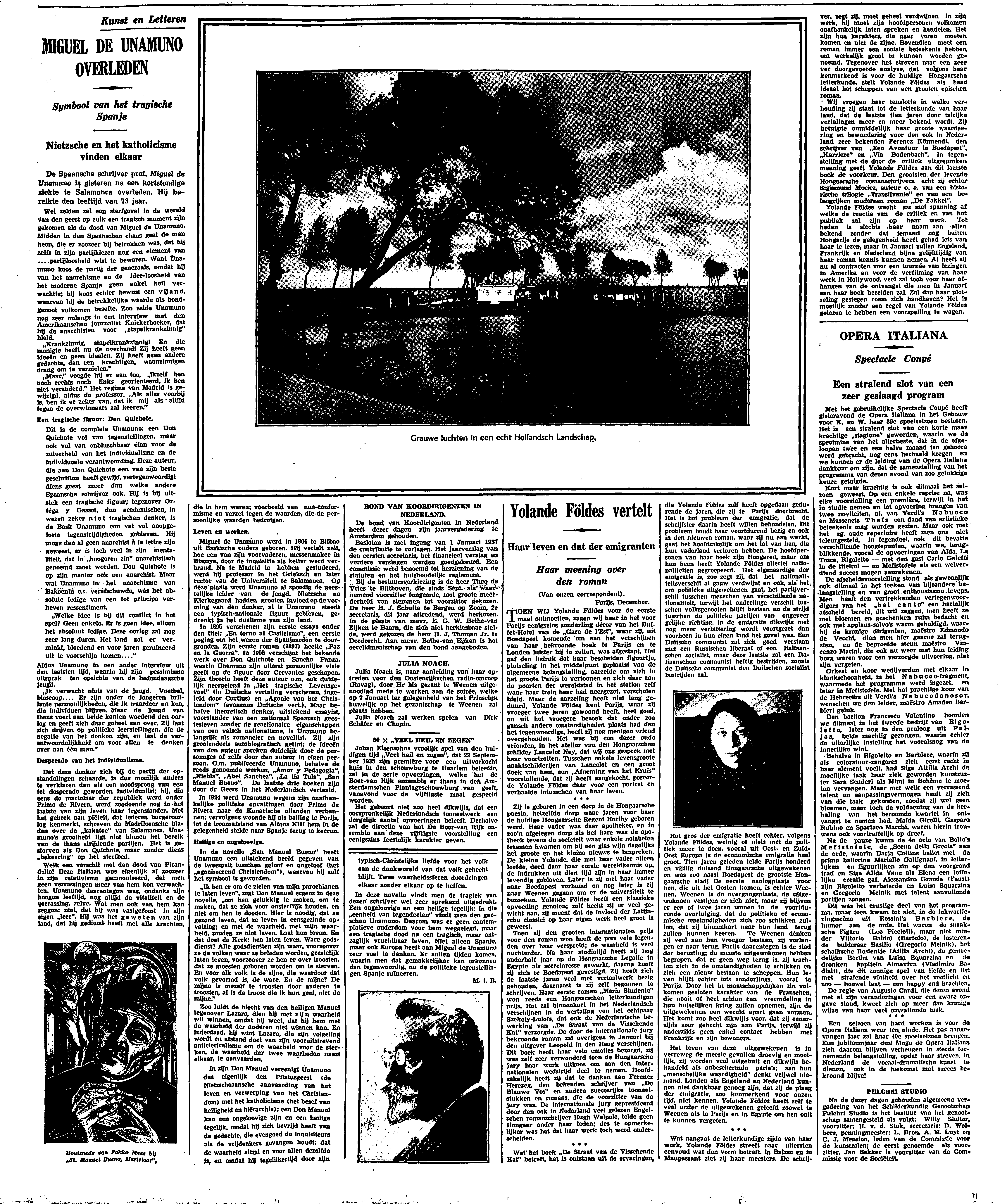 Wel zelden zal een sterfgeval in de wereld van den geest op zulk een tragisch moment zijn gekomen als de dood van Miguel de Unamuno. Midden in den Spaanschen chaos gaat de man heen, die er zoozeer bij betrokken was, dat hij zelfs in zijn partijkiezen nog een element van ....partijloosheid wist te bewaren. Want Unamuno koos de partij der generaals, omdat hij van het anarchisme en de idee-loosheid van het moderne Spanje geen enkel heil verwachtte; hij koos echter bewust een vijand, waarvan hij de betrekkelijke waarde als bondgenoot volkomen besefte. Zoo zeide Unamuno nog zeer onlangs in een interview met den Amerikaanschen journalist Knickerbocker, dat hij de anarchisten voor ‘stapelkrankzinnig’ hield.